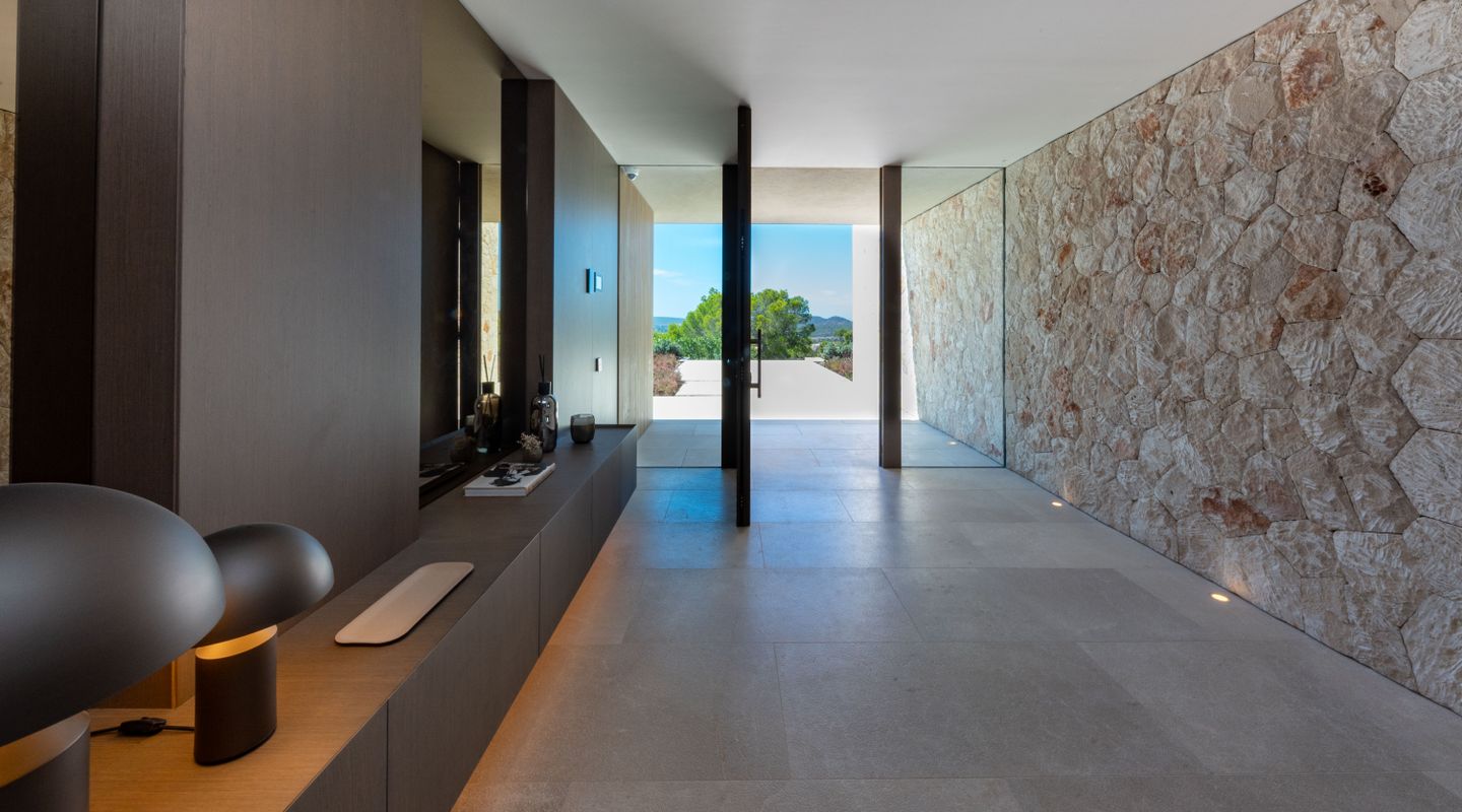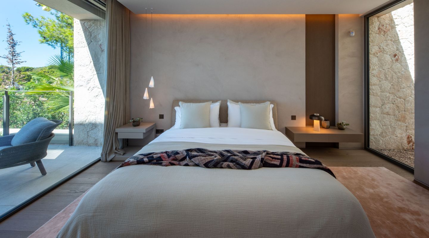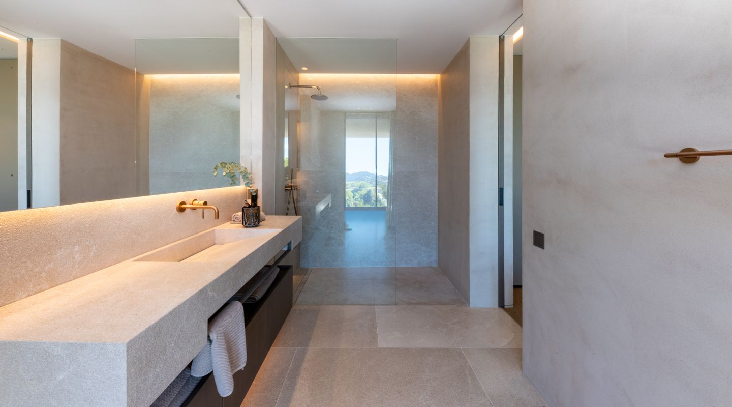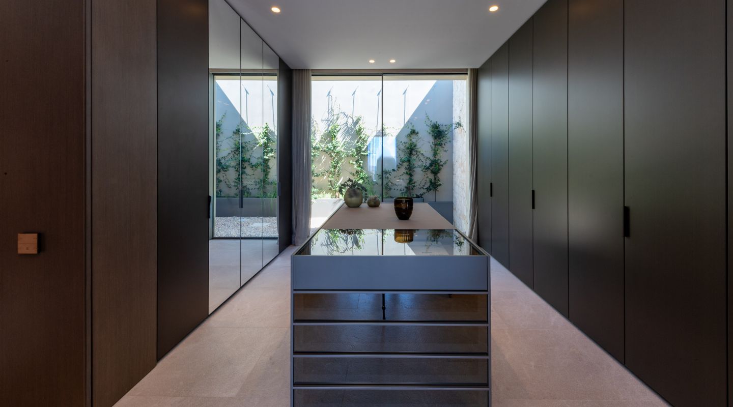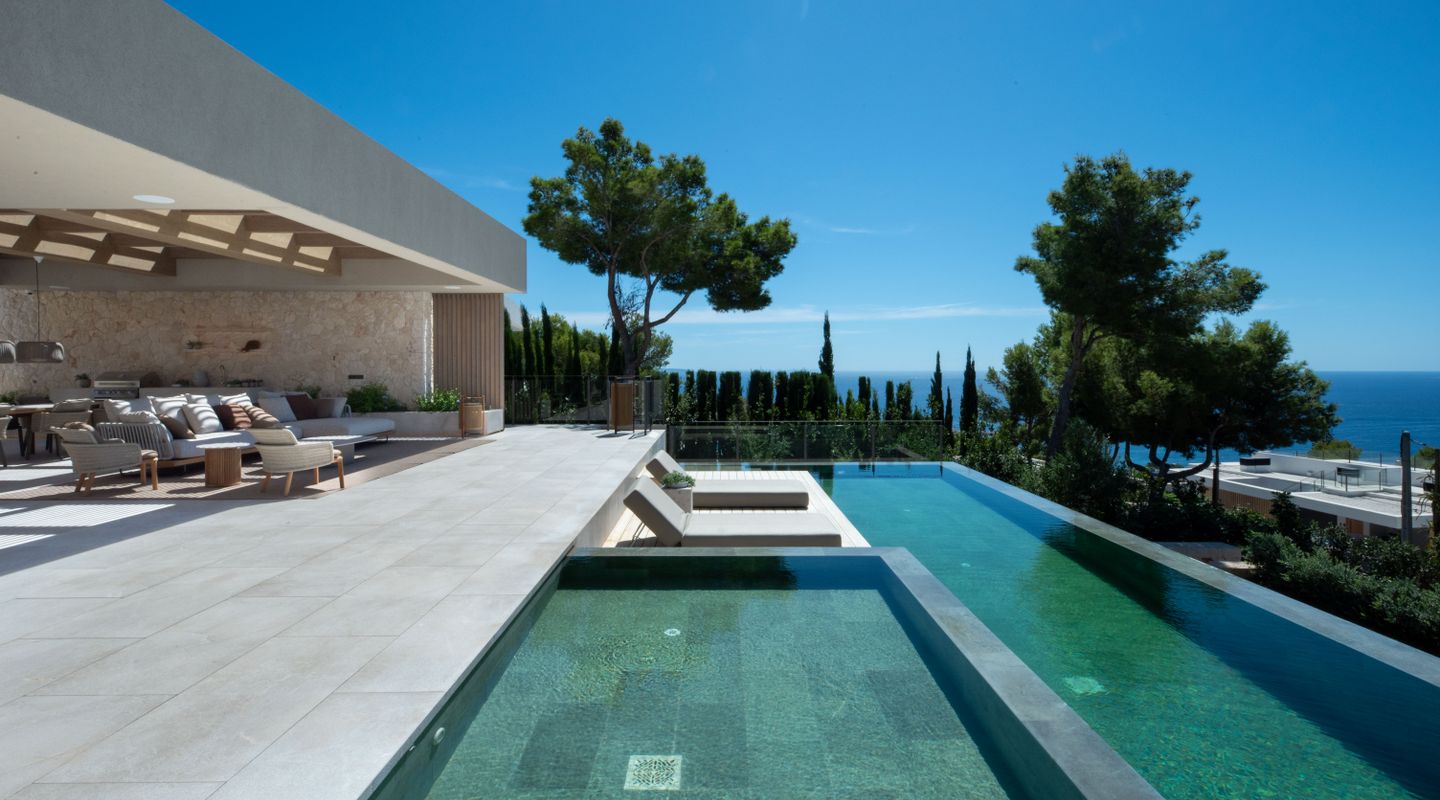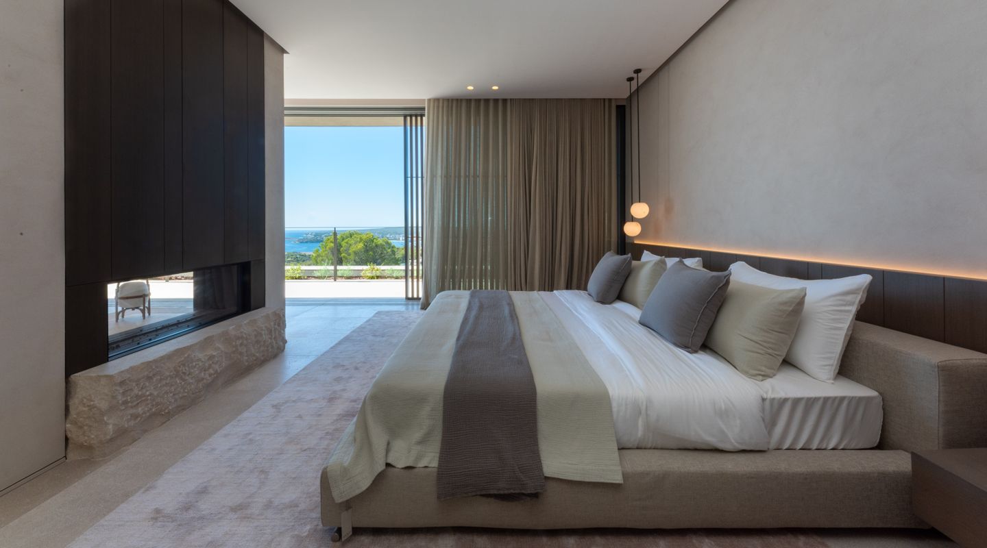 Carefully crafted and constructed by one of the most reputable companies on the island, this property is spread over three levels offering the following distribution: entry by car is a marvellous experience, directly into the 235m2 garage with space for over 6 cars and access via a luxury foyer into the villa. On this same level there is a home cinema, staff bedroom ensuite, generous laundry room, technical room, stairs and a lift to all levels. The next level where the main guest entrance invites into an impressive reception area with a feature staircase leading upstairs, 3 generous ensuite double bedrooms, a master suite with dressing room and a private terrace, a relaxing area, an office, an interior patio and the spa area with gym/yoga room, jacuzzi, sauna and a bathroom, complete this area of the property. Upstairs on the top floor level is the main living room with a double sided fireplace, a dining area, a reading corner and an incredible Poliform kitchen where the doors slide into the walls inviting the sea views and breeze into the villa as it becomes one with the terrace and swimming pool. In addition there is a prep kitchen, a summer kitchen, a beautiful water feature with olive trees, a dining area and relaxing exterior lounge, all enjoying wonderful sea and landscape views across the infinity swimming pool. The main master bedroom suite with an adjoining living room and fireplace, a luxury dressing room, private terrace is well appointed on this level ensuring a very comfortable lifestyle. Beautifully landscaped gardens and level lawns surround the villa creating an oasis of peace and tranquility.