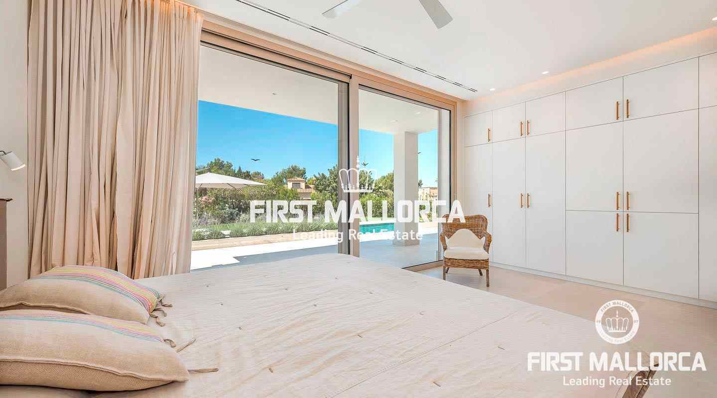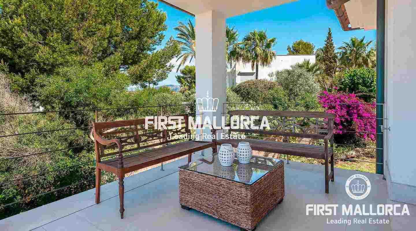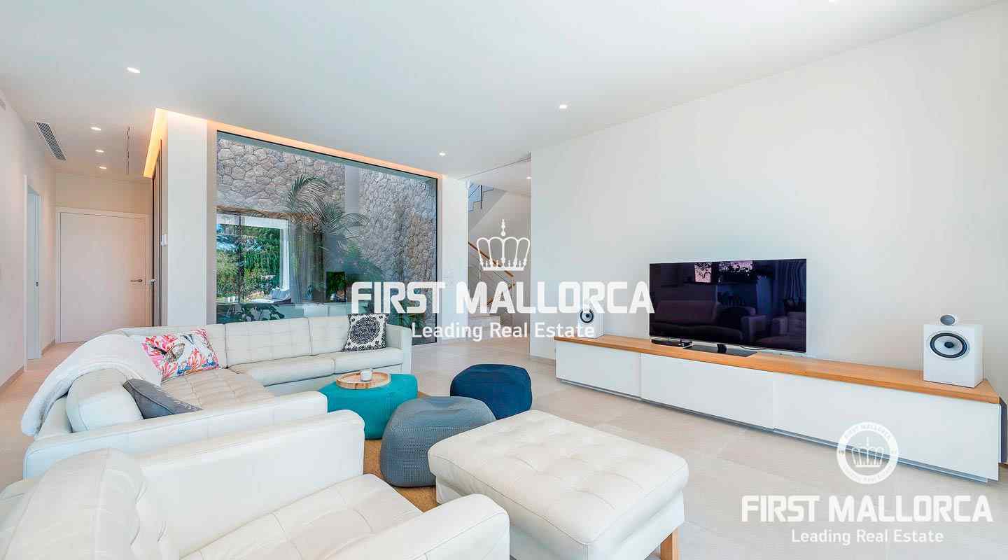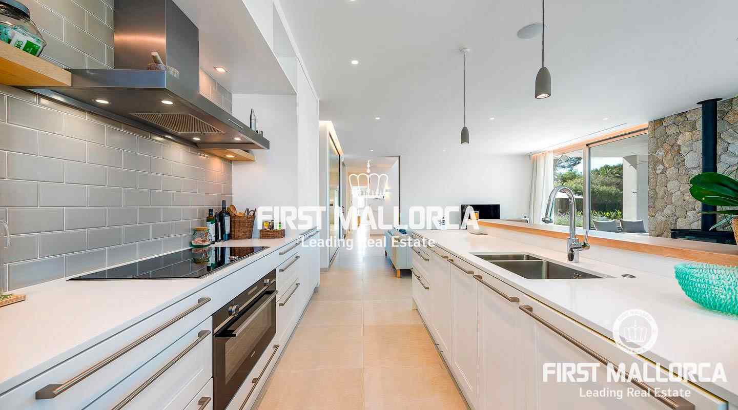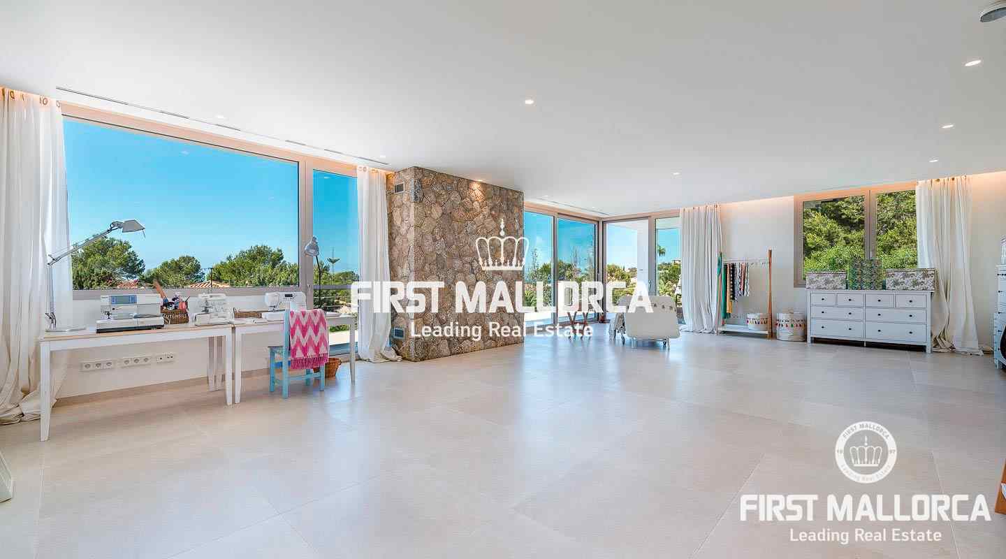 This modern Mediterranean style villa is located in one of the most sought-after locations in Nova Santa Ponsa and was built with the highest standards and the best qualities. The family villa has a flat garden, which is perfect for children. Natural stone elements on the façade give the modern and bright villa a Mediterranean flair. The ground floor offers an open plan kitchen by Birgit Müller and direct access to the living area. The house offers the latest pump technology, salt water, counter current system, a sun platform in the water as well as mother of pearl tiles. The upper floor currently offers two very nice bedrooms and a bathroom as well as a very large room, which is currently designed as an art studio, but it could be converted into another two bedrooms with bathroom or a very spacious master suite with dressing room and bathroom - here you have a great view over the landscape up to the mountains and even to the bay of Santa Ponsa. The excellent quality of this gem is clearly visible and will persuade any one looking for a luxury property in Mallorca.