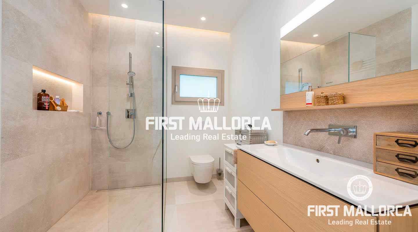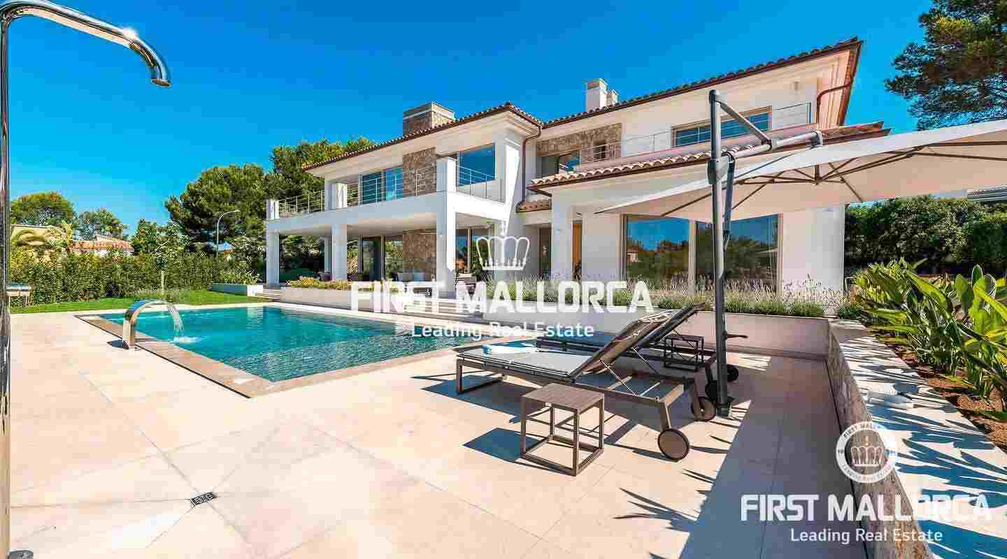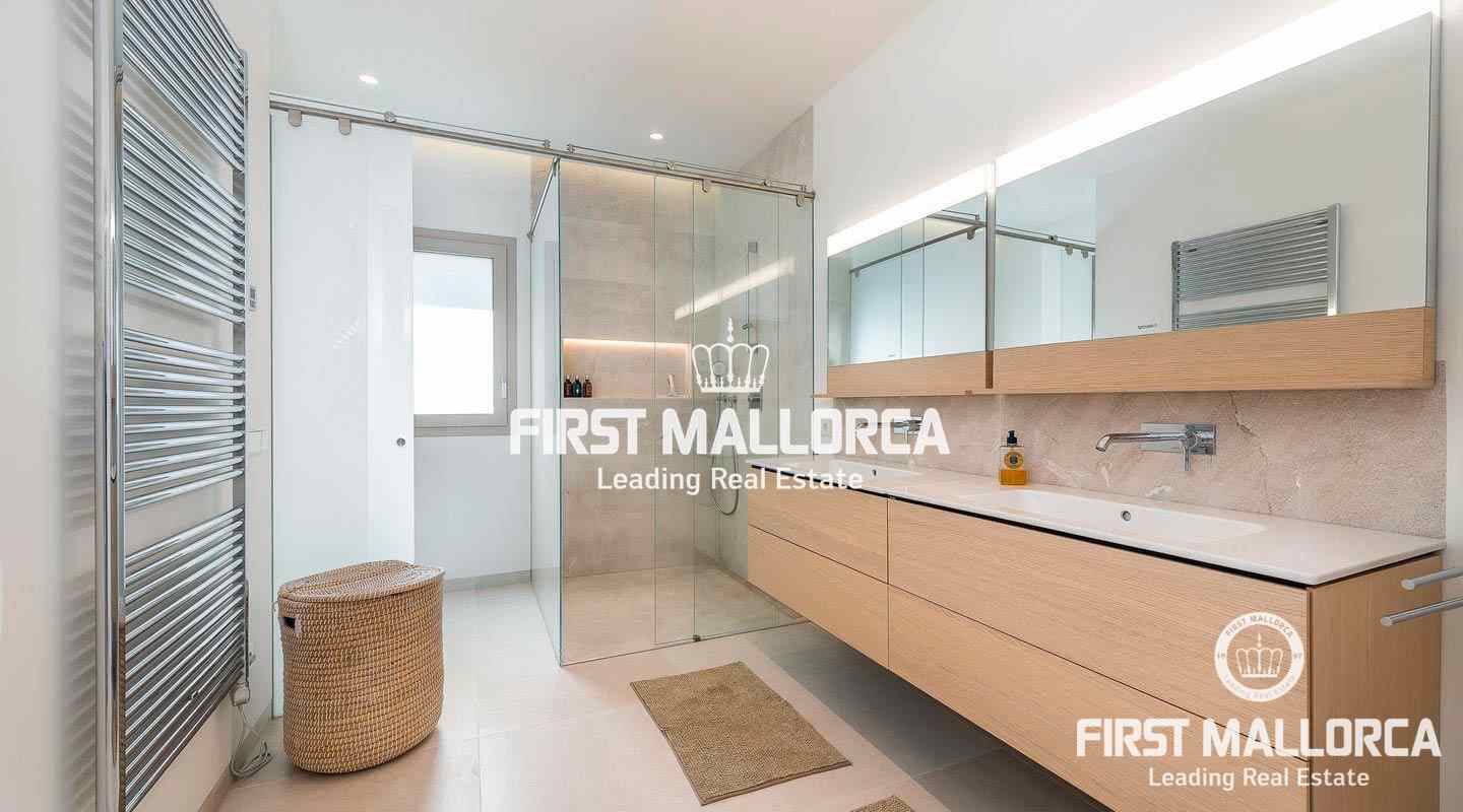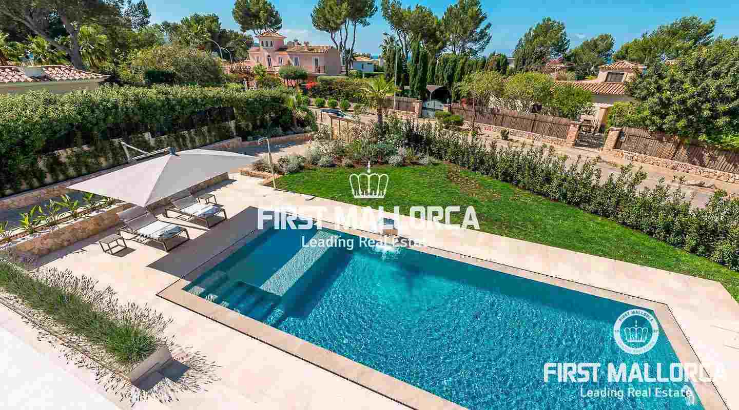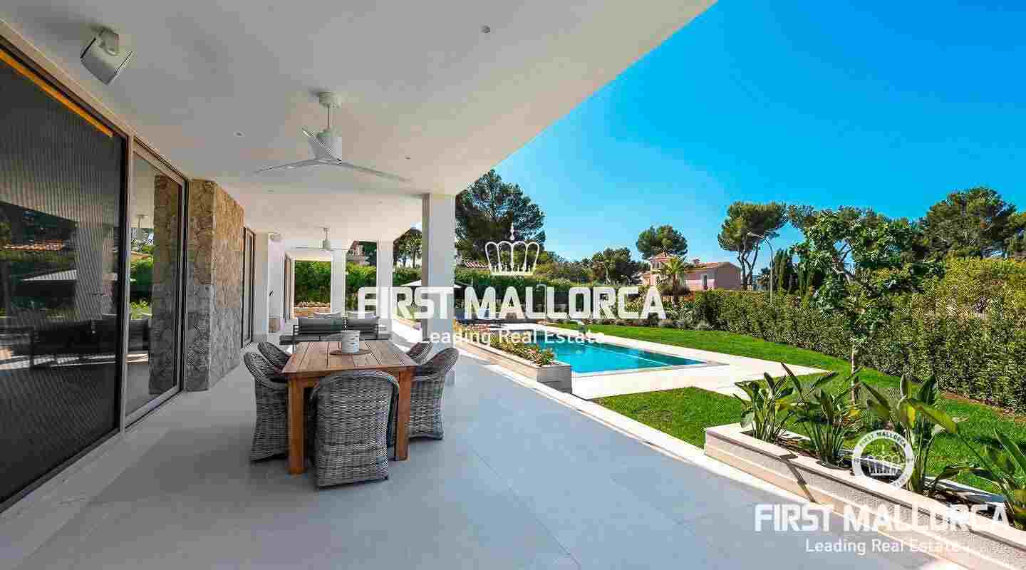 This modern Mediterranean style villa is located in one of the most sought-after locations in Nova Santa Ponsa and was built with the highest standards and the best qualities. The family villa has a flat garden, which is perfect for children. Natural stone elements on the façade give the modern and bright villa a Mediterranean flair. The ground floor offers an open plan kitchen by Birgit Müller and direct access to the living area. The house offers the latest pump technology, salt water, counter current system, a sun platform in the water as well as mother of pearl tiles. The upper floor currently offers two very nice bedrooms and a bathroom as well as a very large room, which is currently designed as an art studio, but it could be converted into another two bedrooms with bathroom or a very spacious master suite with dressing room and bathroom - here you have a great view over the landscape up to the mountains and even to the bay of Santa Ponsa. The excellent quality of this gem is clearly visible and will persuade any one looking for a luxury property in Mallorca.