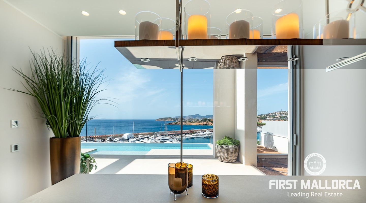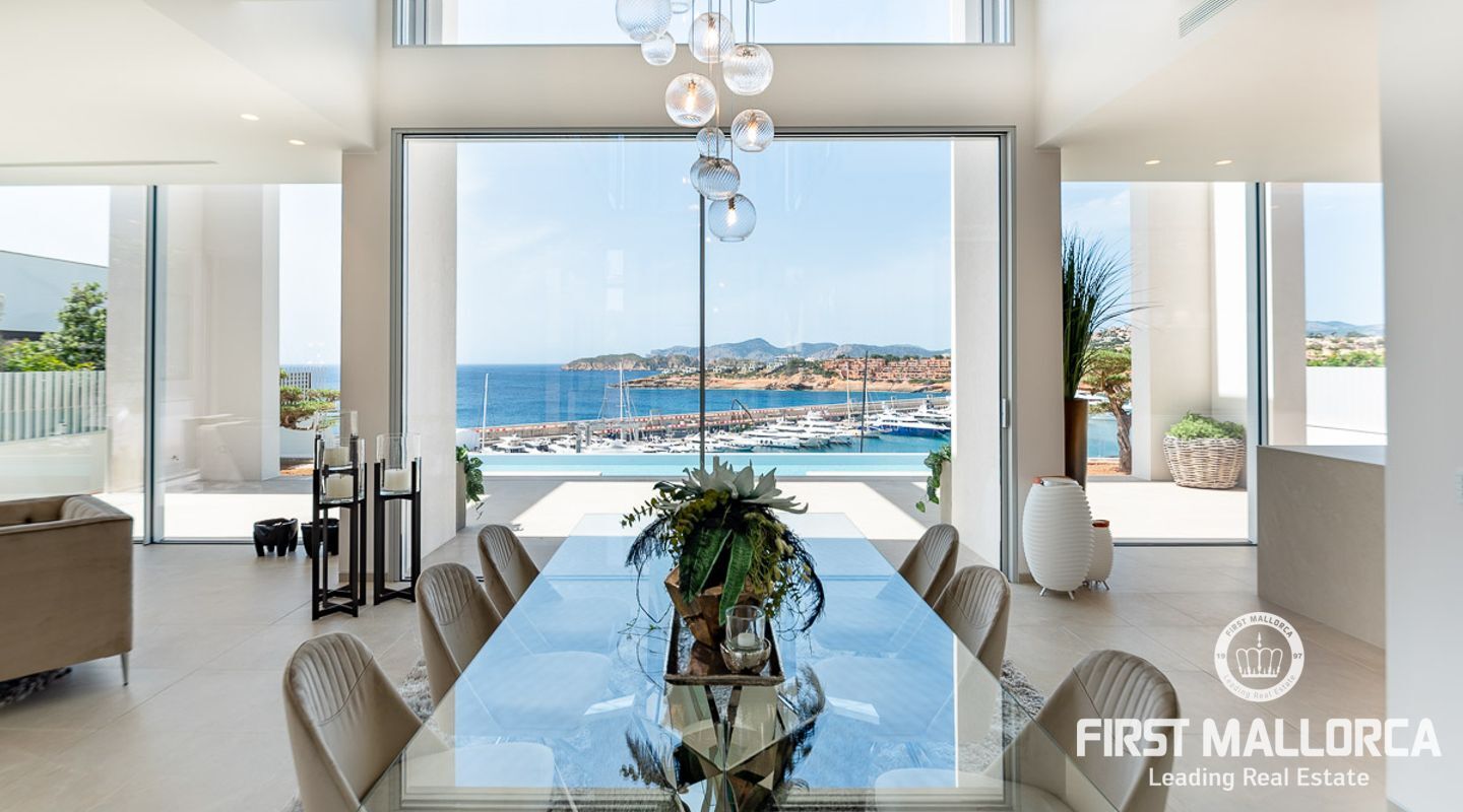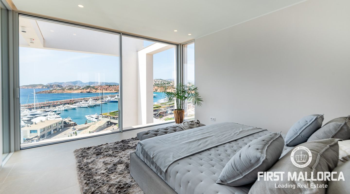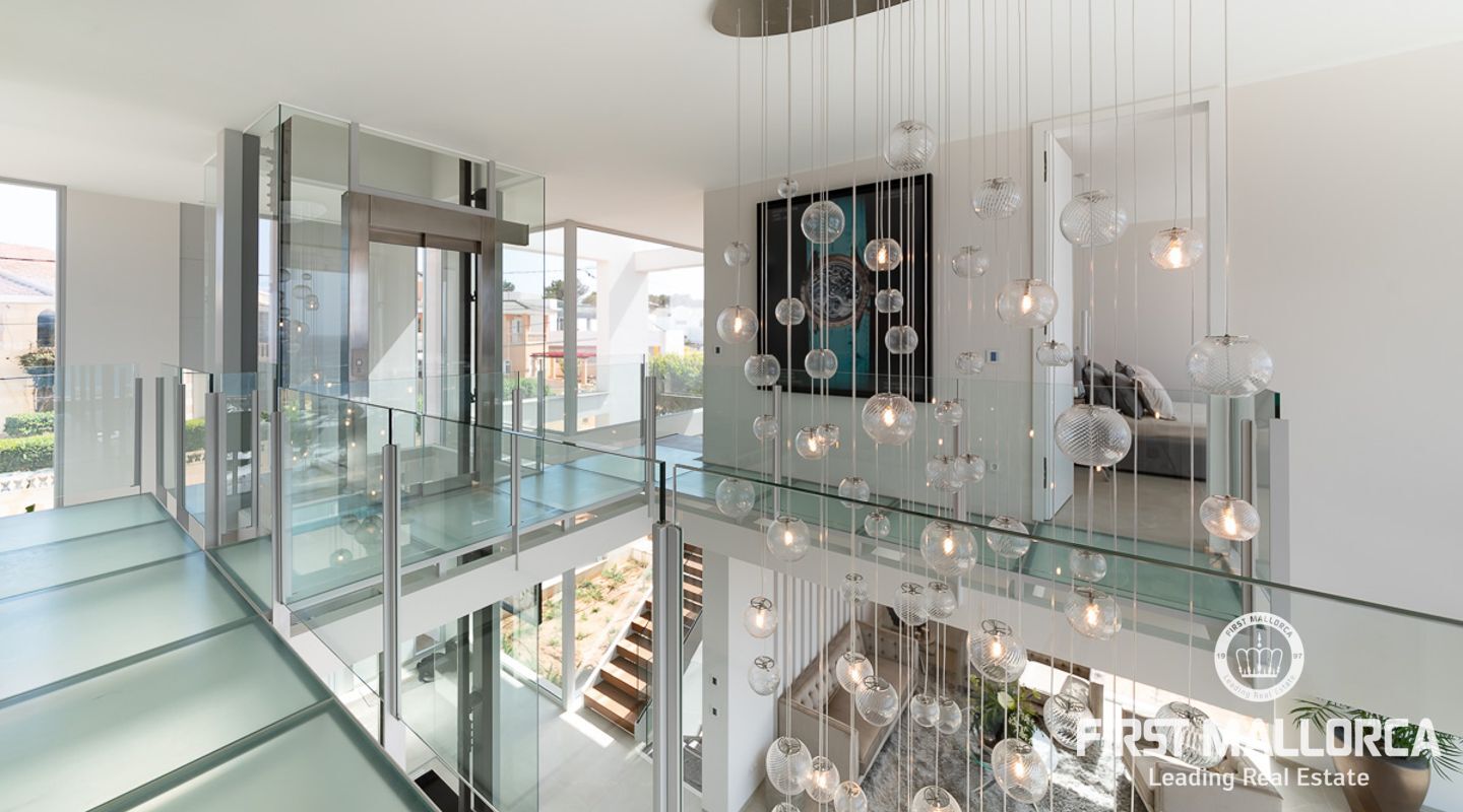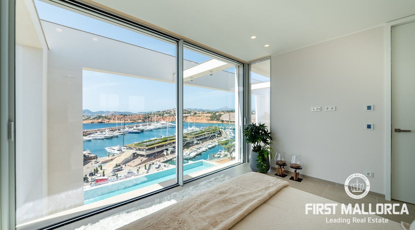 Modern designer villa with fantastic view in Port Adriano. The modern villa which offers fantastic views over the bay of Port Adriano. Port Adriano in the south-west of Mallorca is one of the most beautiful harbours in the Mediterranean, with crystalline waters and fantastic views. This project of a modern villa is realized on an 890 m2 plot, a full constructed area of 612,27 m2 plus a terrace of 100 m2 and a rooftop of 121 m2 with pool. The villa offers fantastic views of the port and the Mediterranean Sea. One of the specials of this villa is the designed entrance door and the glass lift. In total there are 4 bedrooms, 4 bathrooms, a guest bath, an open plan living/dining area with an adjoining luxury fitted kitchen, a cinema, a gym and a wardrobe. Spacious open and covered terraces and the large pool guarantee a comfortable relaxing area for several people.