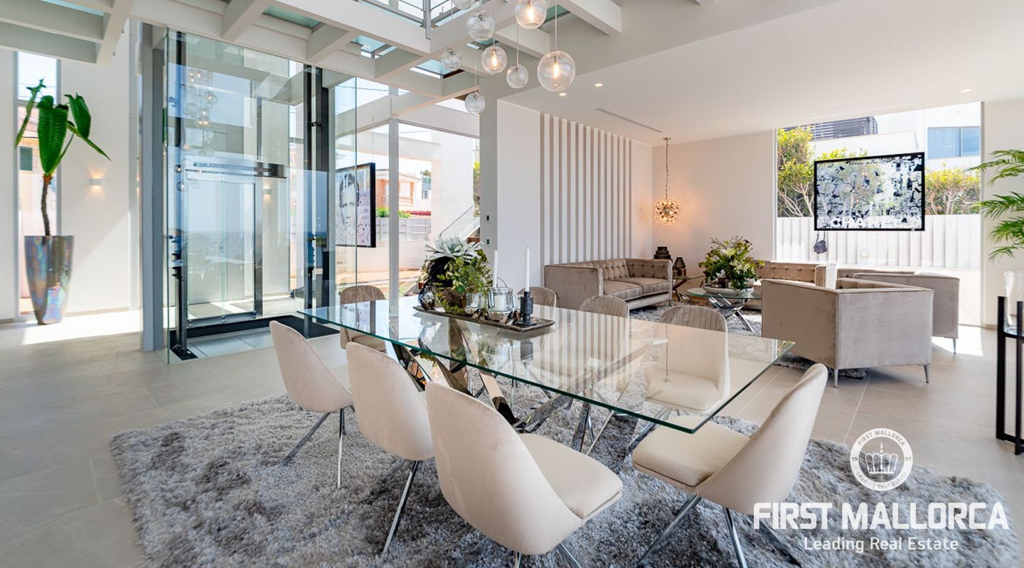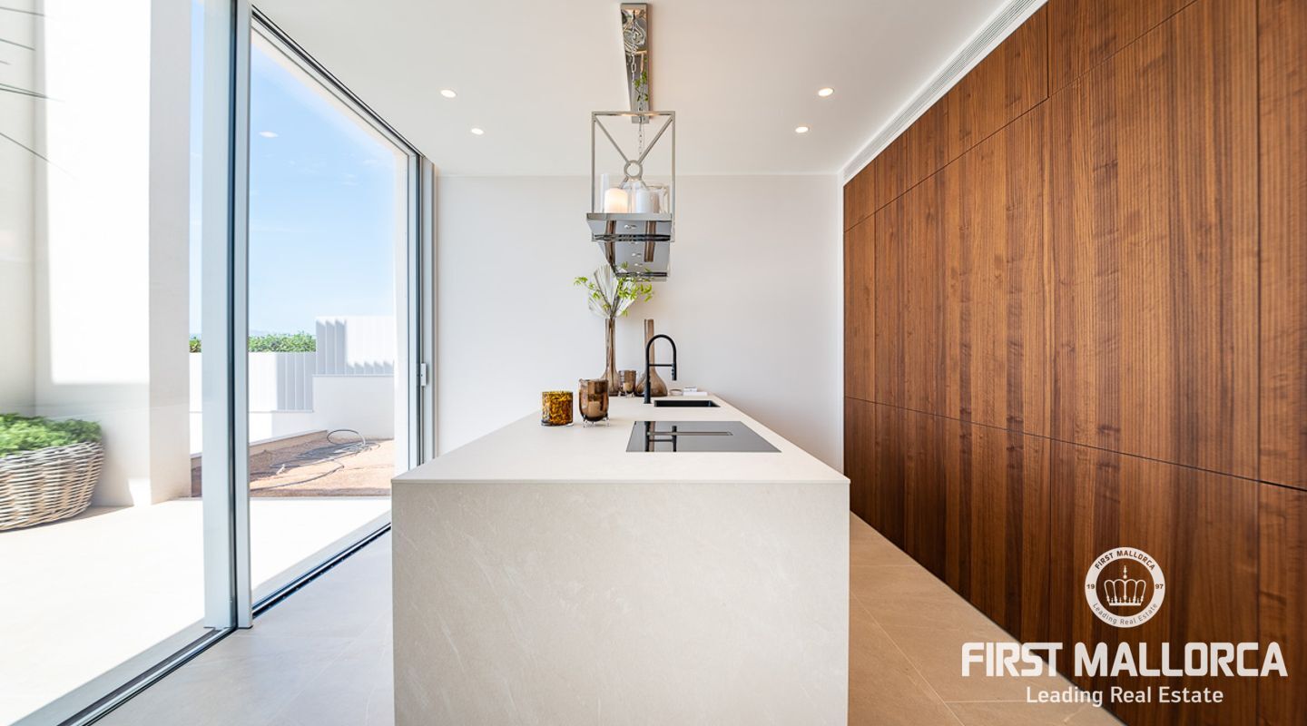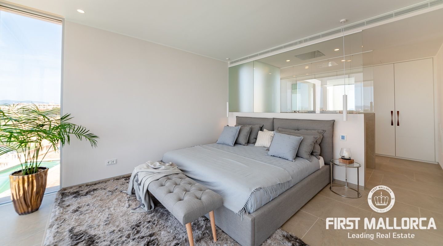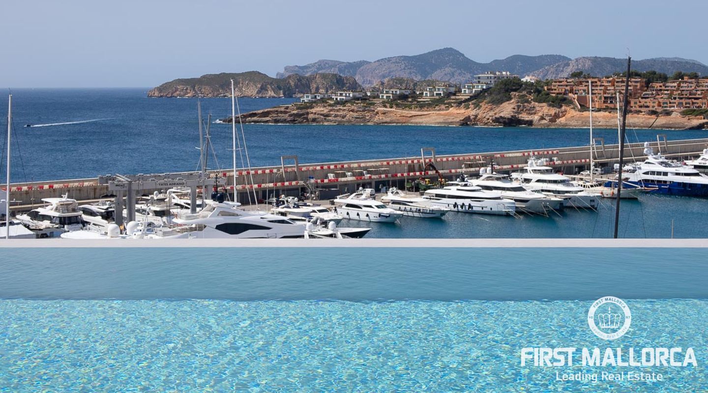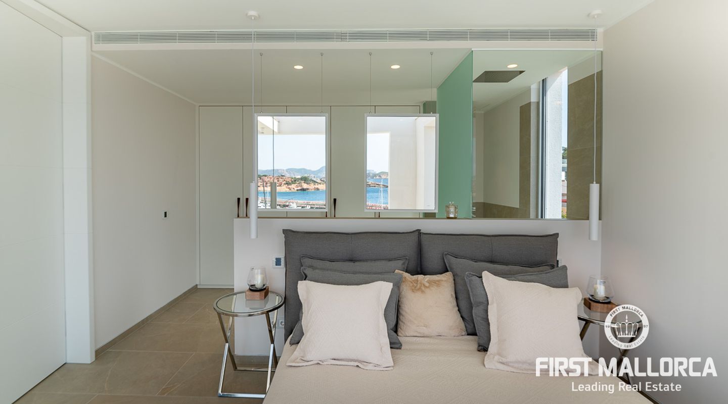 Modern designer villa with fantastic view in Port Adriano. The modern villa which offers fantastic views over the bay of Port Adriano. Port Adriano in the south-west of Mallorca is one of the most beautiful harbours in the Mediterranean, with crystalline waters and fantastic views. This project of a modern villa is realized on an 890 m2 plot, a full constructed area of 612,27 m2 plus a terrace of 100 m2 and a rooftop of 121 m2 with pool. The villa offers fantastic views of the port and the Mediterranean Sea. One of the specials of this villa is the designed entrance door and the glass lift. In total there are 4 bedrooms, 4 bathrooms, a guest bath, an open plan living/dining area with an adjoining luxury fitted kitchen, a cinema, a gym and a wardrobe. Spacious open and covered terraces and the large pool guarantee a comfortable relaxing area for several people.