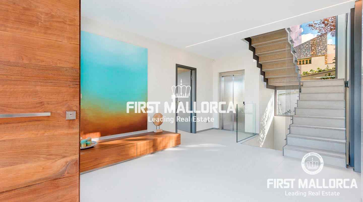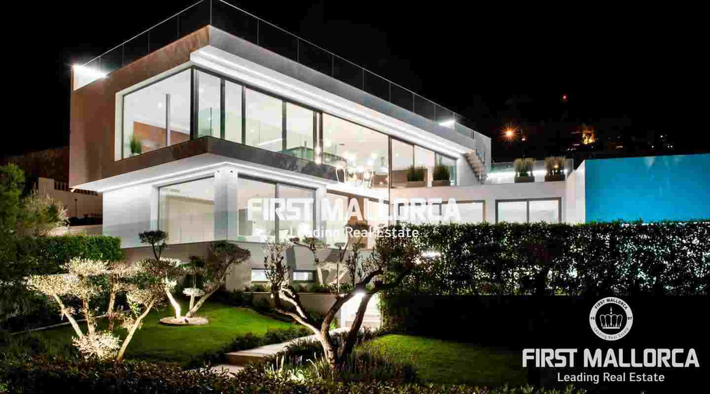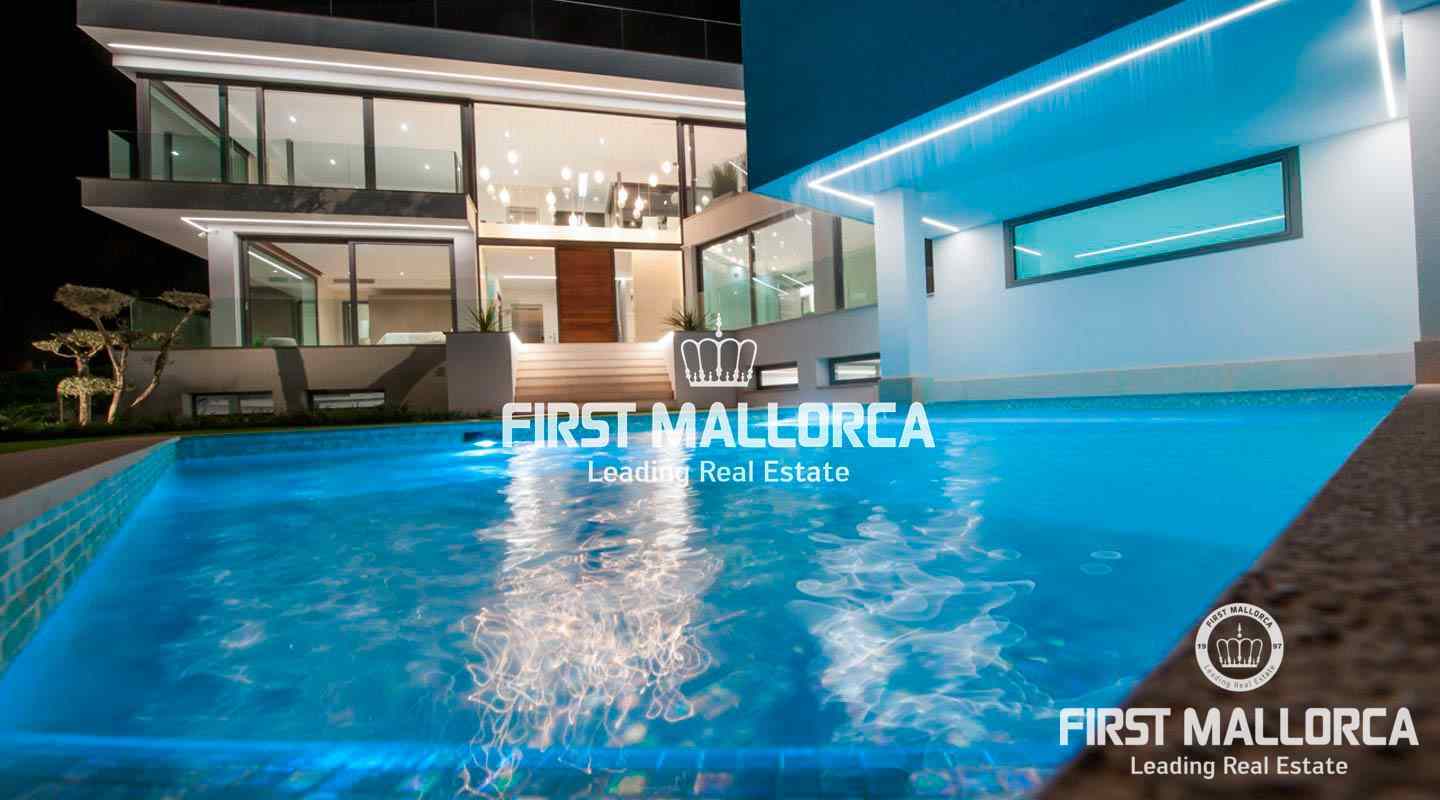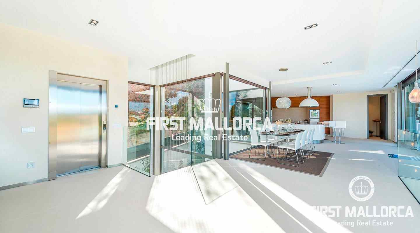 This impressive newly constructed villa with sea views is built on a 1.275m2 plot in a quiet residential street in Nova Santa Ponsa. In total, this luxury property has a first-class design, 5 bedrooms on the entrance level, all with en suite bathrooms. The elevator which is also connected to the garage, takes you to the main living area with a generous outdoor area and a beautiful sea and panoramic view. Each level has its own pool, with the upper one cascading into the lower part. Furthermore, a roof terrace of 153m2 invites you to sunbath as you enjoy a 360 degree view over the sea and mountains. In the basement there is a guest apartment as well as two car places, a Spa area with a fitness room, heated indoor pool, sauna and much more where one can relax and enjoy. Features of this fantastic modern design villa are: Underfloor heating, air conditioning hot/cold, aluminum windows with double glazing, garage, gas fireplace, domotic system, alarm, video system, elevator and a barbecue.