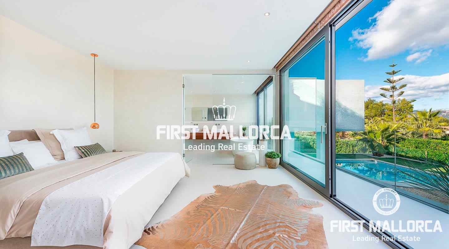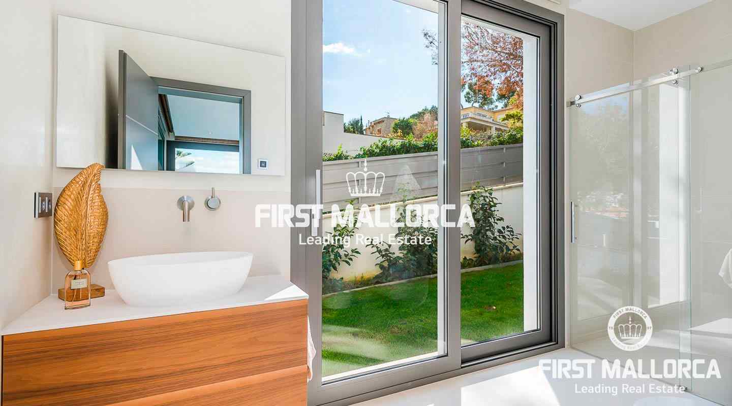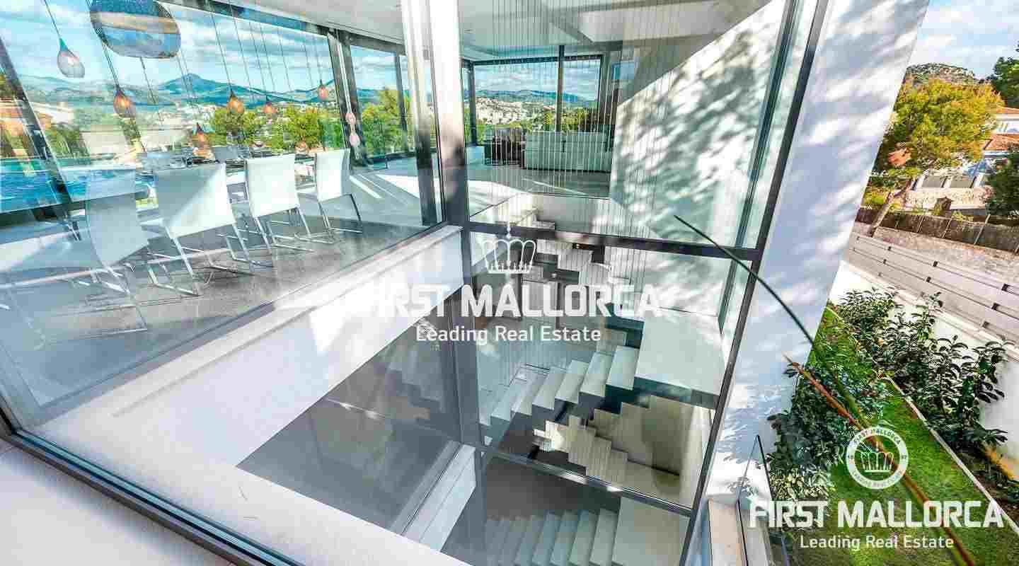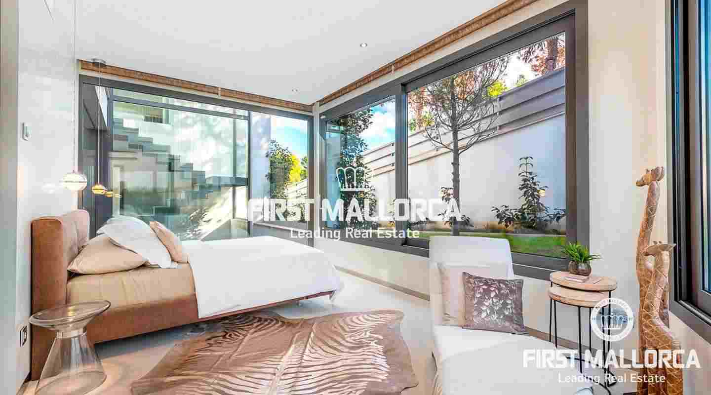 This impressive newly constructed villa with sea views is built on a 1.275m2 plot in a quiet residential street in Nova Santa Ponsa. In total, this luxury property has a first-class design, 5 bedrooms on the entrance level, all with en suite bathrooms. The elevator which is also connected to the garage, takes you to the main living area with a generous outdoor area and a beautiful sea and panoramic view. Each level has its own pool, with the upper one cascading into the lower part. Furthermore, a roof terrace of 153m2 invites you to sunbath as you enjoy a 360 degree view over the sea and mountains. In the basement there is a guest apartment as well as two car places, a Spa area with a fitness room, heated indoor pool, sauna and much more where one can relax and enjoy. Features of this fantastic modern design villa are: Underfloor heating, air conditioning hot/cold, aluminum windows with double glazing, garage, gas fireplace, domotic system, alarm, video system, elevator and a barbecue.