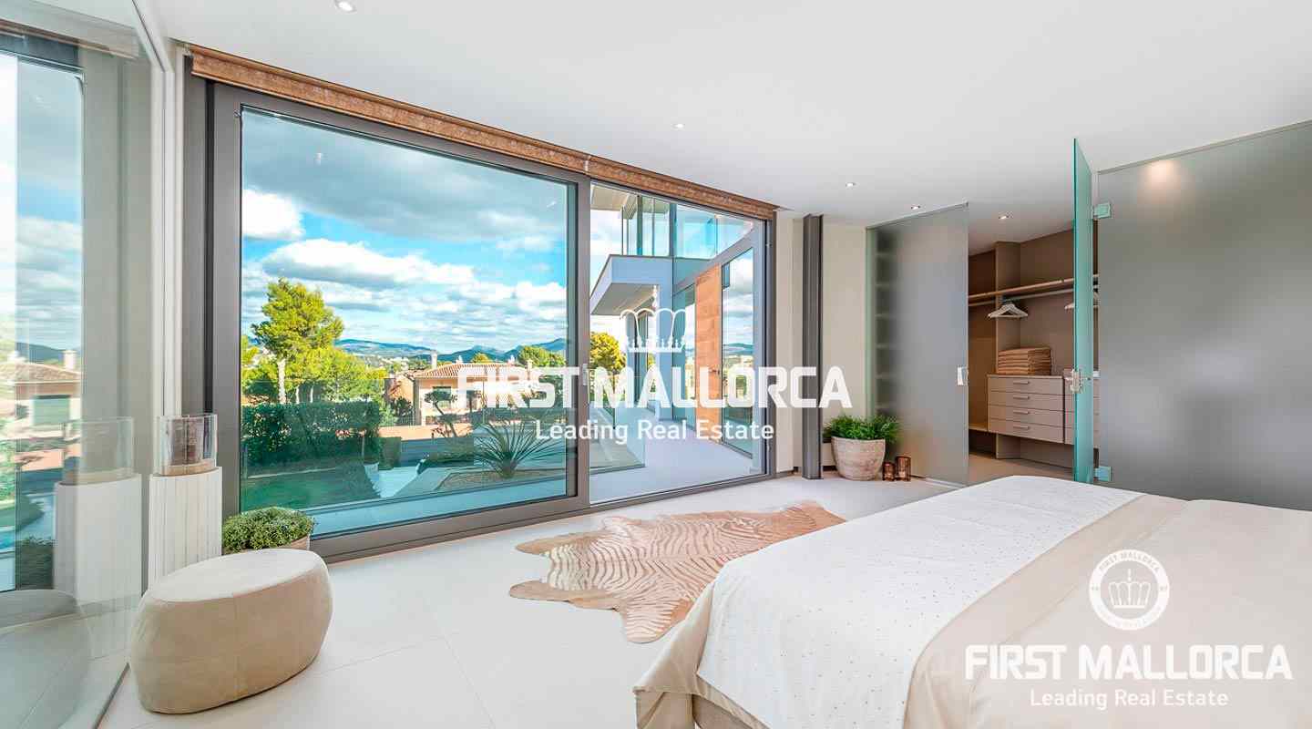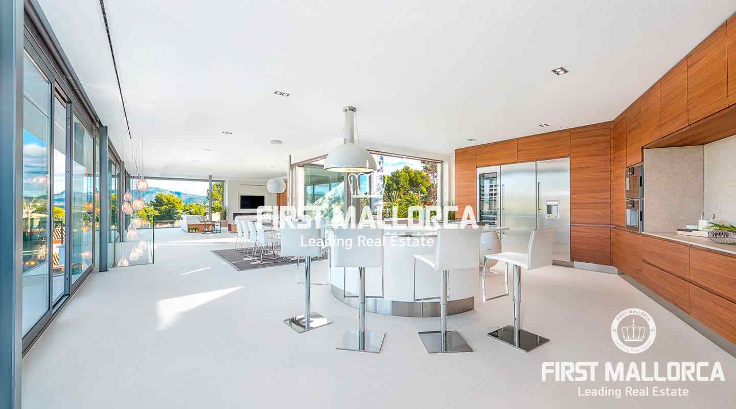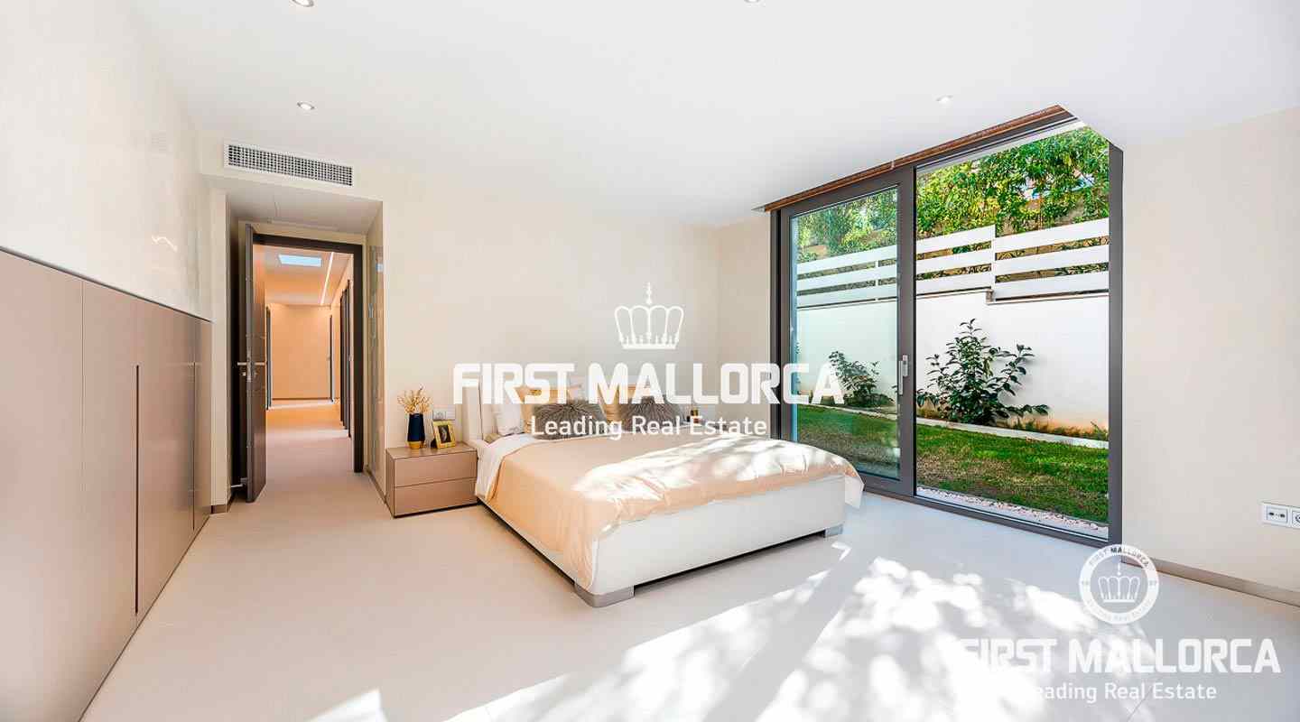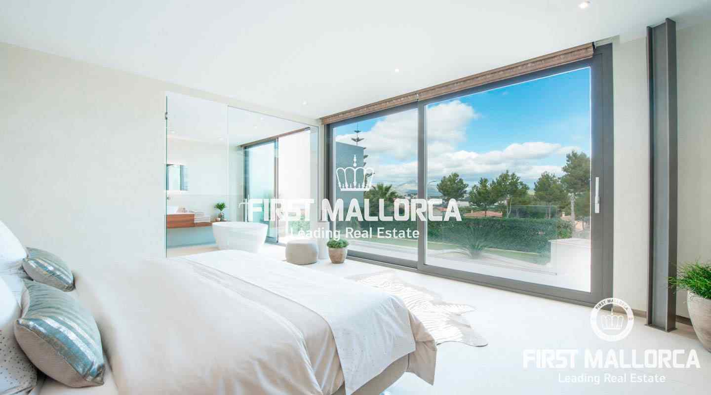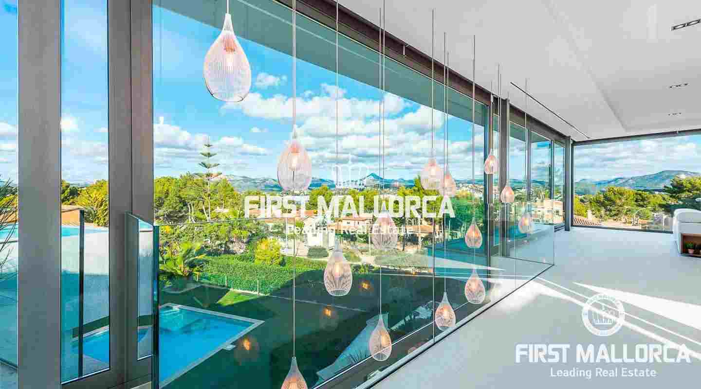 This impressive newly constructed villa with sea views is built on a 1.275m2 plot in a quiet residential street in Nova Santa Ponsa. In total, this luxury property has a first-class design, 5 bedrooms on the entrance level, all with en suite bathrooms. The elevator which is also connected to the garage, takes you to the main living area with a generous outdoor area and a beautiful sea and panoramic view. Each level has its own pool, with the upper one cascading into the lower part. Furthermore, a roof terrace of 153m2 invites you to sunbath as you enjoy a 360 degree view over the sea and mountains. In the basement there is a guest apartment as well as two car places, a Spa area with a fitness room, heated indoor pool, sauna and much more where one can relax and enjoy. Features of this fantastic modern design villa are: Underfloor heating, air conditioning hot/cold, aluminum windows with double glazing, garage, gas fireplace, domotic system, alarm, video system, elevator and a barbecue.