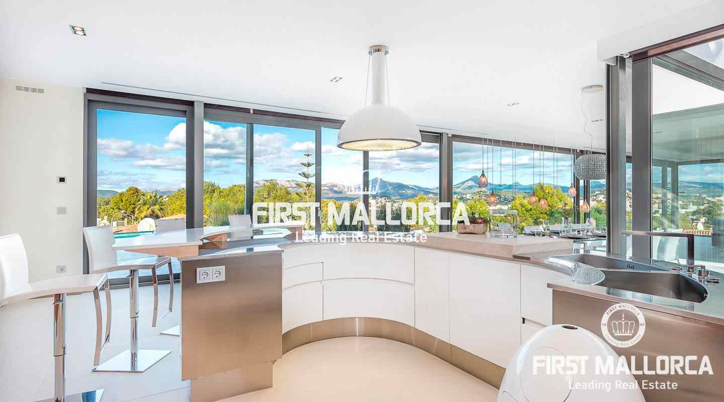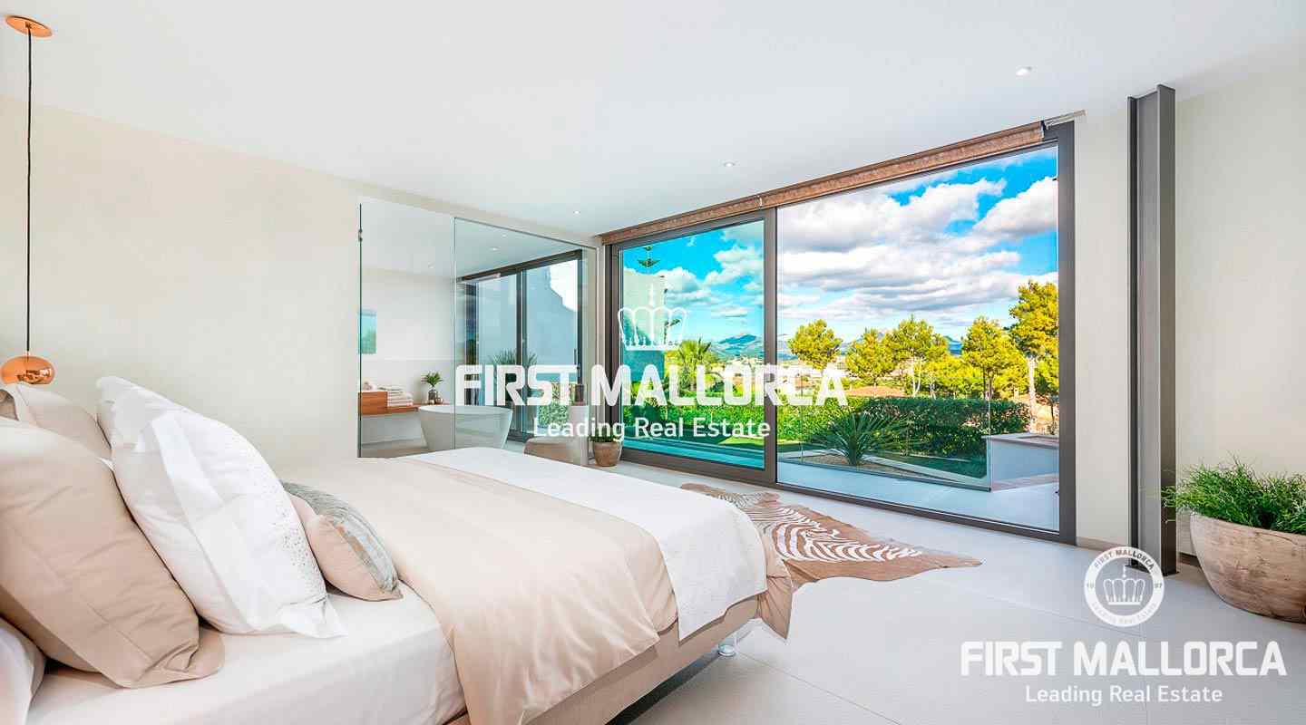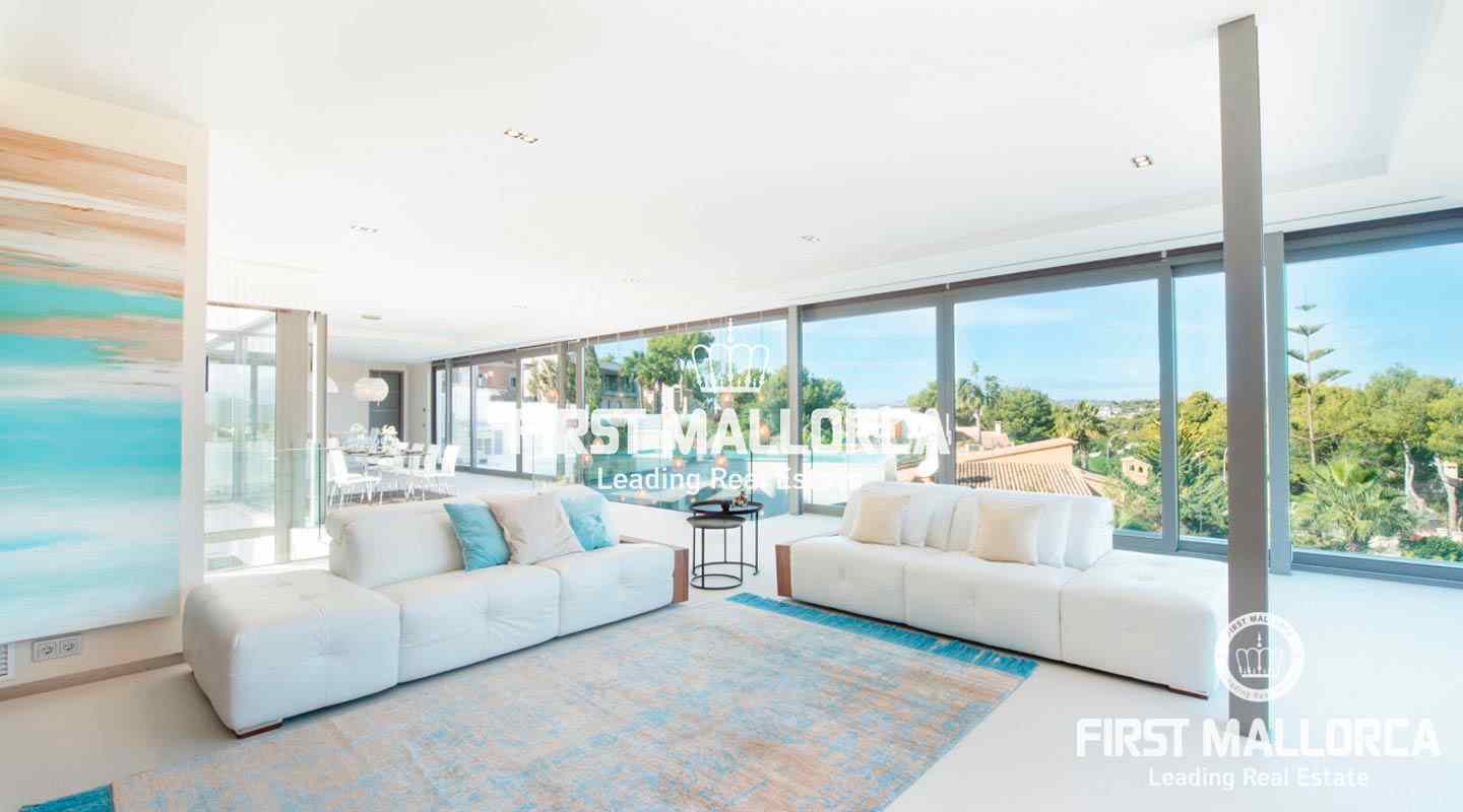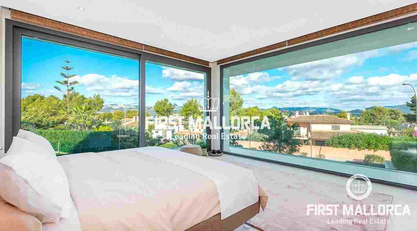 This impressive newly constructed villa with sea views is built on a 1.275m2 plot in a quiet residential street in Nova Santa Ponsa. In total, this luxury property has a first-class design, 5 bedrooms on the entrance level, all with en suite bathrooms. The elevator which is also connected to the garage, takes you to the main living area with a generous outdoor area and a beautiful sea and panoramic view. Each level has its own pool, with the upper one cascading into the lower part. Furthermore, a roof terrace of 153m2 invites you to sunbath as you enjoy a 360 degree view over the sea and mountains. In the basement there is a guest apartment as well as two car places, a Spa area with a fitness room, heated indoor pool, sauna and much more where one can relax and enjoy. Features of this fantastic modern design villa are: Underfloor heating, air conditioning hot/cold, aluminum windows with double glazing, garage, gas fireplace, domotic system, alarm, video system, elevator and a barbecue.