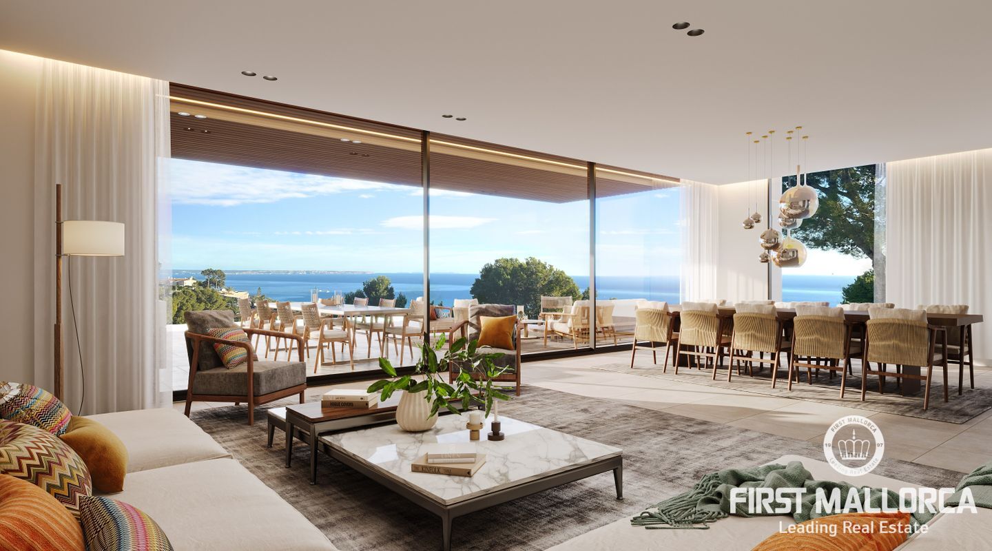 Generous window fronts provide a view of the sea on one side and the mountains on the other and let plenty of light into the open-plan living and dining area, creating a bright and friendly atmosphere. This level is on the ground floor and connects directly to the covered terrace with the pool on one side. From here you have a wonderful view of the bay of Palma. On the other side there is a nice chill-out area with a barbecue area and a view to the mountains. From here you can experience breathtaking sunsets. The property offers the opportunity to fully enjoy the Mediterranean outdoor lifestyle at any time of the day or year, with a high level of privacy being guaranteed.