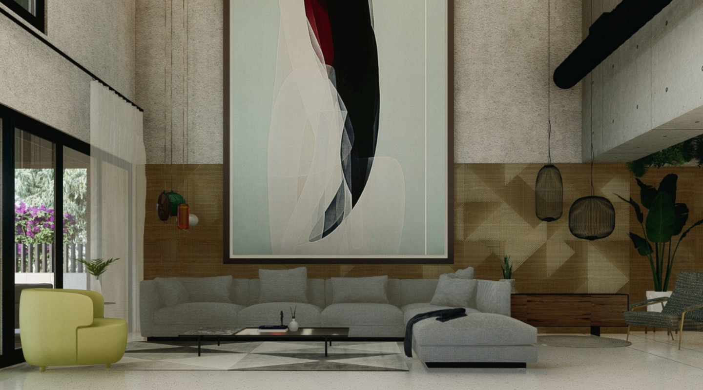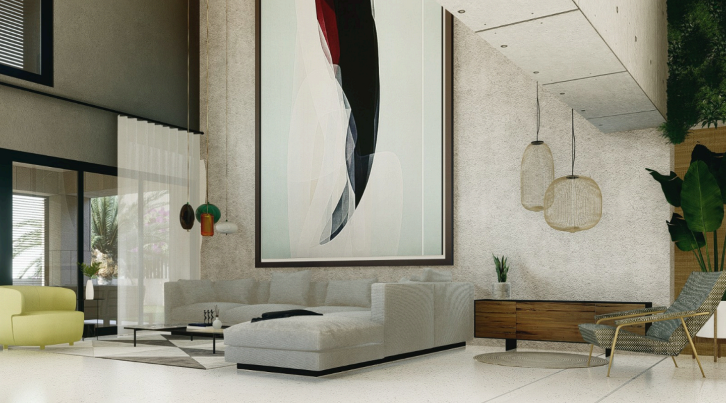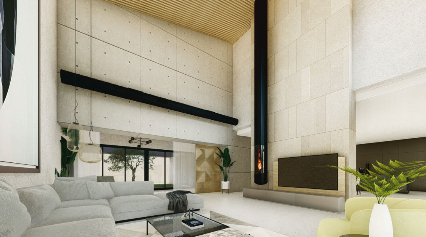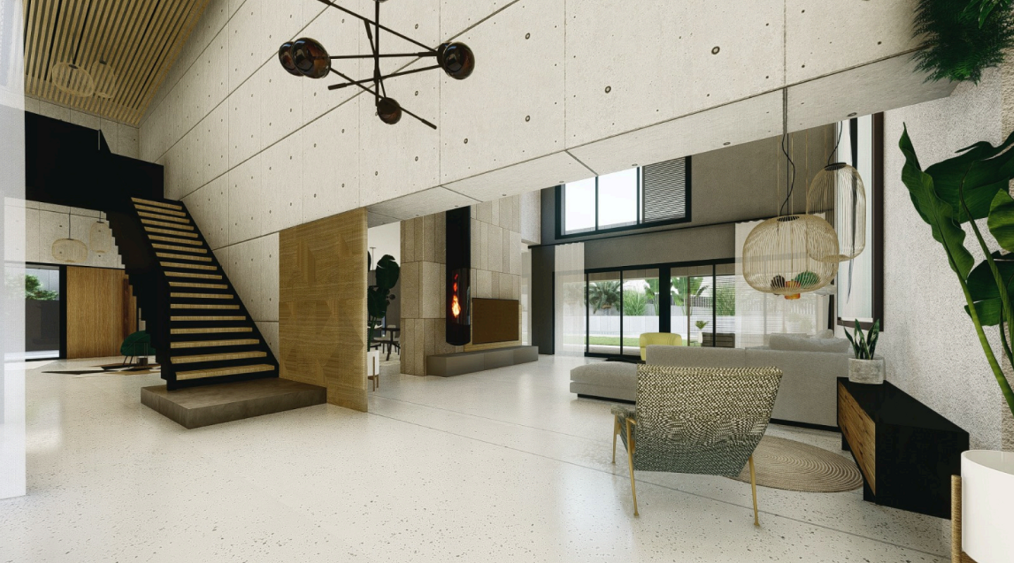 From here, everything is designed to create a warm and contemporary atmosphere. The home features double-height ceilings that bring spaciousness and a modern sense of comfort, allowing natural light to flow throughout the day. Large windows open the interior to the garden and future pool area, creating the perfect setting for enjoying time with family or friends.