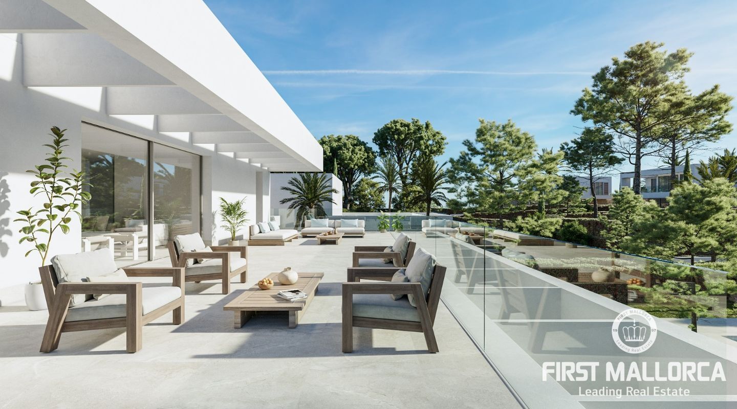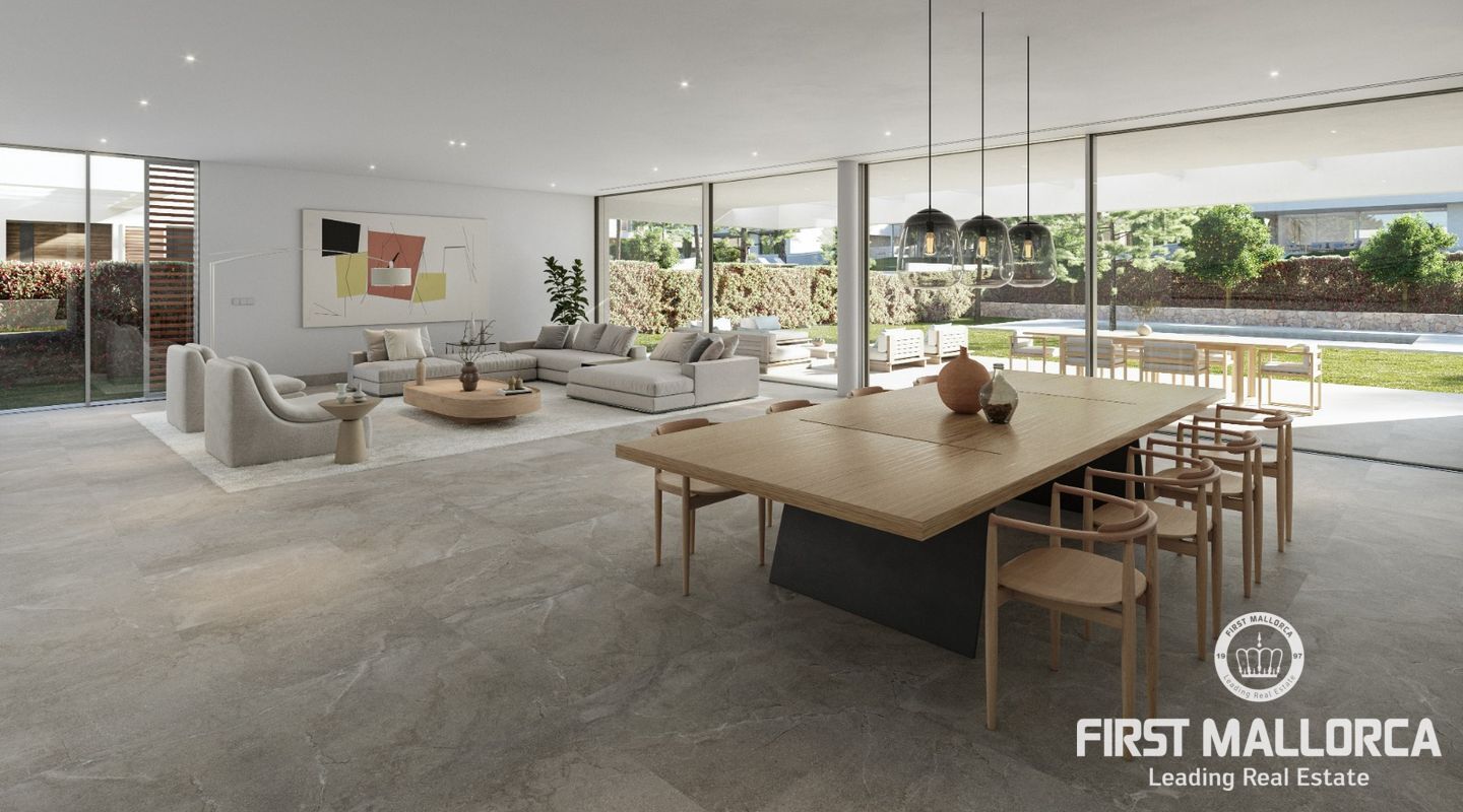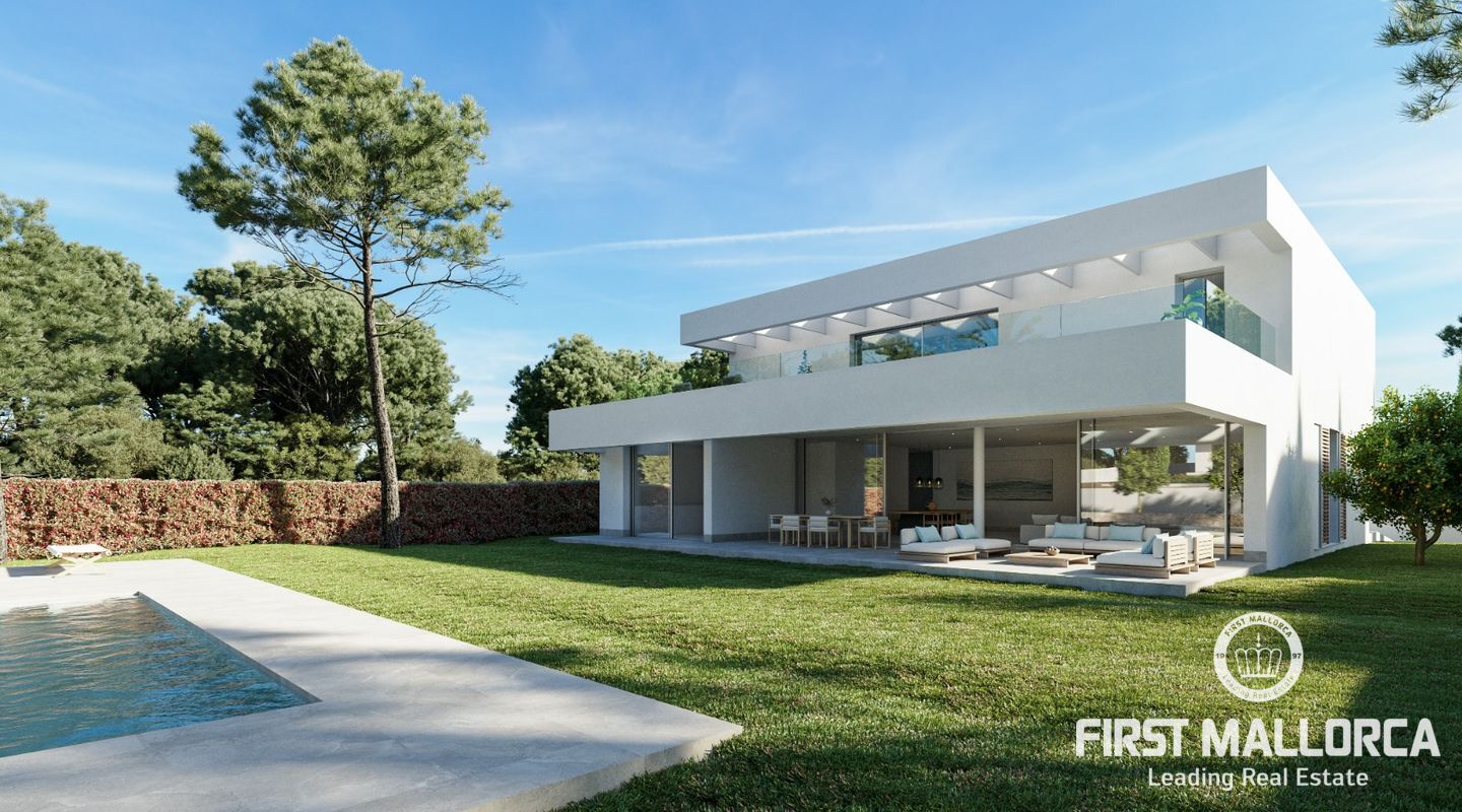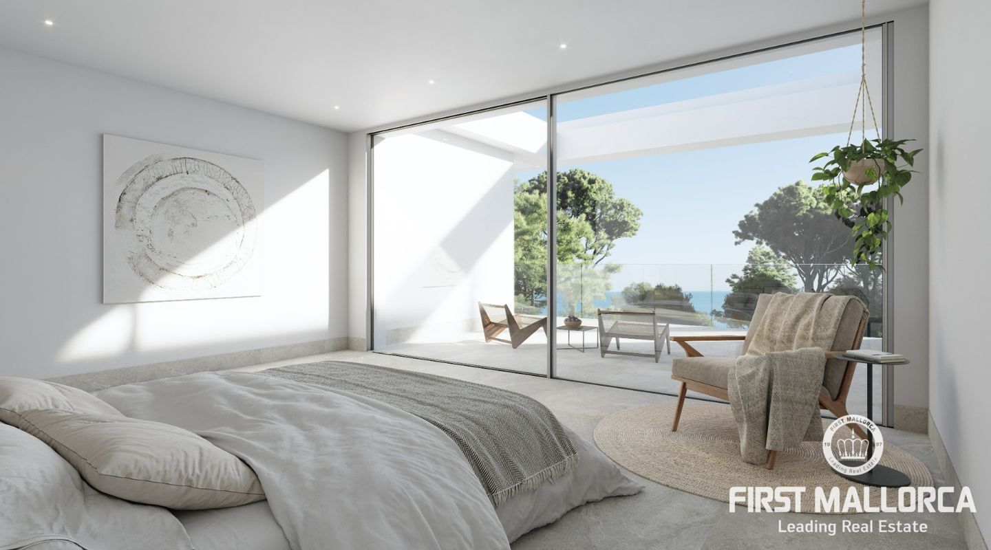 Sol de Mallorca is one of the most luxurious and charming areas of the island with some beautiful bays like Portals Vells or "Cala Bella Dona". 6 exclusive individual villas are currently being built on spacious plots, the first villa will be ready for occupancy in the second quarter of 2024. Lots of natural light inside, imposing ceiling heights and the perfect choice of materials, turn these beautiful villas into a unique opportunity to realise your dream of Mediterranean modern living. This villa offers a total of 5 bedrooms on 2 floors, all with en-suite bathrooms. One of the bedrooms is on the ground floor, the other 4 on the 1st floor, including the master bedroom with a large terrace. The highlight is the living/dining area and the modern, open kitchen with cooking island and Gaggenau appliances. The large window front to the garden, with plenty of lawn and swimming pool, can be opened completely, so that the living room and covered terraces form a large feel-good area that invites you to relax all year round. Sun worshippers take their sunbath on the pool terrace. Features of this luxury villa are: Air conditioning hot/cold, underfloor heating, high-quality kitchen appliances as well as brand fittings in the bathrooms, as well as aluminium windows with double glazing, double garage, laundry room and automatic garden irrigation.