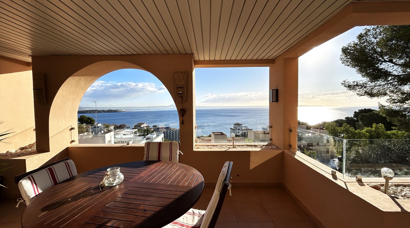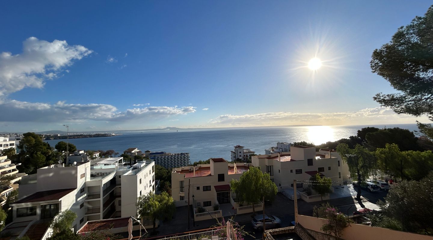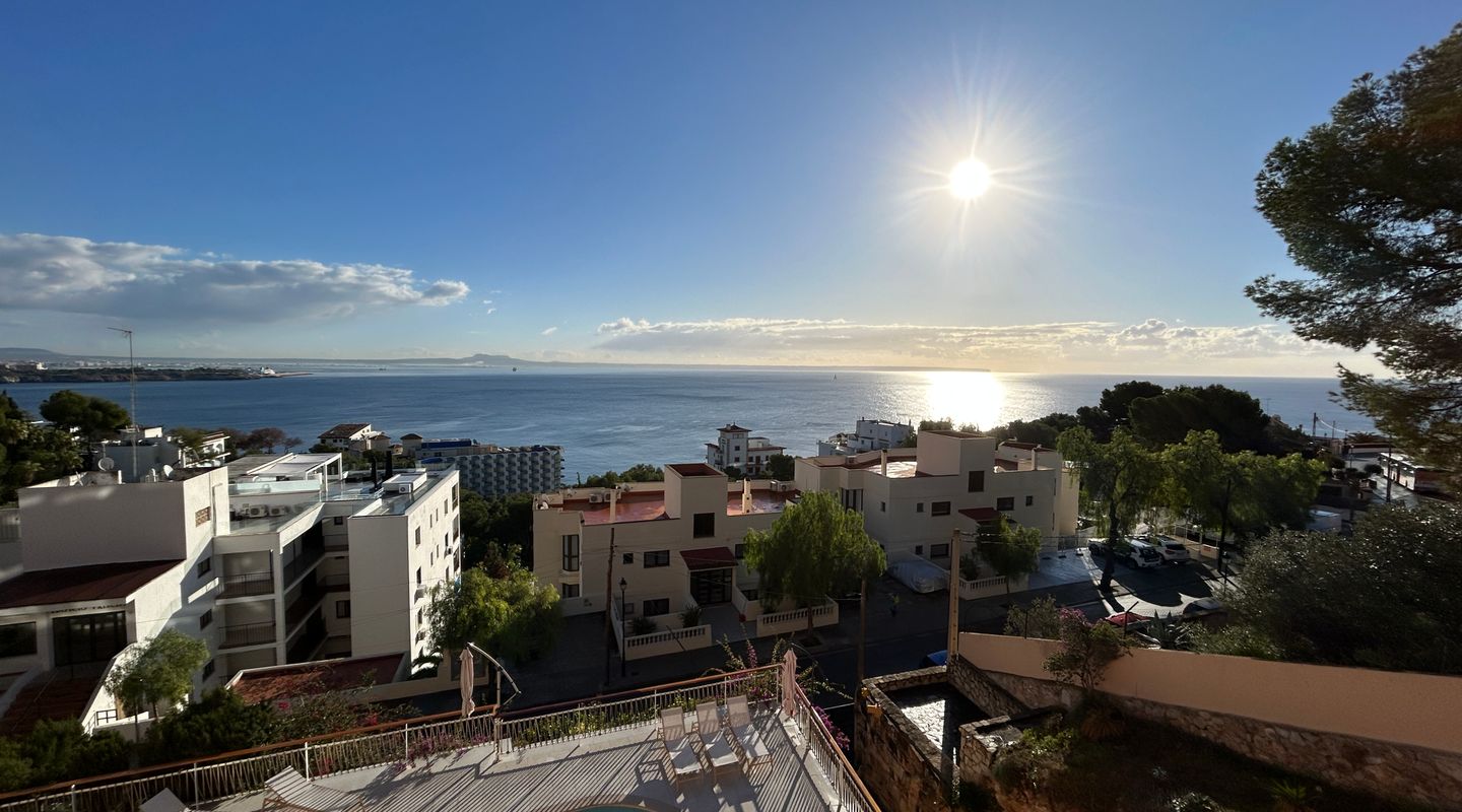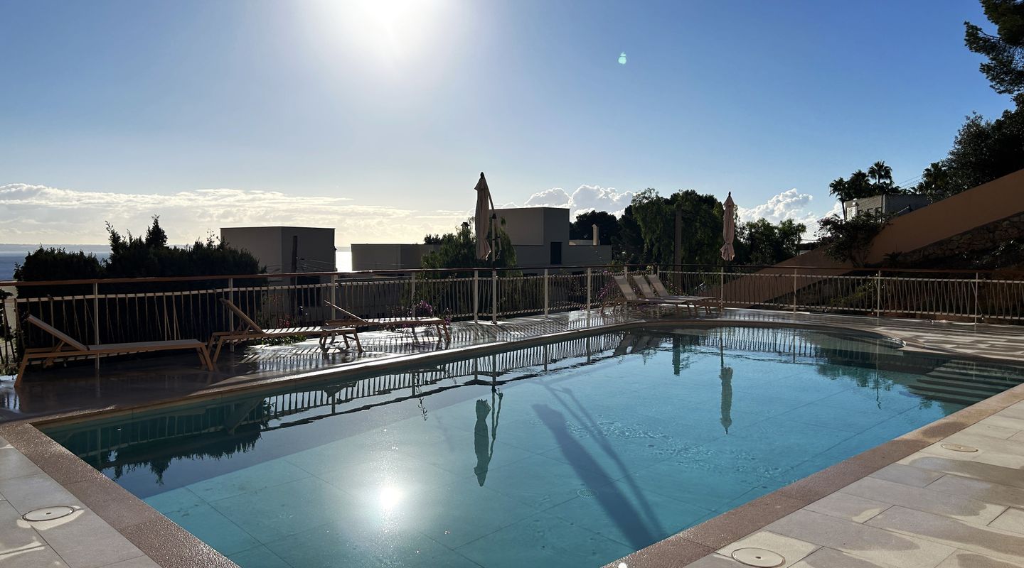 Apartamento con espectaculares vistas al mar en Illetas. Dispone de 2 dormitorios, 2 baños, cocina, salón comedor, amplia terraza y lavadero. Totalmente equipado con todos los electrodomésticos necesarios, suelo de terracota, aire acondicionado f/c. Dispone de 1 plaza de garaje y piscina exterior.