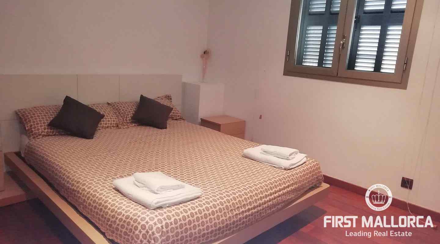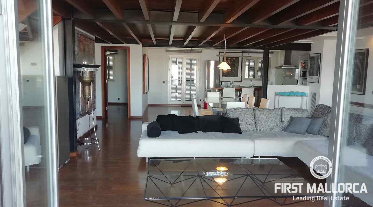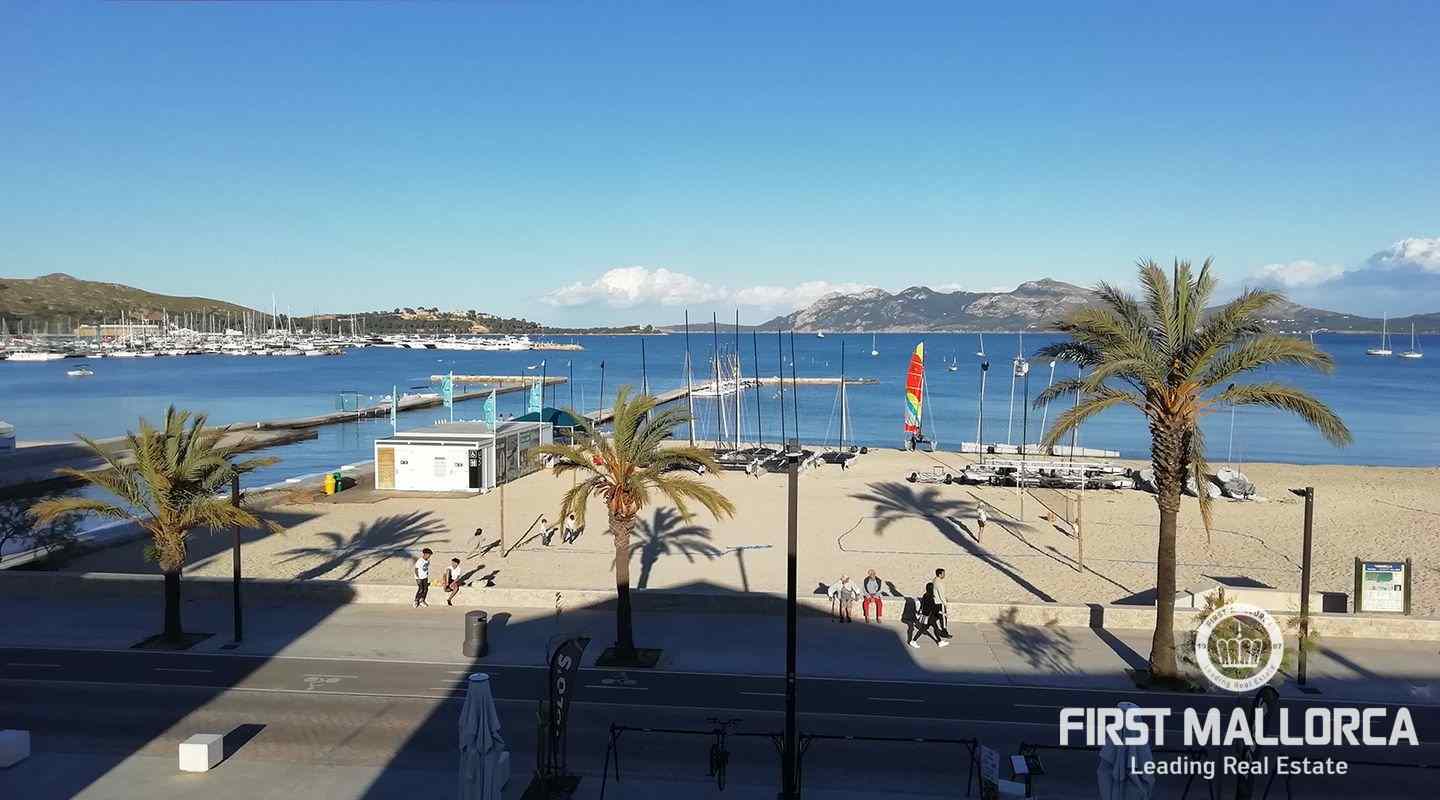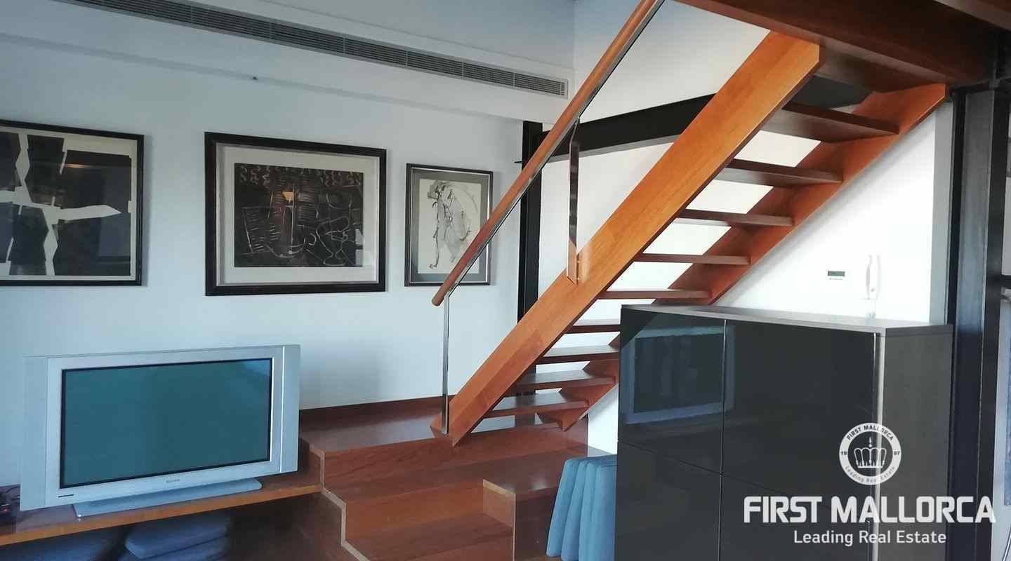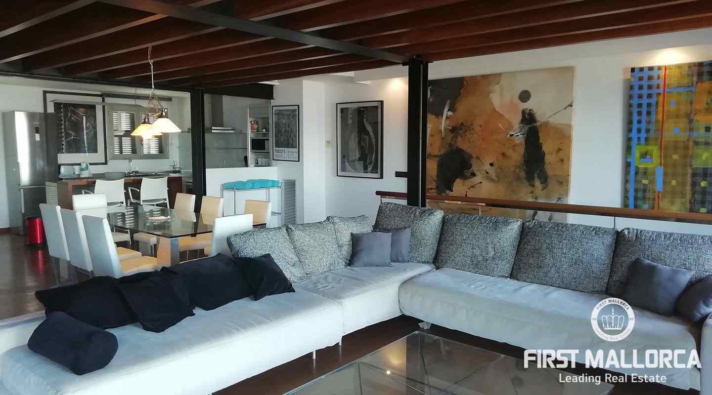 Este apartamento está ubicado en el primer piso de un restaurante, que se encuentra en el paseo marítimo del puerto de Pollensa. En unos pocos pasos estás en el puerto y la playa está justo frente a ti. Al entrar, una escalera lo lleva a un área de cocina espaciosa de planta abierta. También uno de los dormitorios y baños se encuentra en este nivel. El apartamento tiene 2 terrazas grandes, desde una de ellas se puede contemplar las hermosas montañas de Tramuntana y desde la terraza principal se tiene una vista espectacular del mar y de toda la bahía hasta Alcudia. En el segundo piso hay un gran espacio abierto con una segunda cama doble y una terraza. Las ventanas grandes que llegan hasta el piso brindan mucha luz y el piso de madera, así como una gran cantidad de arte, crean un ambiente cálido.