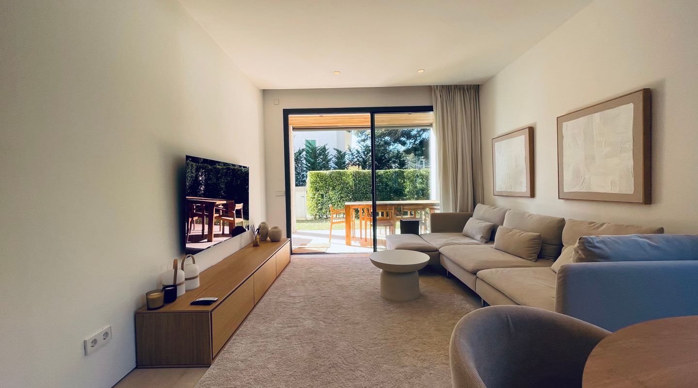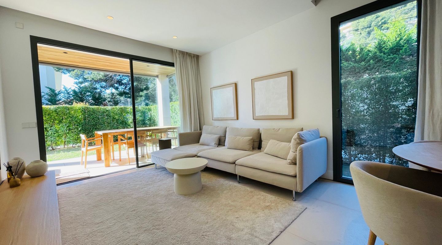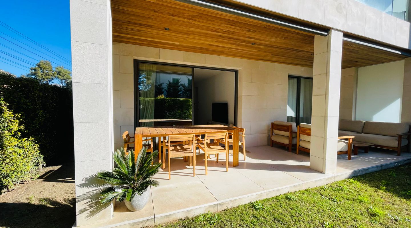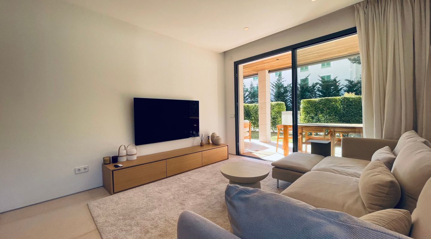 Apartamento de lujo totalmente amueblado en Port de Pollença con piscina, terraza y jardín privado con acceso directo y cerrado a la zona de piscina. Ubicado en una comunidad residencial de alta calidad.
