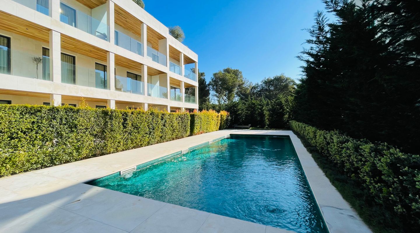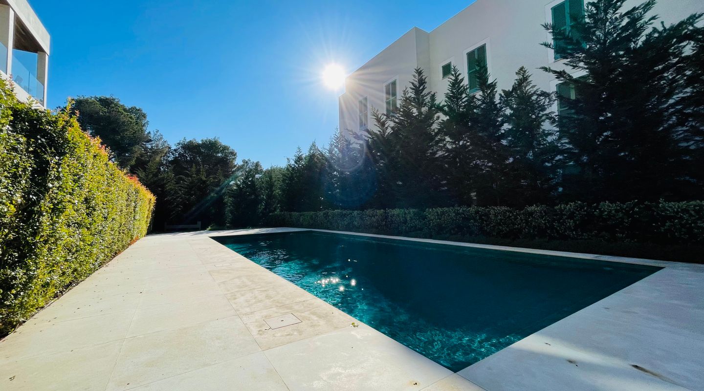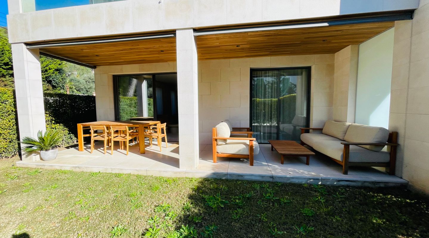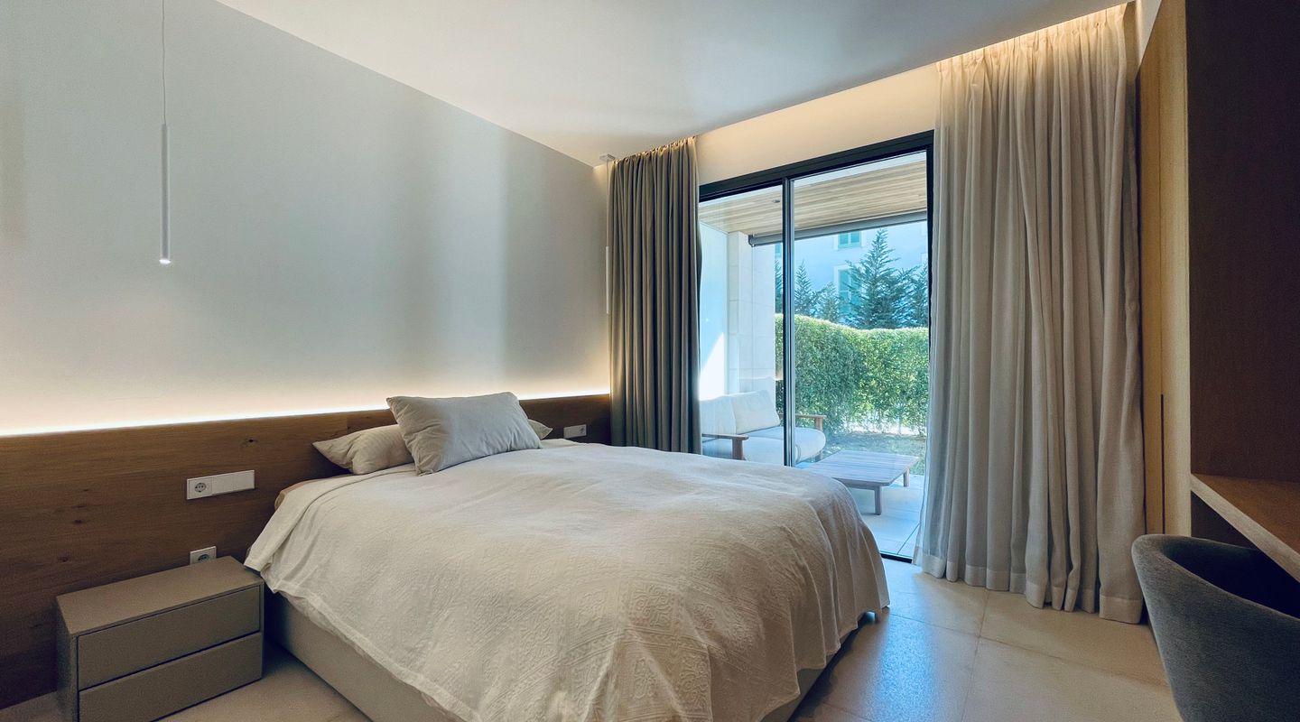 Apartamento de lujo totalmente amueblado en Port de Pollença con piscina, terraza y jardín privado con acceso directo y cerrado a la zona de piscina. Ubicado en una comunidad residencial de alta calidad.