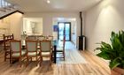 En la planta baja se accede a un acogedor salón con estufa de pellets y arco de piedra natural, que da paso a un amplio comedor con una segunda estufa de pellets y a la cocina equipada de concepto abierto. En esta planta también se encuentran una lavandería con lavadora y secadora, así como un aseo de cortesía.