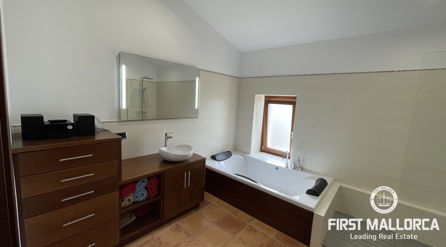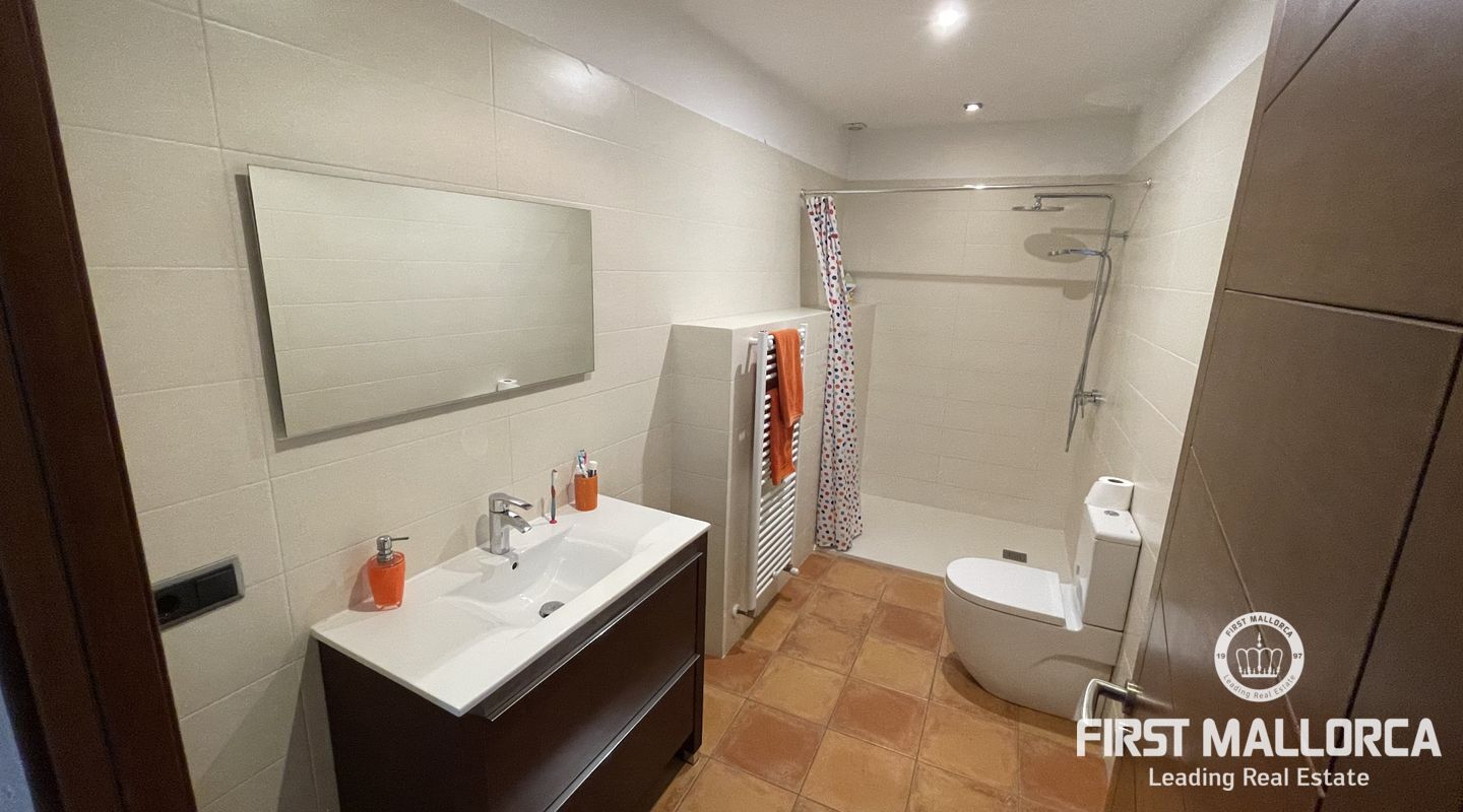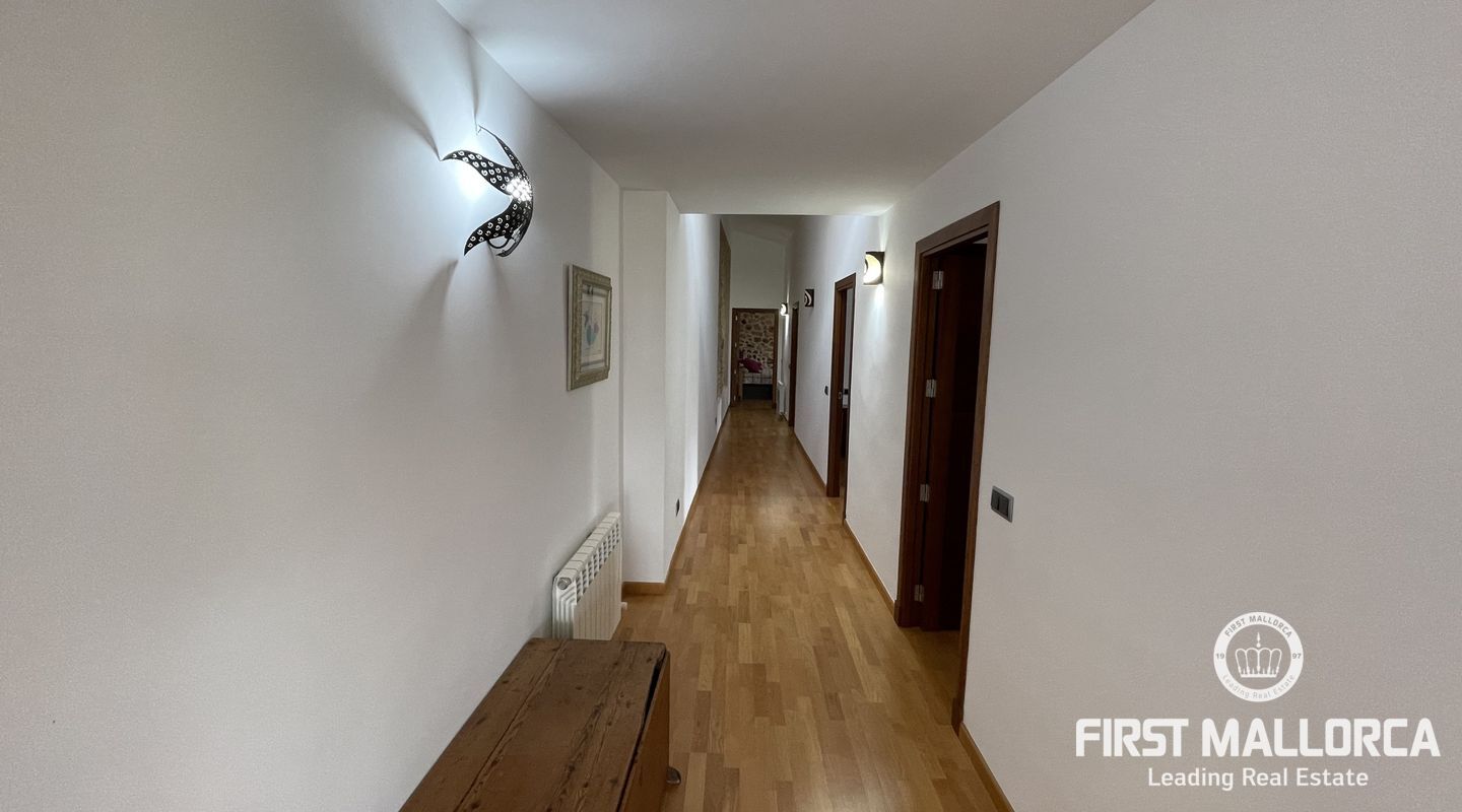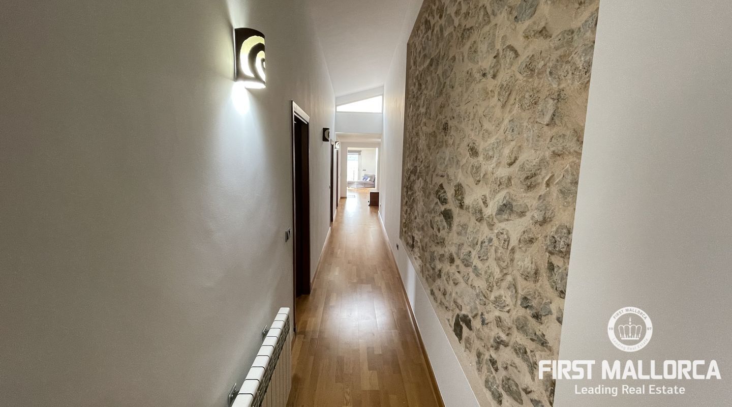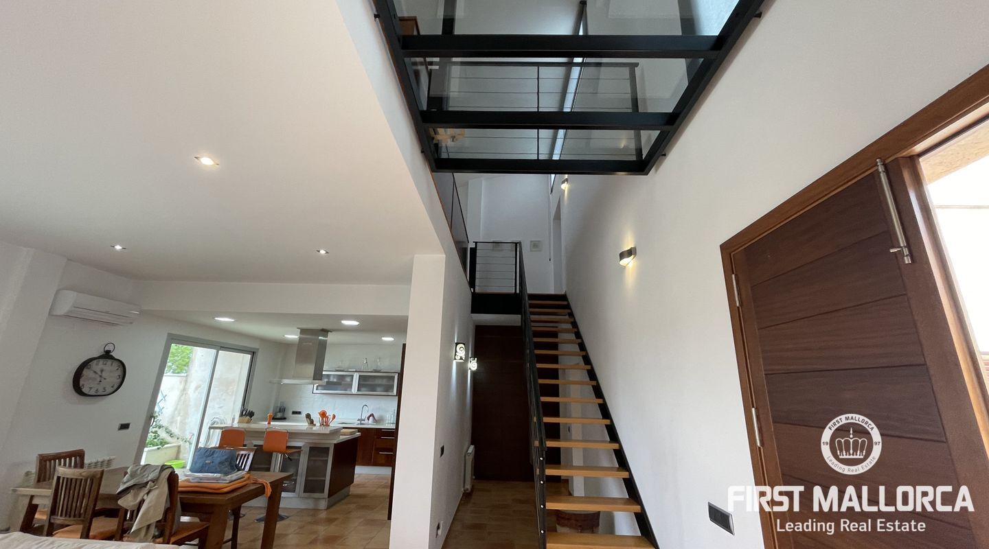 Al entrar le recibe un amplio y luminoso salón con cocina de concepto abierto e isla con zona de cocción por inducción, todo ello con vistas a las montañas del interior de Mallorca.