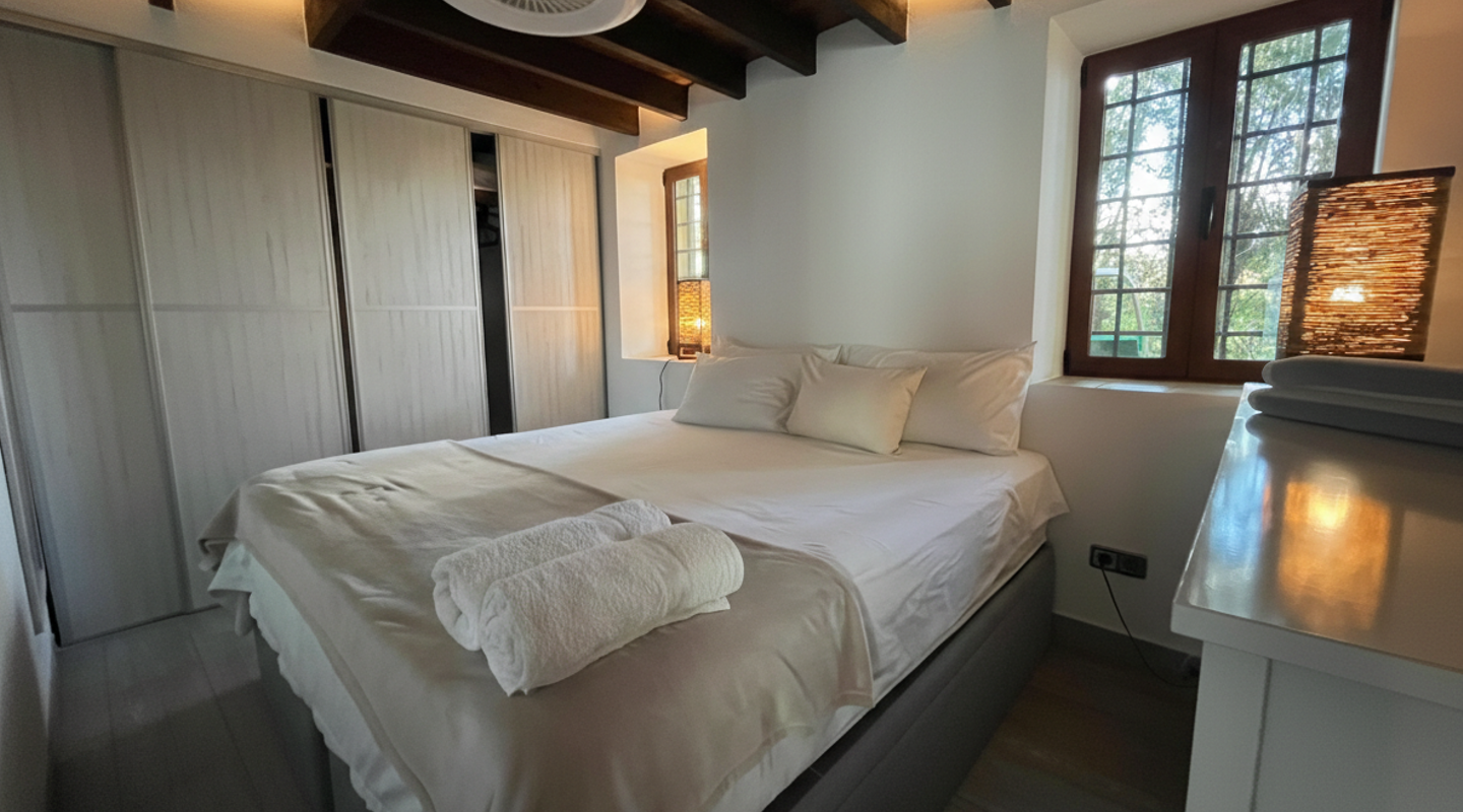 El interior ofrece un ambiente cálido y luminoso gracias a su cocina abierta al comedor, ideal para disfrutar de comidas con familia o amigos, y a la chimenea, que aporta un toque acogedor durante las noches. Desde el salón se accede al jardín y la piscina privada, el lugar perfecto para disfrutar del sol mallorquín y relajarse durante unas vacaciones inolvidables.