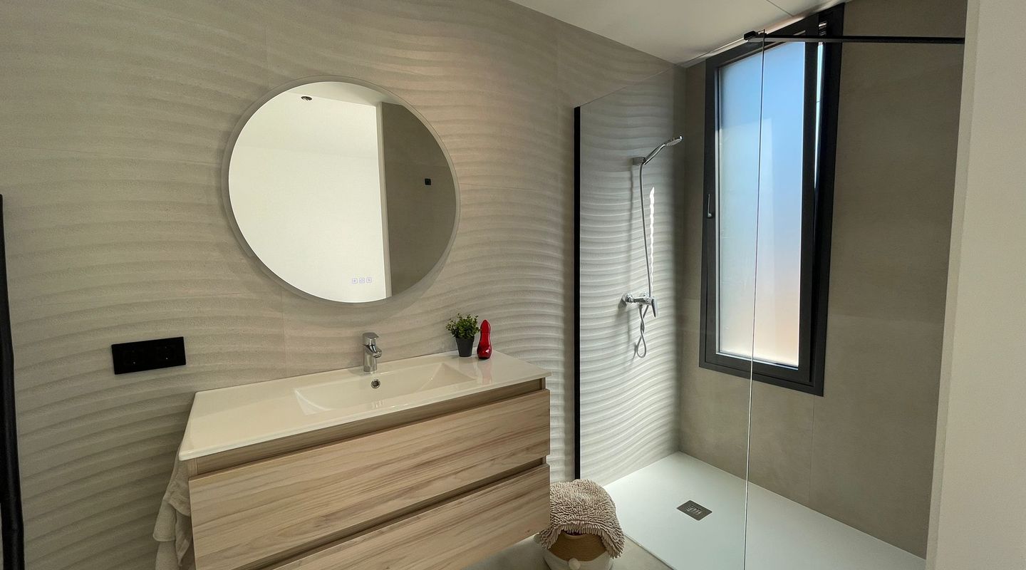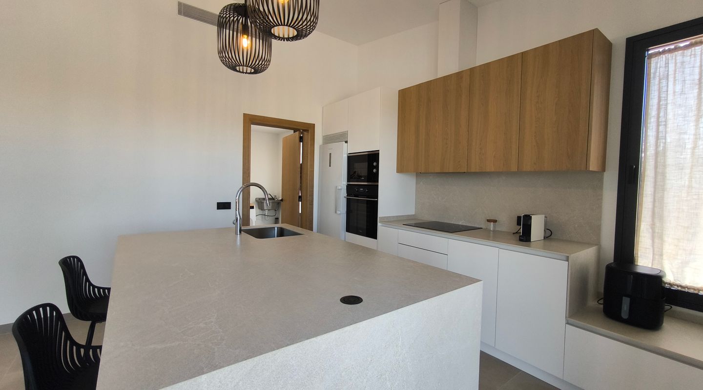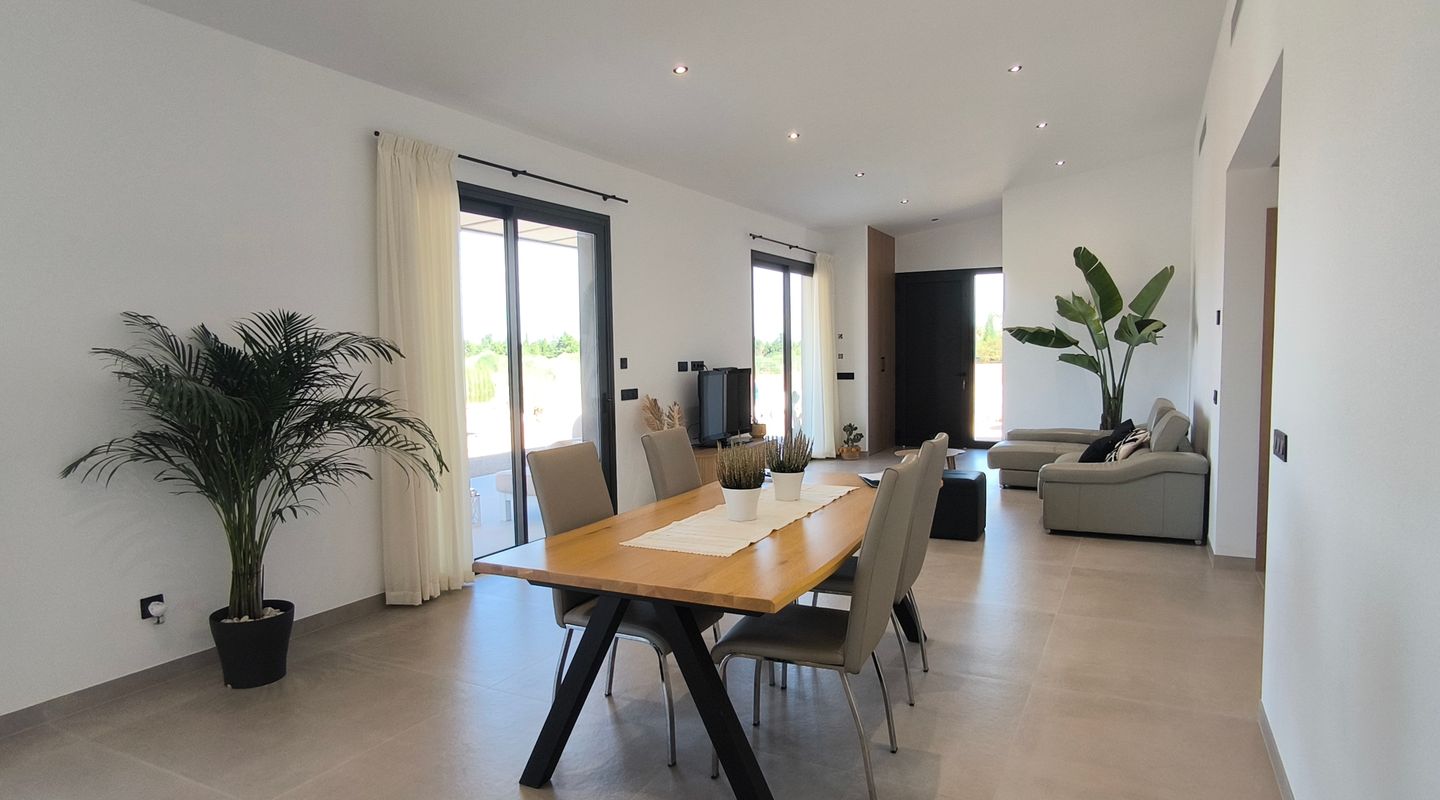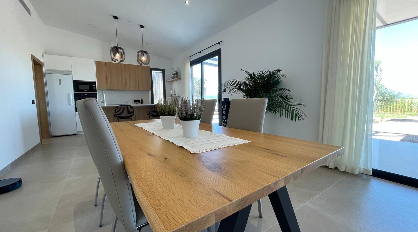 Al acceder a la vivienda, encontramos un espacio totalmente diáfano con grandes ventanales que enmarcan las bonitas vistas al jardín y llenan la casa de luz natural. Este ambiente se distribuye en una confortable sala de estar con televisión, un comedor espacioso que conecta con una moderna cocina con isla, totalmente equipada. La vivienda dispone de tres amplios dormitorios dobles, todos con baño en suite, además de un aseo. En el exterior, destacan una piscina privada con sistema de cloración salina y una terraza cubierta, ideal para relajarse y disfrutar en total privacidad.