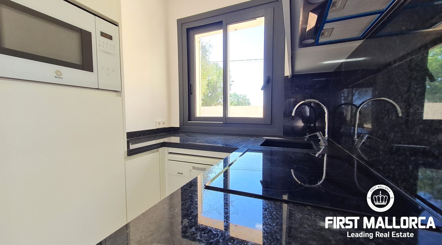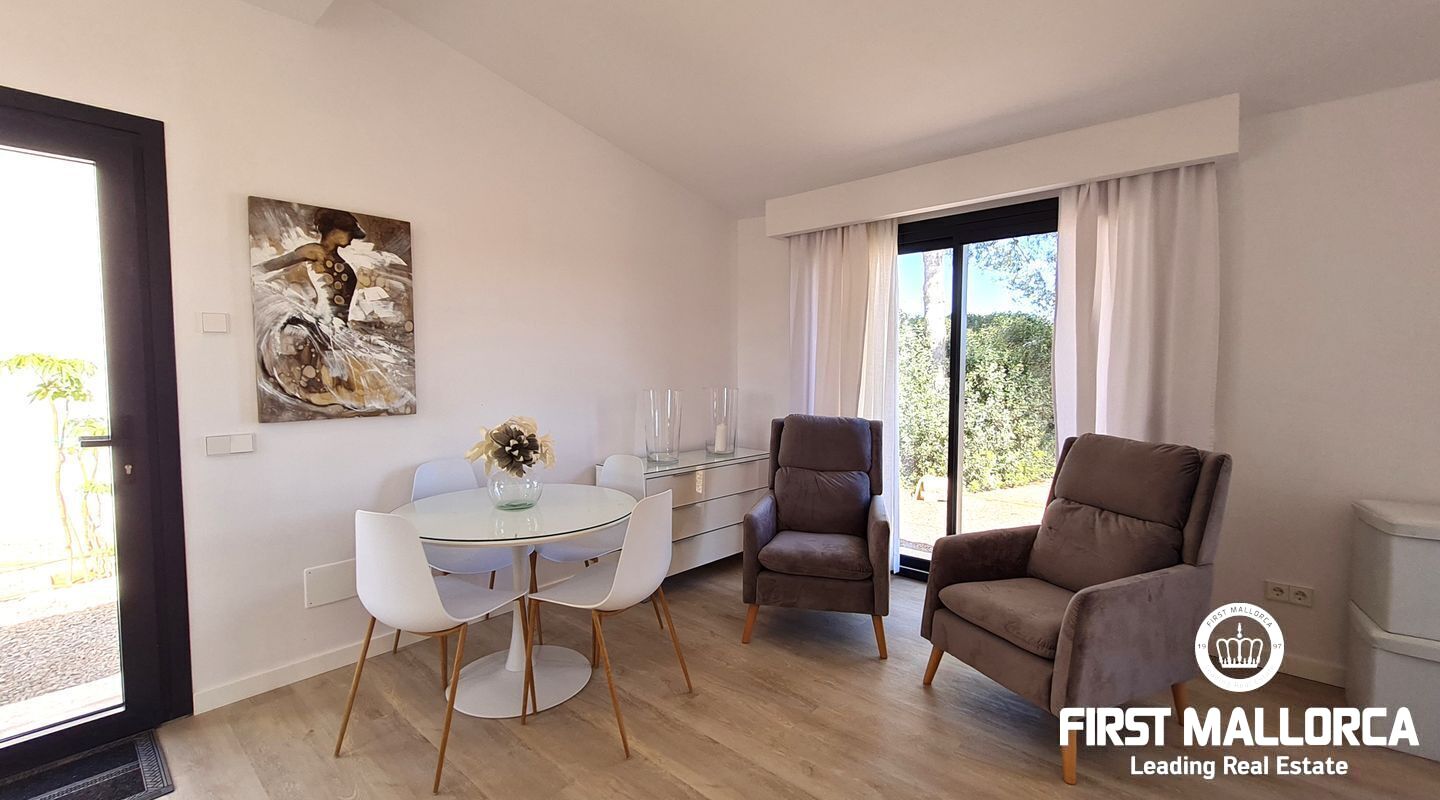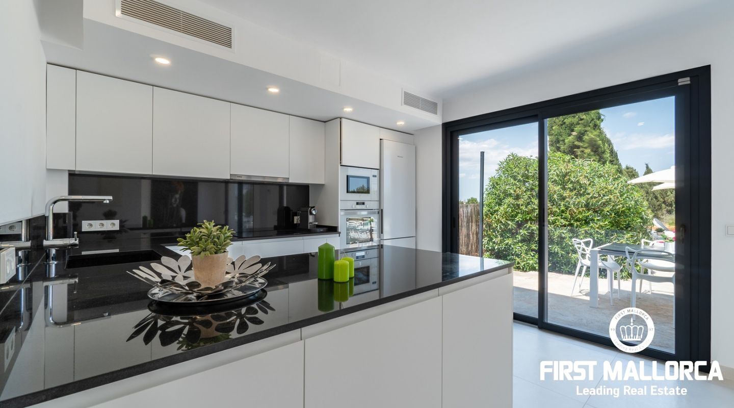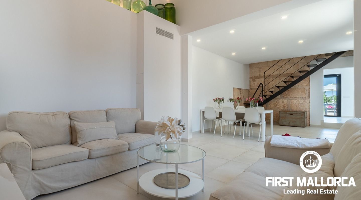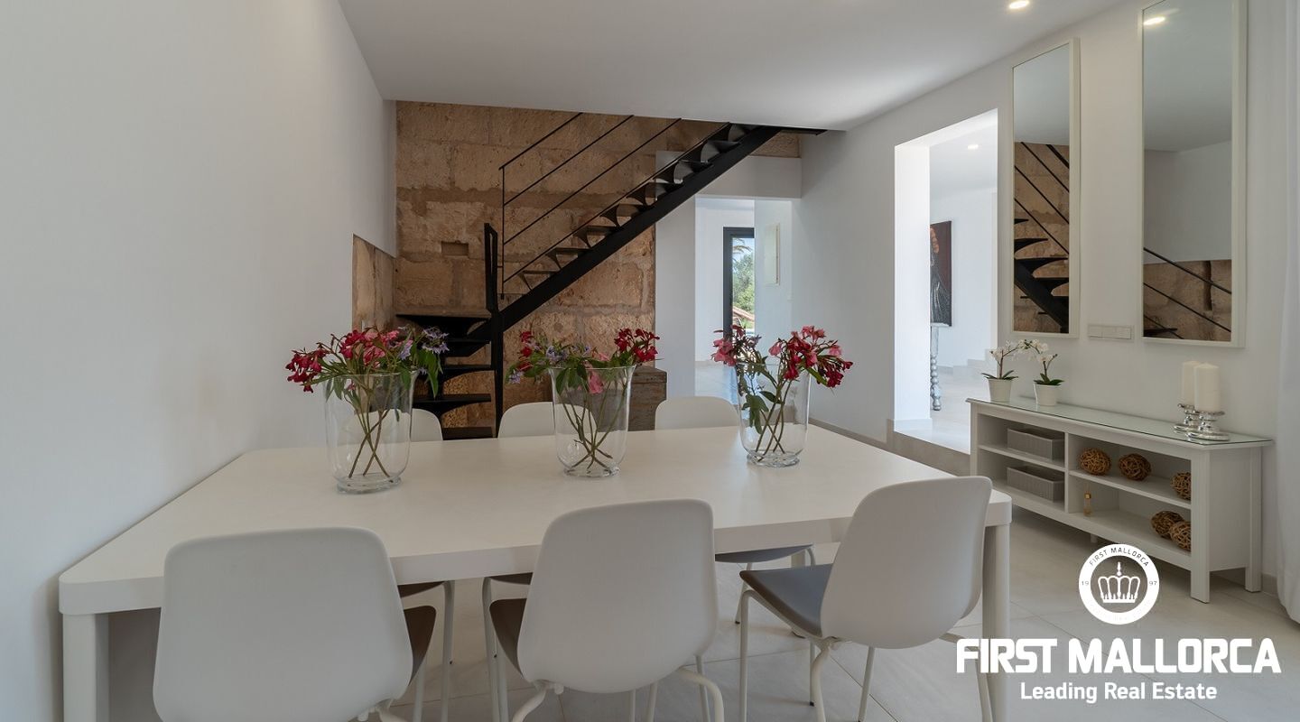 También encontramos un gran salón comedor, en el cual se han conservado la altura y las vigas de madera de la casa original, así como una gran cocina abierta y con electrodomésticos de primeras marcas. Desde la cocina hay acceso a una zona de terraza cubierta justo delante de la magnífica piscina de agua salada.