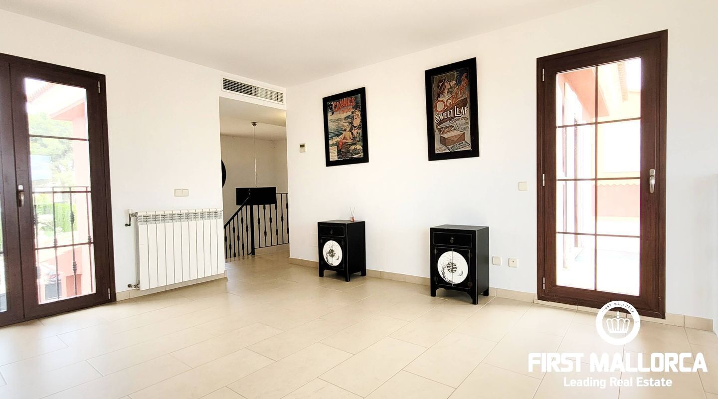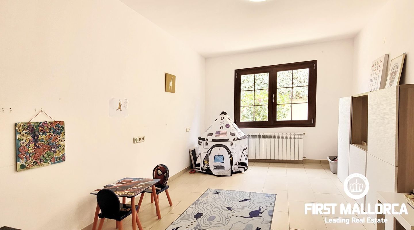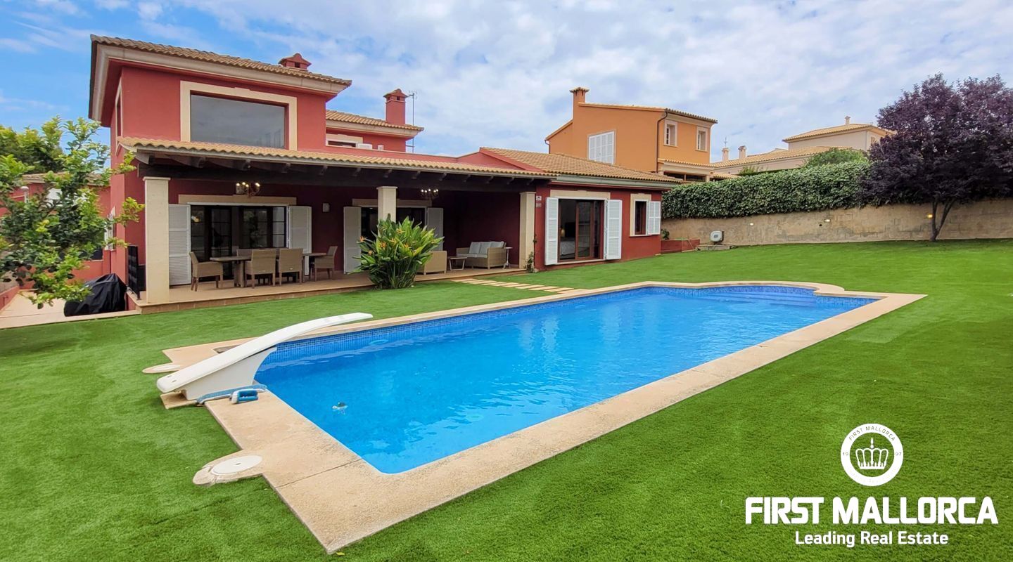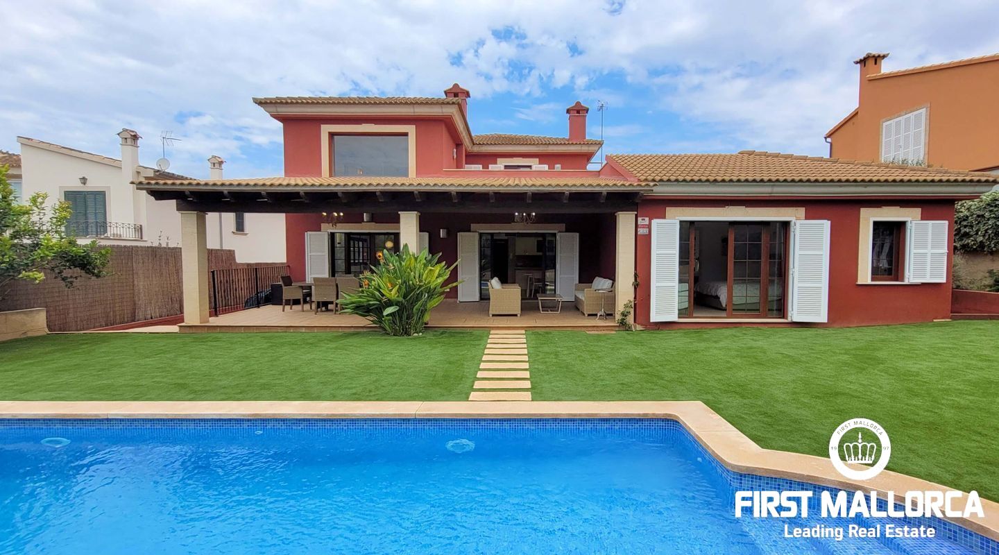 Esta Villa está situada en la zona de Sa Cabaneta, un barrio muy tranquilo. Con una piscina muy grande, de más de 52m2, y mucho espacio de jardín para relajarse, tiene una zona de terraza con sofás y una mesa de comedor junto a la piscina.