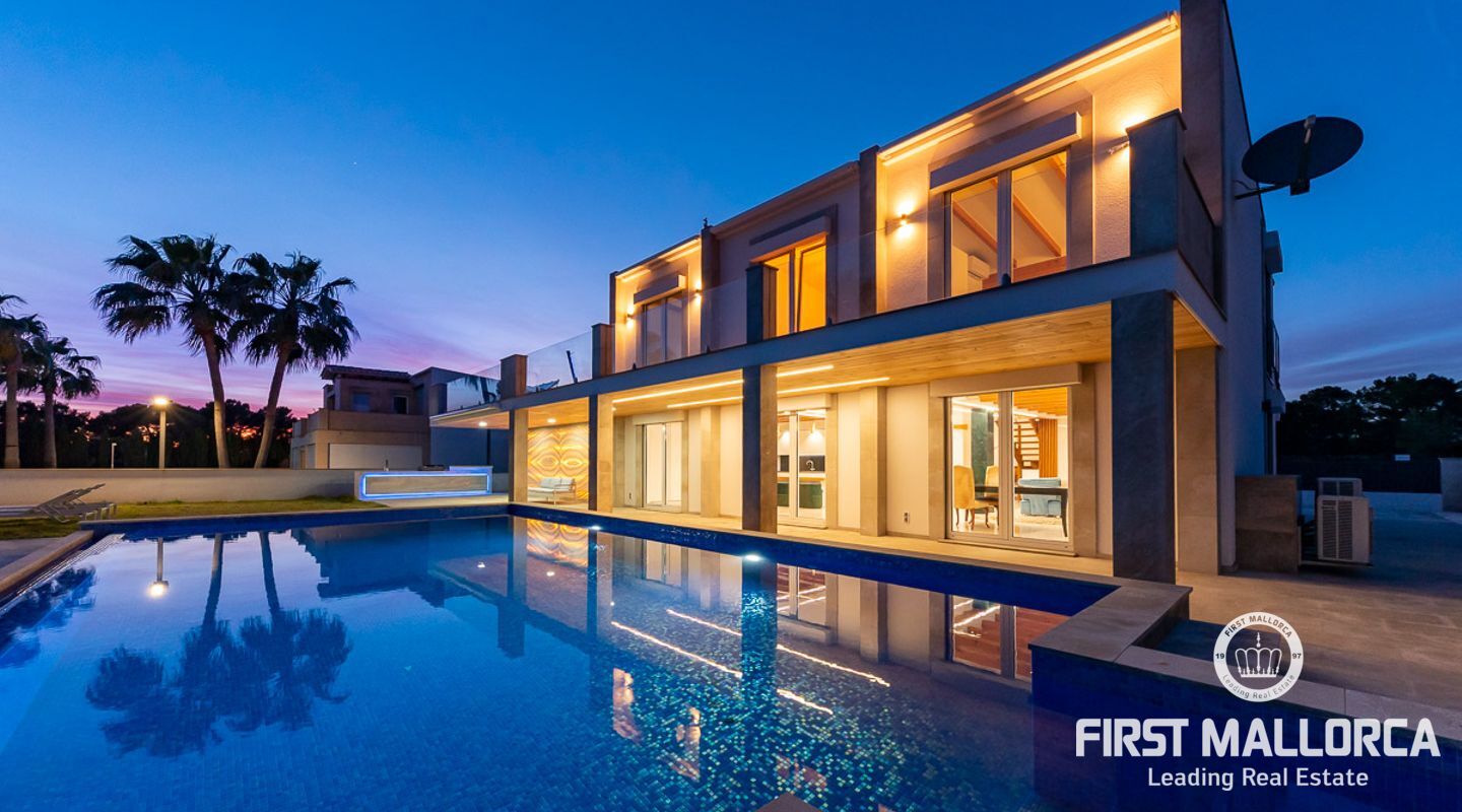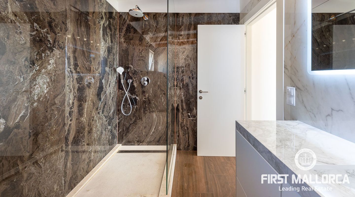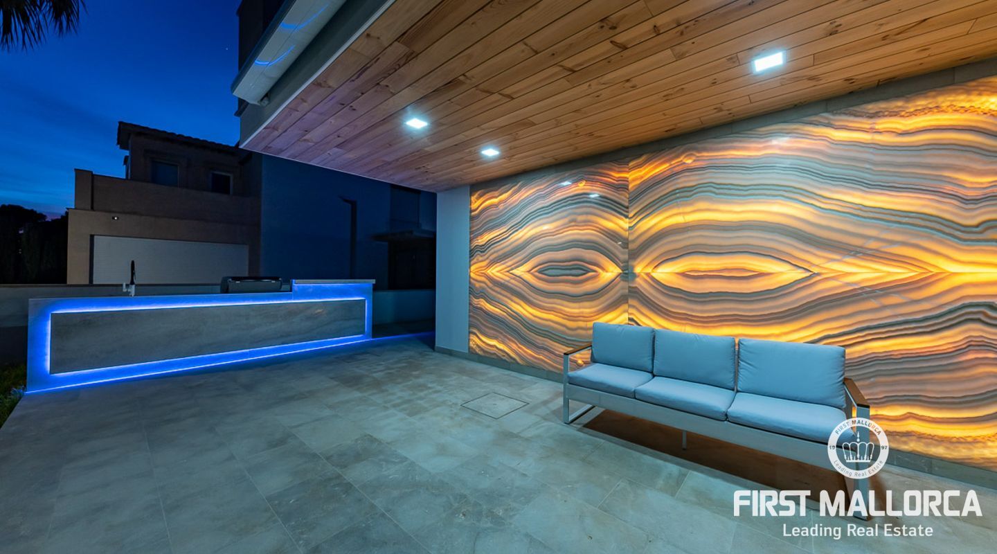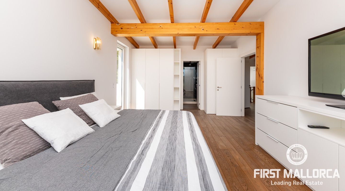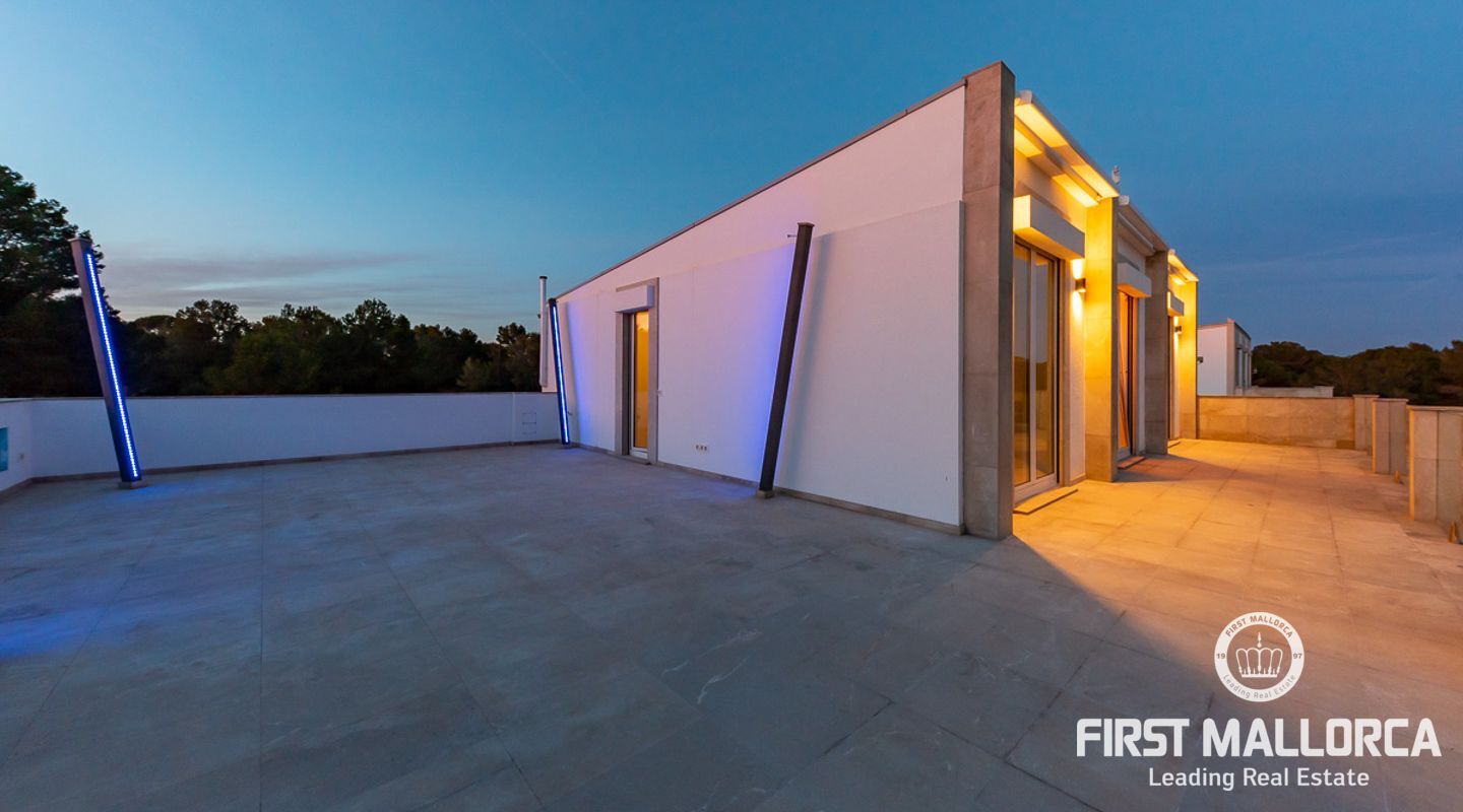 En la primera planta está el dormitorio principal en suite, dos dormitorios más, un baño y una habitación extra que se puede convertir en un amplio vestidor o una oficina. Además, uno de los dormitorios tiene acceso directo a la gran terraza, que se aprecia tanto por el día como por la noche con las luces encendidas.