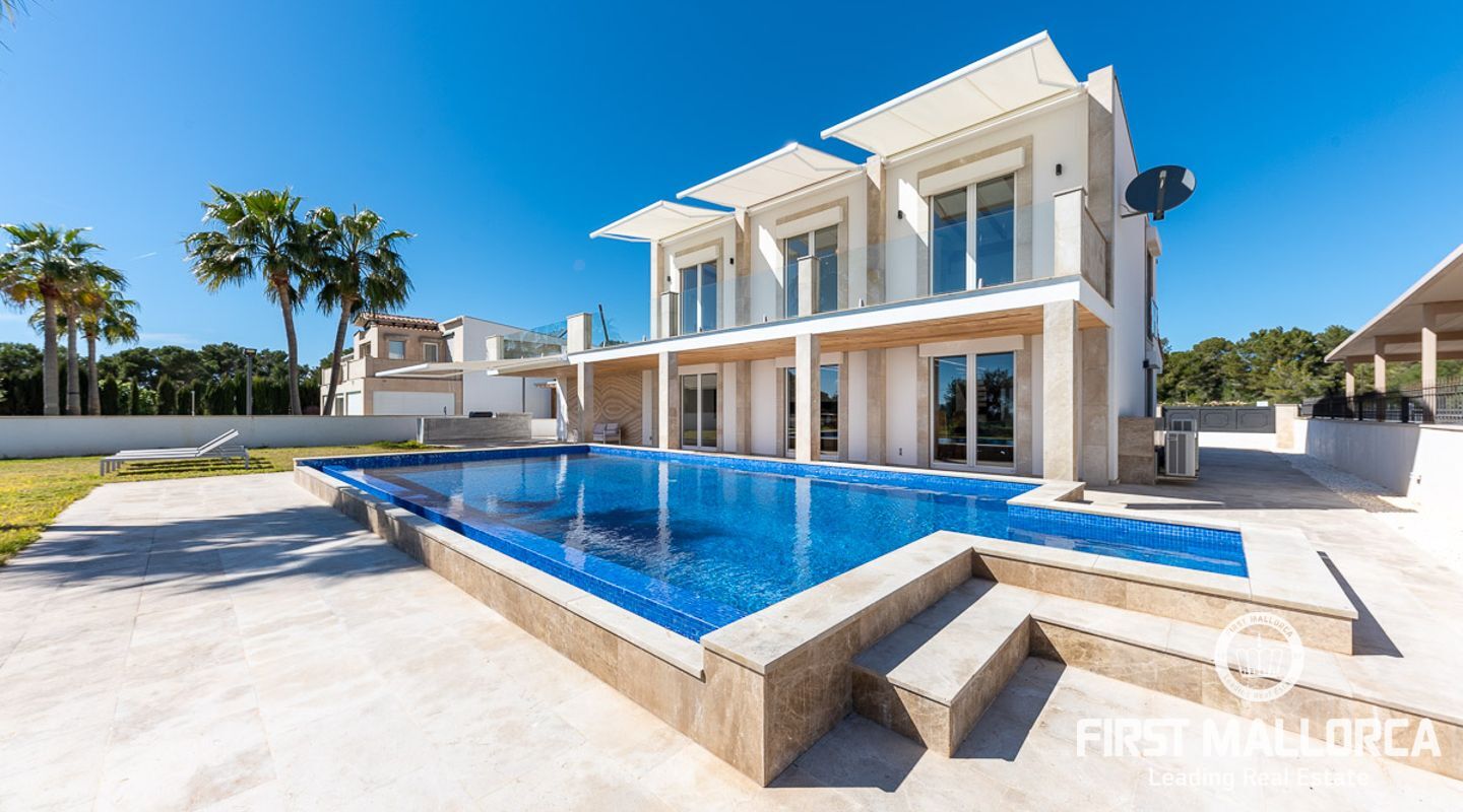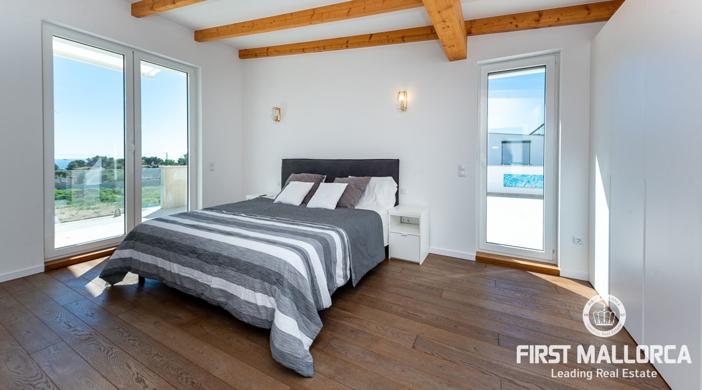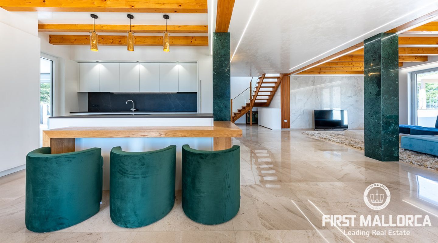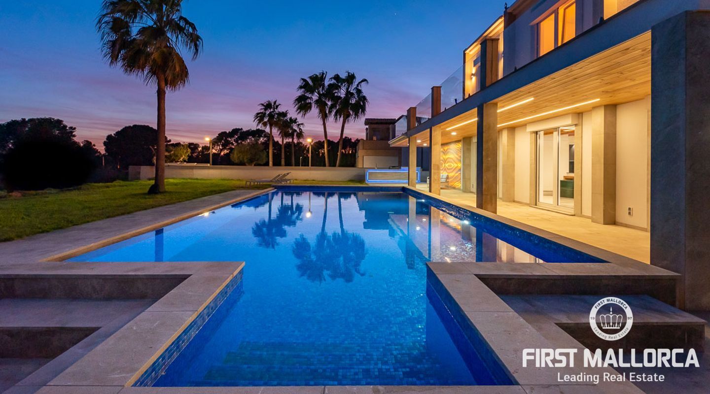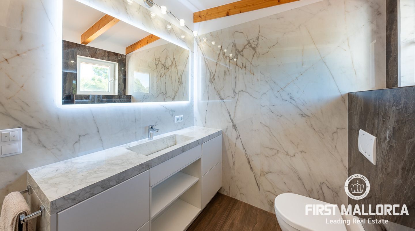 En la primera planta está el dormitorio principal en suite, dos dormitorios más, un baño y una habitación extra que se puede convertir en un amplio vestidor o una oficina. Además, uno de los dormitorios tiene acceso directo a la gran terraza, que se aprecia tanto por el día como por la noche con las luces encendidas.
