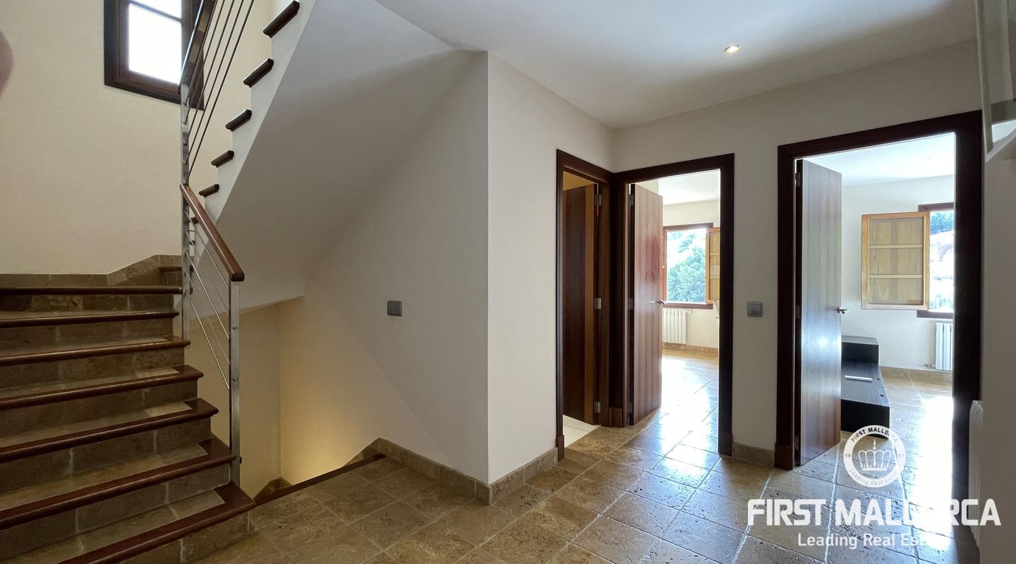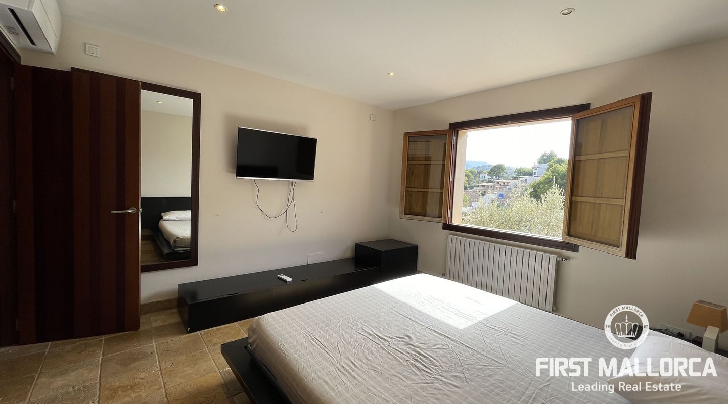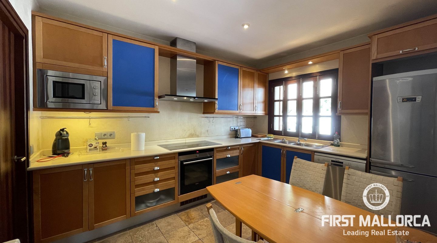Esta casa adosada tiene una buena distribución. Las habitaciones son amplias, al igual que los baños y la cocina-salón con despensa. Desde la entrada a nivel de calle se accede al pasillo y desde aquí a la cocina, un dormitorio, un aseo y la acogedora sala de estar orientada al oeste con acceso al balcón cubierto con una vista maravillosa. Los demás dormitorios y baños se encuentran en la planta inferior. En el nivel del jardín está el gran garaje doble. La propiedad es fácil de mantener y está plantada con arbustos y árboles mediterráneos. Cabe la posibilidad de construir una piscina. La casa está equipada con ventanas aislantes, tiene aire acondicionado frío/calor en todas las habitaciones, está en muy buen estado y lista para su ocupación inmediata. La licencia de alquiler para hasta 8 personas hace que la oferta sea adicionalmente atractiva.