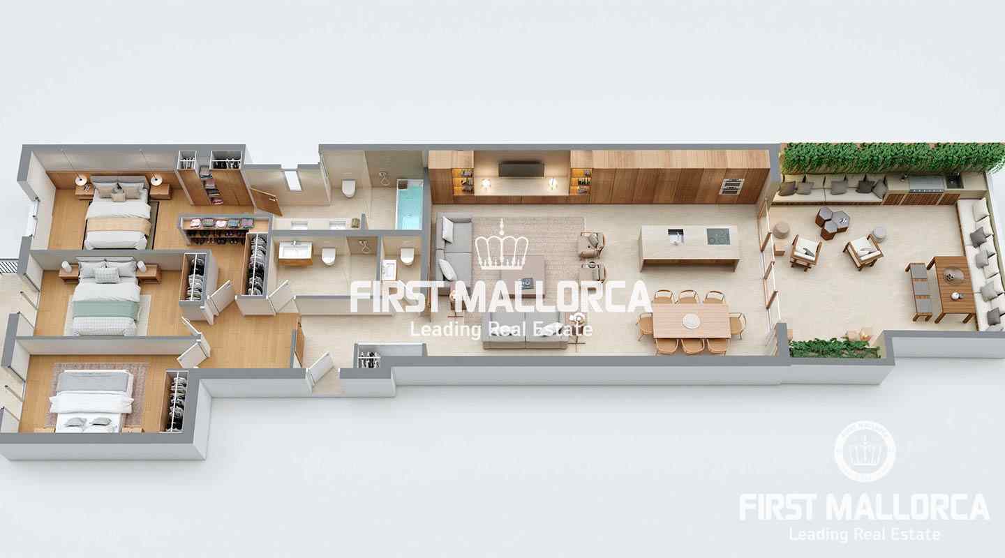 Se ha creado un espacio de día que reúne salón, comedor y cocina con una isla central. La zona de noche destaca por su amplio dormitorio principal con baño en suite y vestidor además de 2 dormitorios dobles que comparten un generoso baño. La vivienda dispondrá de una gran terraza privada conectada a la cocina y zona de comedor interior a través de un amplio ventanal y en la que se ha proyectado una cocina exterior con barbacoa y espacio de almacenaje.