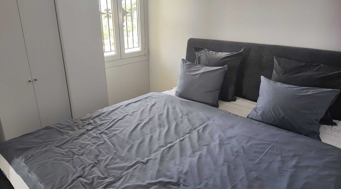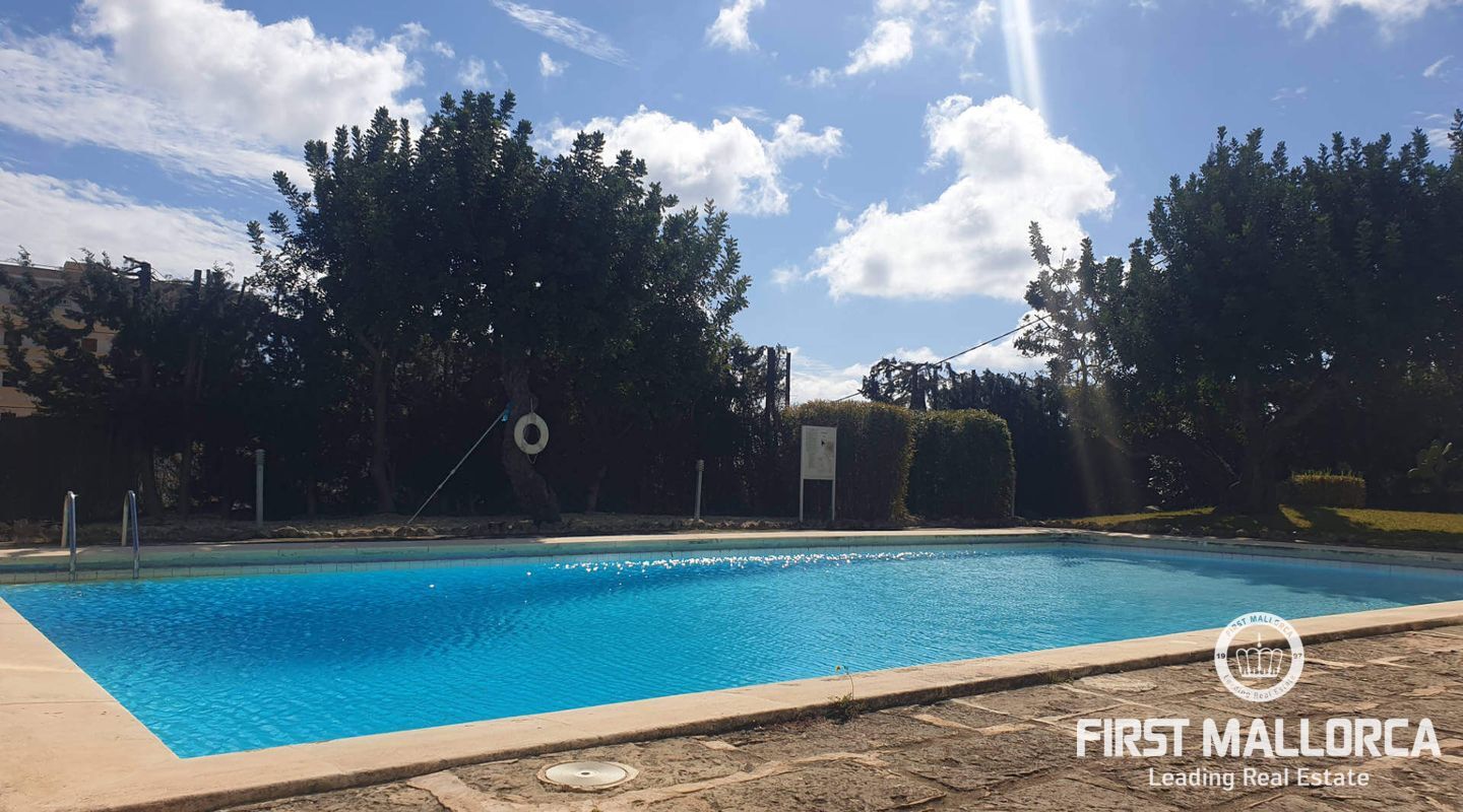 El dormitorio con cama doble ofrece mucho espacio de almacenamiento y vistas a las montañas. El piso se encuentra a pocos minutos de la hermosa playa de Cala Major,
