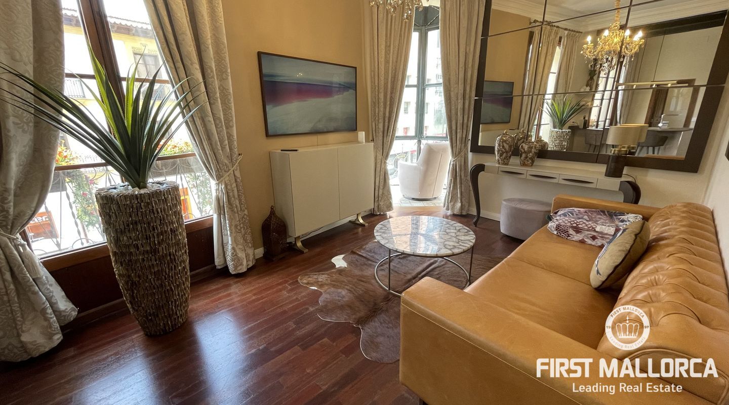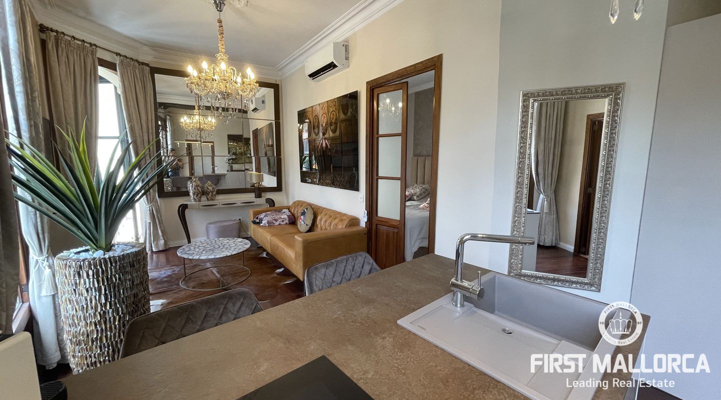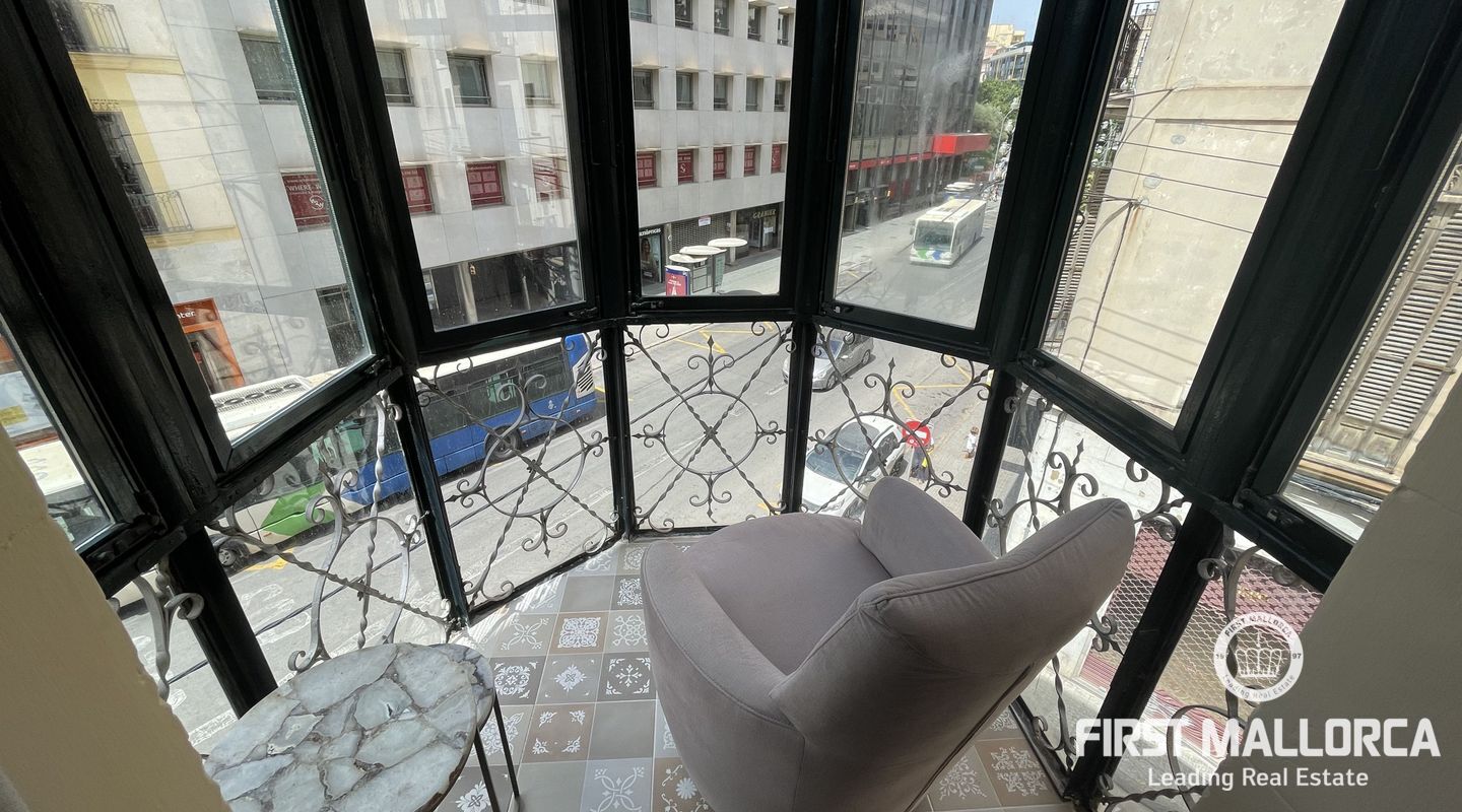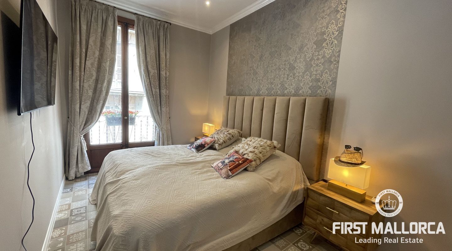 It has been renovated to a high standard and furnished with designer pieces (Chesterfield sofa, Lamborghini wallpaper, etc.). The living room opens onto a very modern, fully equipped fitted kitchen with access to a large Juliet balcony. One of the highlights is the glazed, round balcony with a comfortable contemporary rocking chair and views over Palma’s Old Town — the perfect spot to enjoy your morning coffee in peace and quiet.
