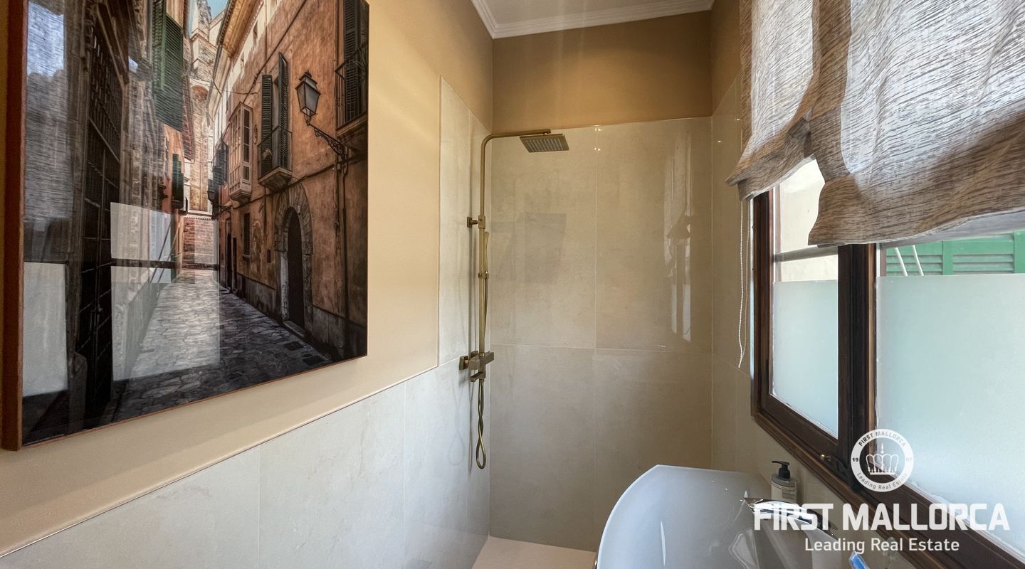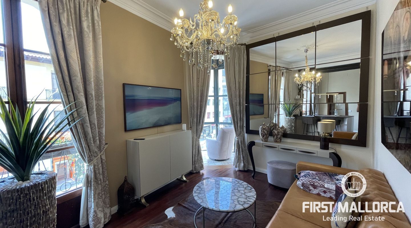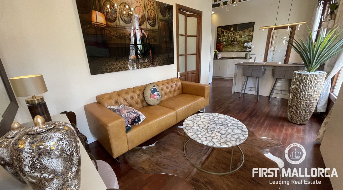 It has been renovated to a high standard and furnished with designer pieces (Chesterfield sofa, Lamborghini wallpaper, etc.). The living room opens onto a very modern, fully equipped fitted kitchen with access to a large Juliet balcony. One of the highlights is the glazed, round balcony with a comfortable contemporary rocking chair and views over Palma’s Old Town — the perfect spot to enjoy your morning coffee in peace and quiet.