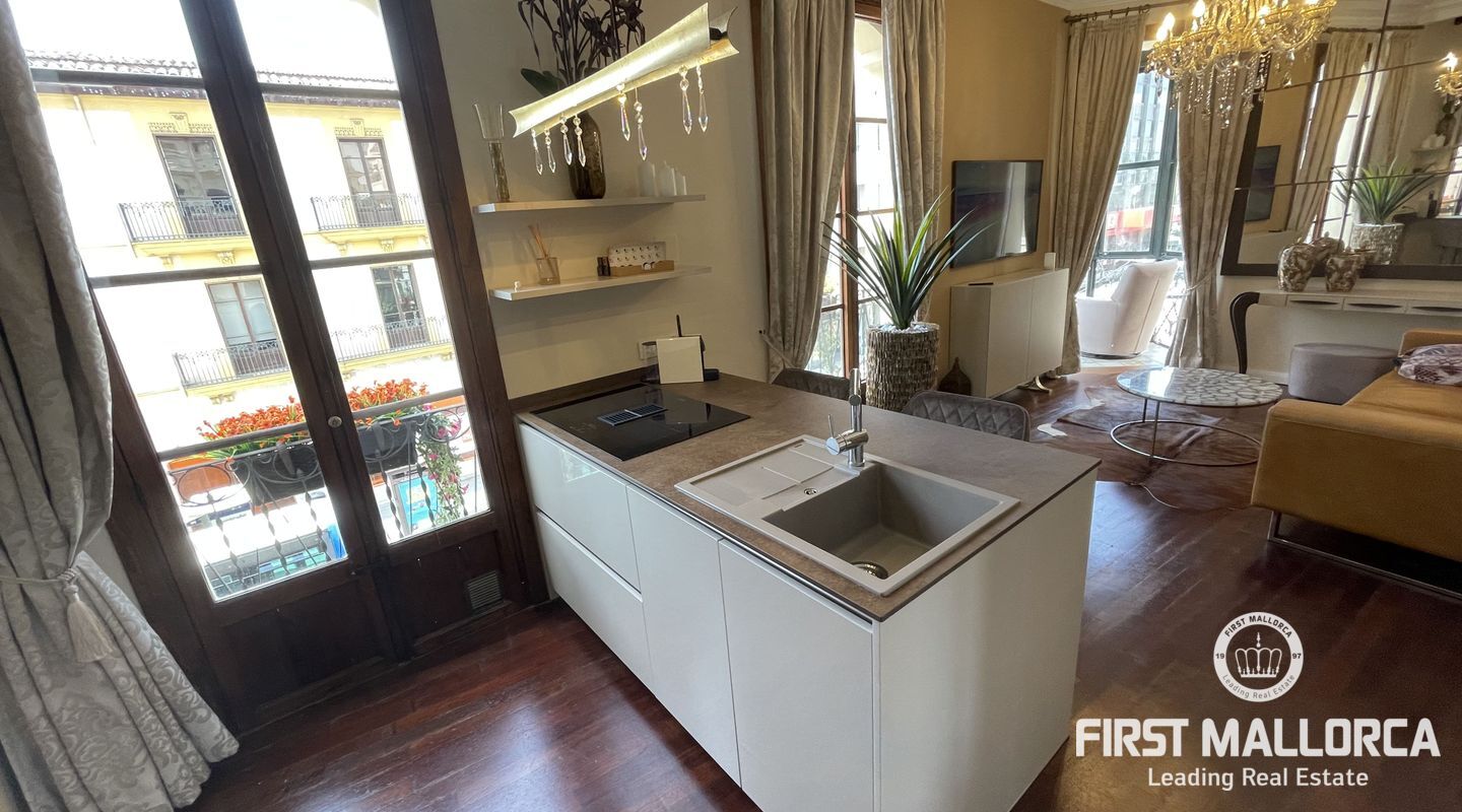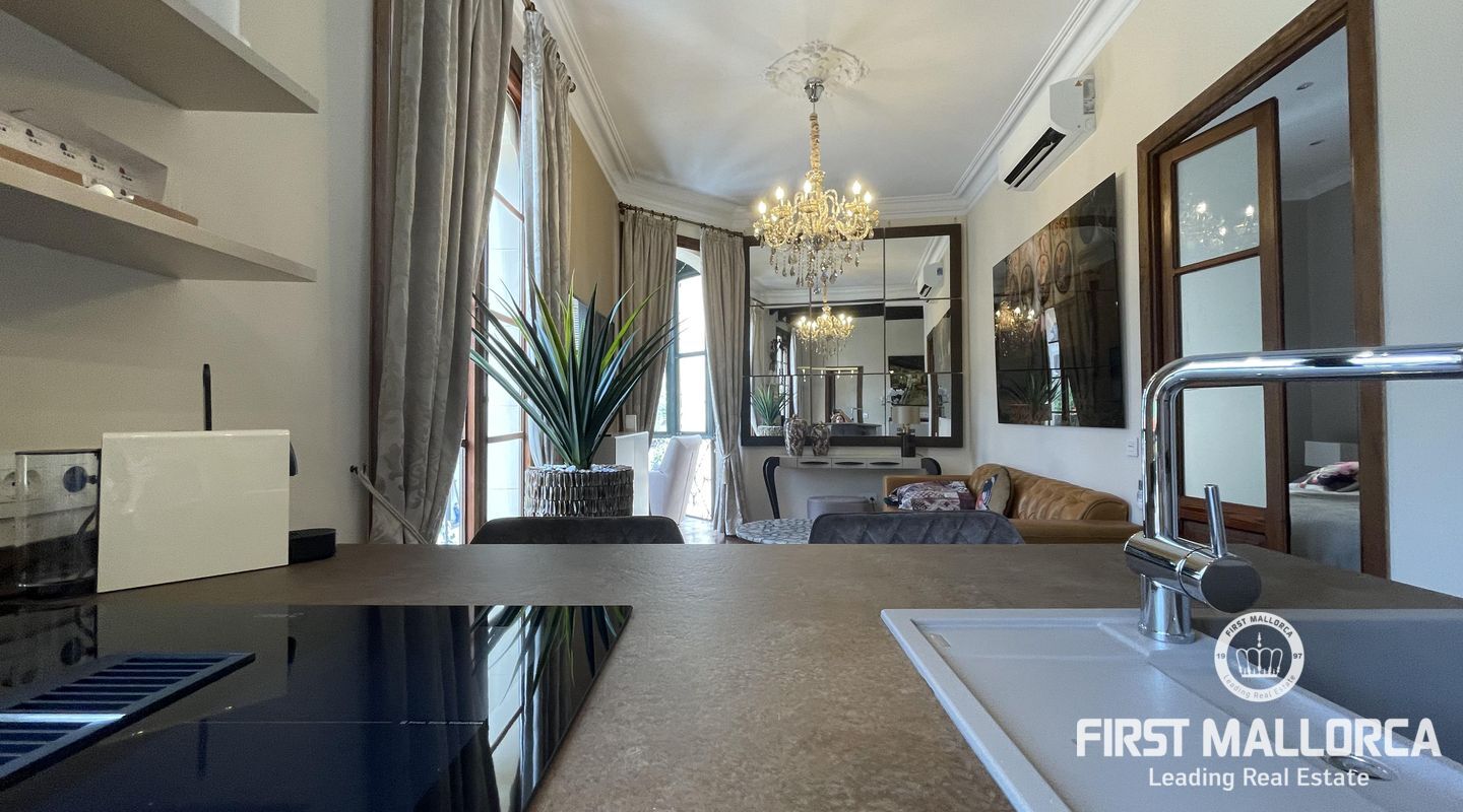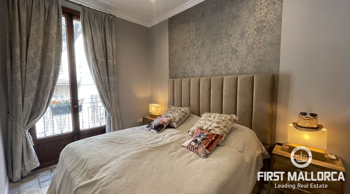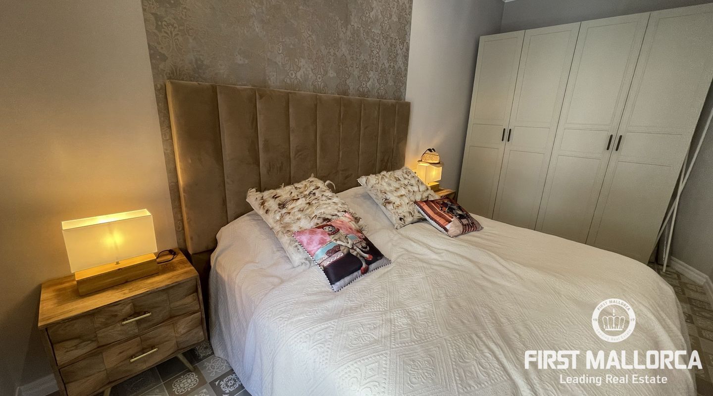 It has been renovated to a high standard and furnished with designer pieces (Chesterfield sofa, Lamborghini wallpaper, etc.). The living room opens onto a very modern, fully equipped fitted kitchen with access to a large Juliet balcony. One of the highlights is the glazed, round balcony with a comfortable contemporary rocking chair and views over Palma’s Old Town — the perfect spot to enjoy your morning coffee in peace and quiet.