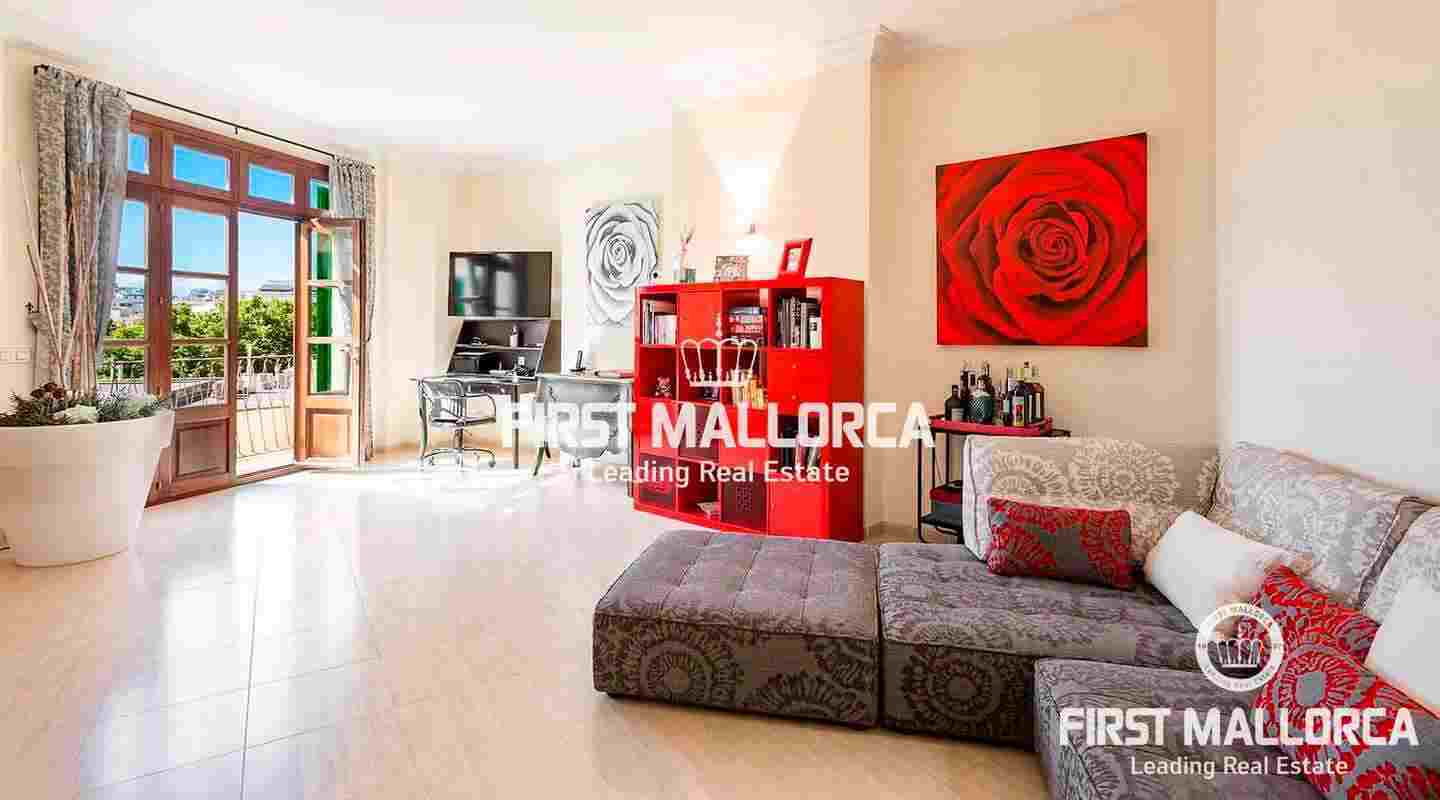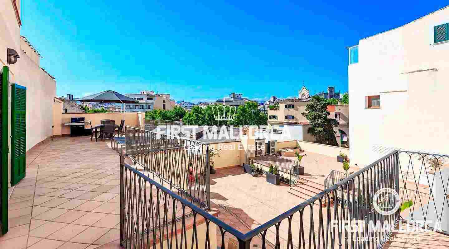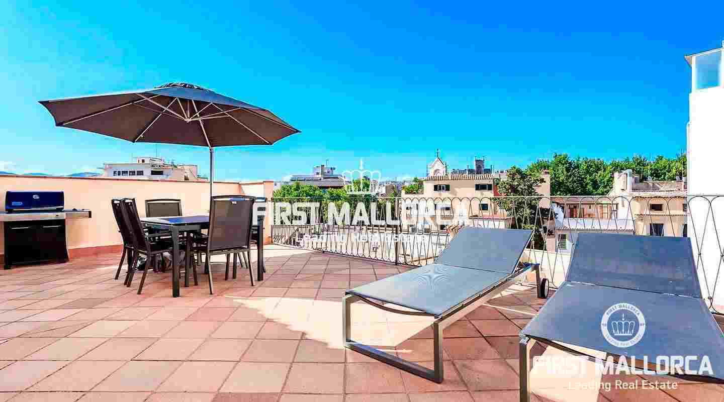 Un acogedor recibidor conduce al corazón del apartamento: el amplio salón-comedor bañado en luz que da a la terraza de 61 m². Además hay 2 habitaciones dobles con 2 baños y acceso a la terraza con zona de barbacoa. ¡Aquí podrá disfrutar del estilo de vida mediterráneo con bonitas vistas sobre el casco antiguo y experimentar Palma desde su lado más hermoso!