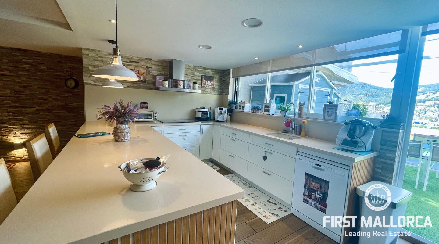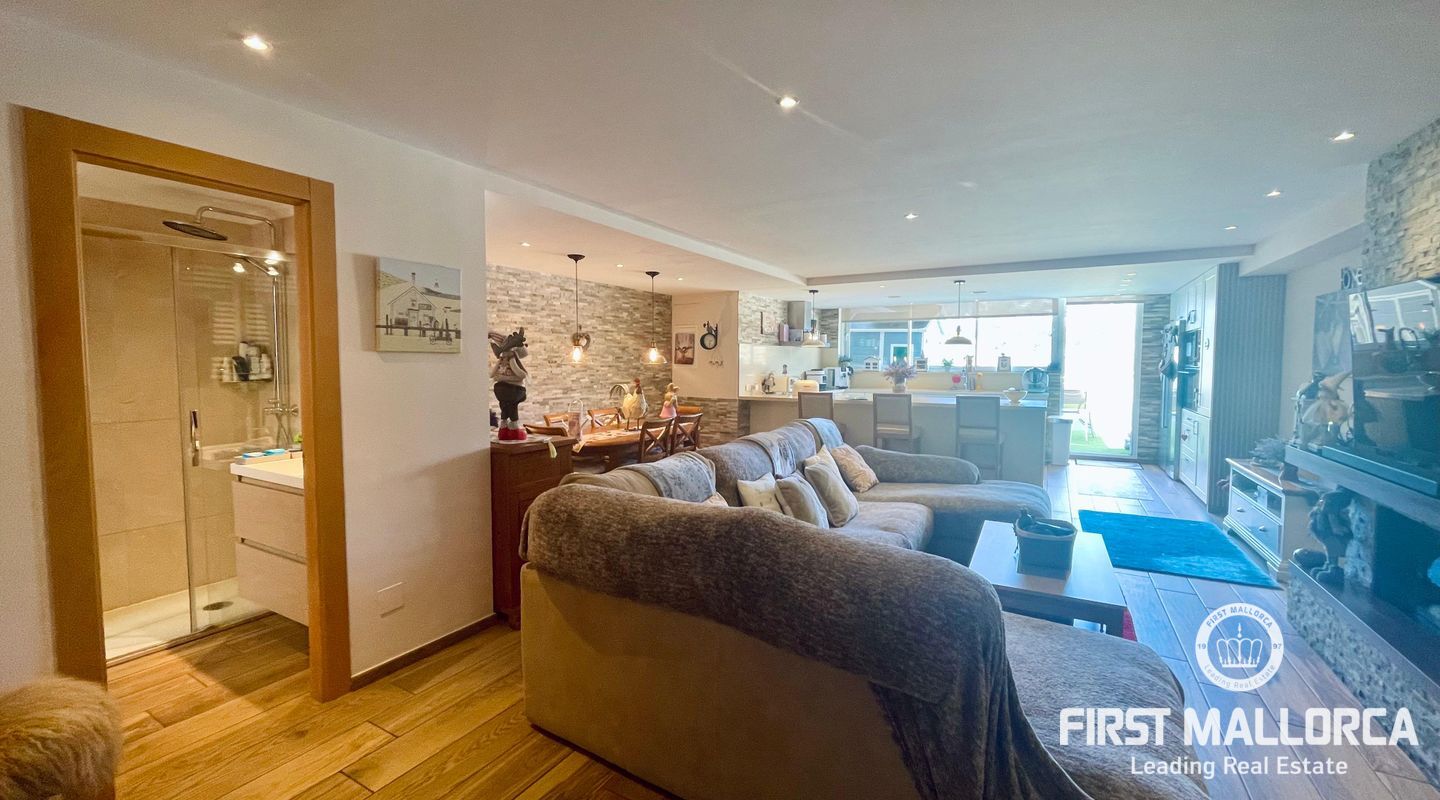 La reciente reforma es evidente en cada detalle: líneas limpias, materiales de calidad y un gusto refinado que combina modernidad y calidez. El salón y la cocina forman un único gran espacio abierto, perfectamente distribuido, donde la chimenea de gas se convierte en protagonista en las noches más frescas, creando una atmósfera íntima y relajada.