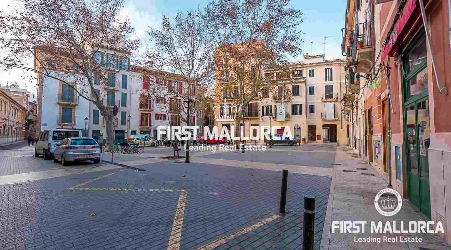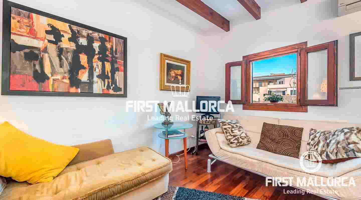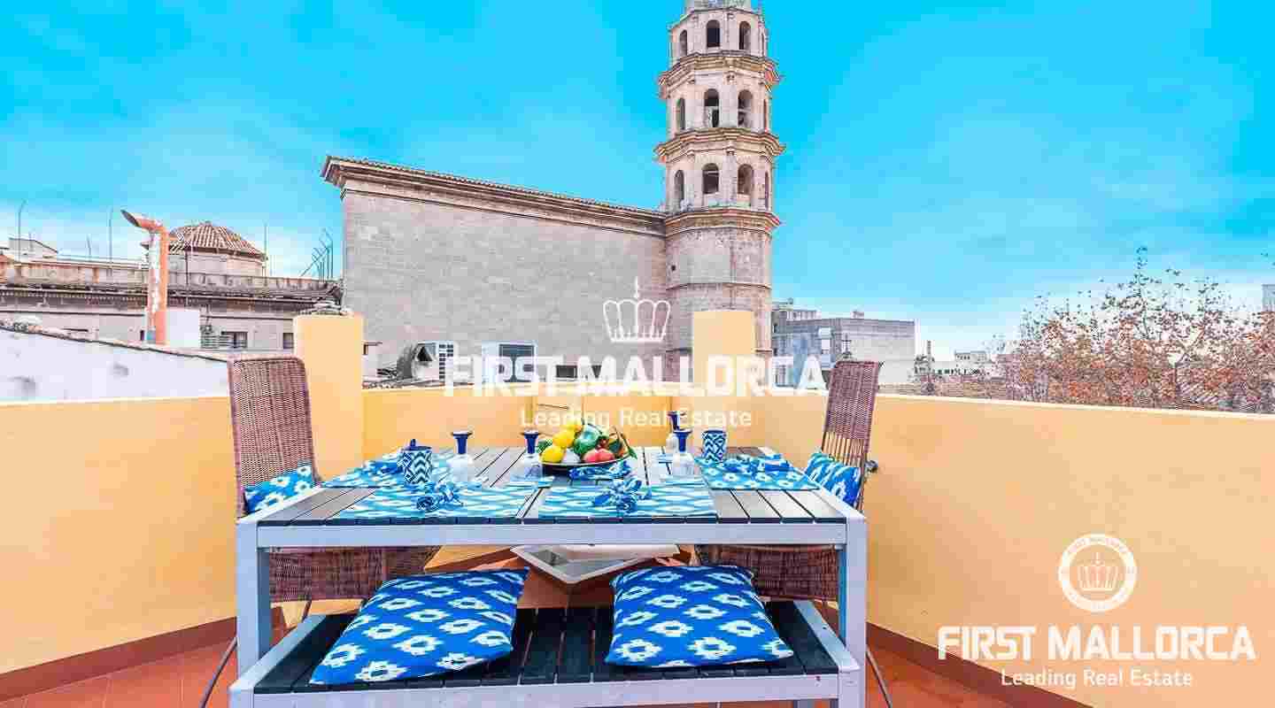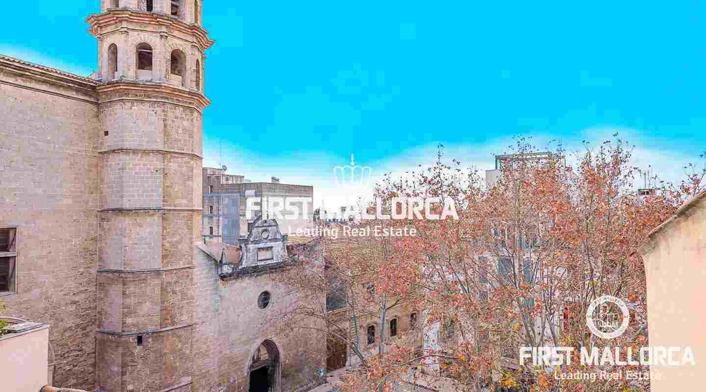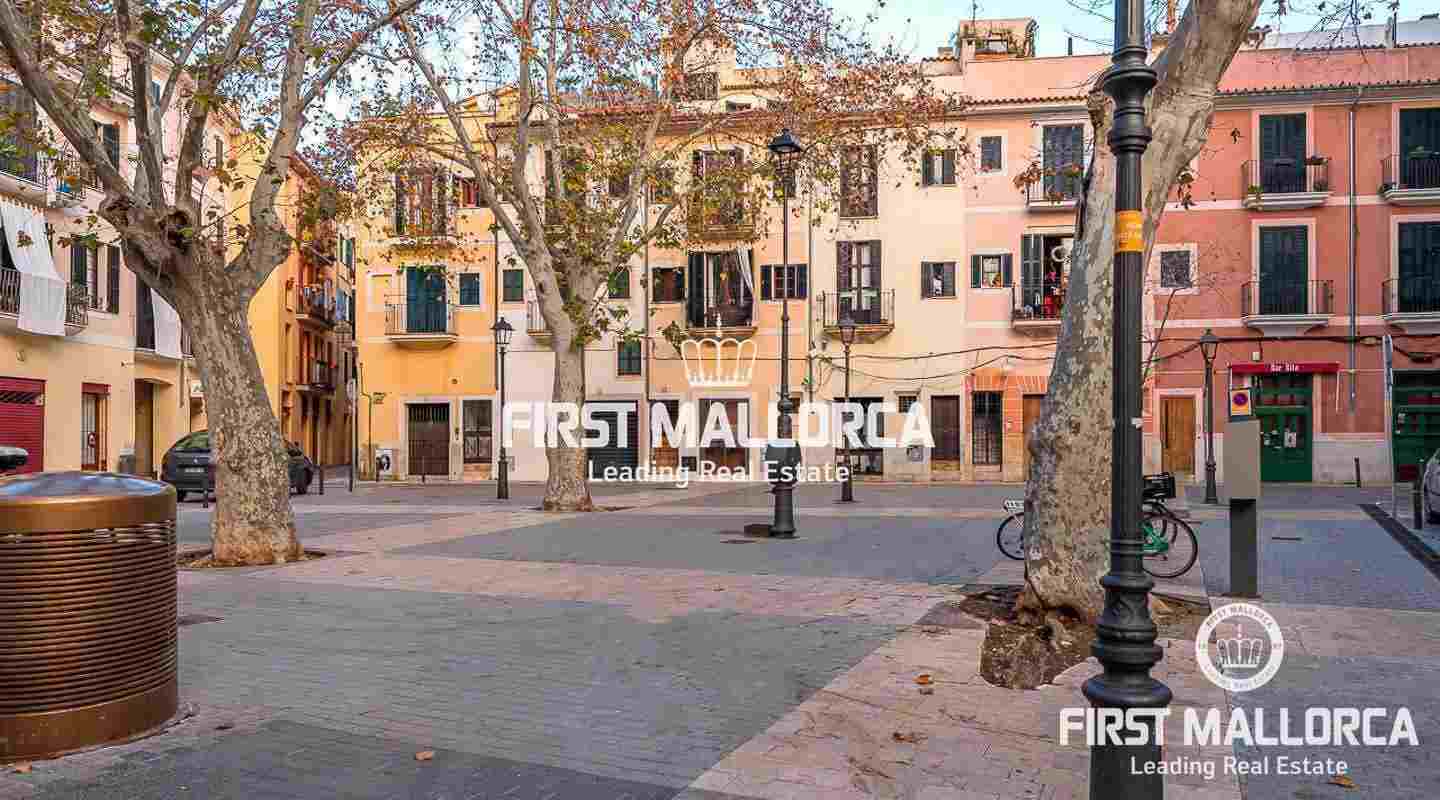Este ático se encuentra en un edificio del siglo XIX en una ubicación céntrica junto a una plaza tranquila en el casco antiguo. La propiedad goza de una preciosa azotea con impresionantes vistas sobre los tejados de Palma de Mallorca y de auténticos elementos perfectamente conservados, como el techo con clásicas vigas de madera.