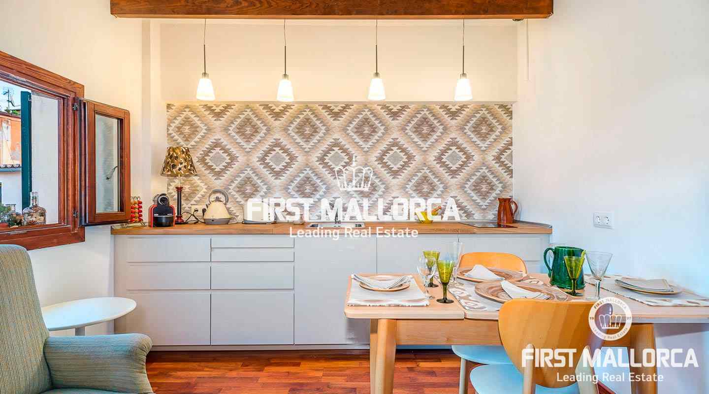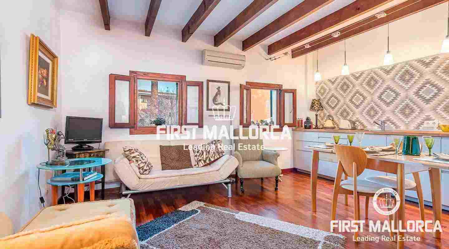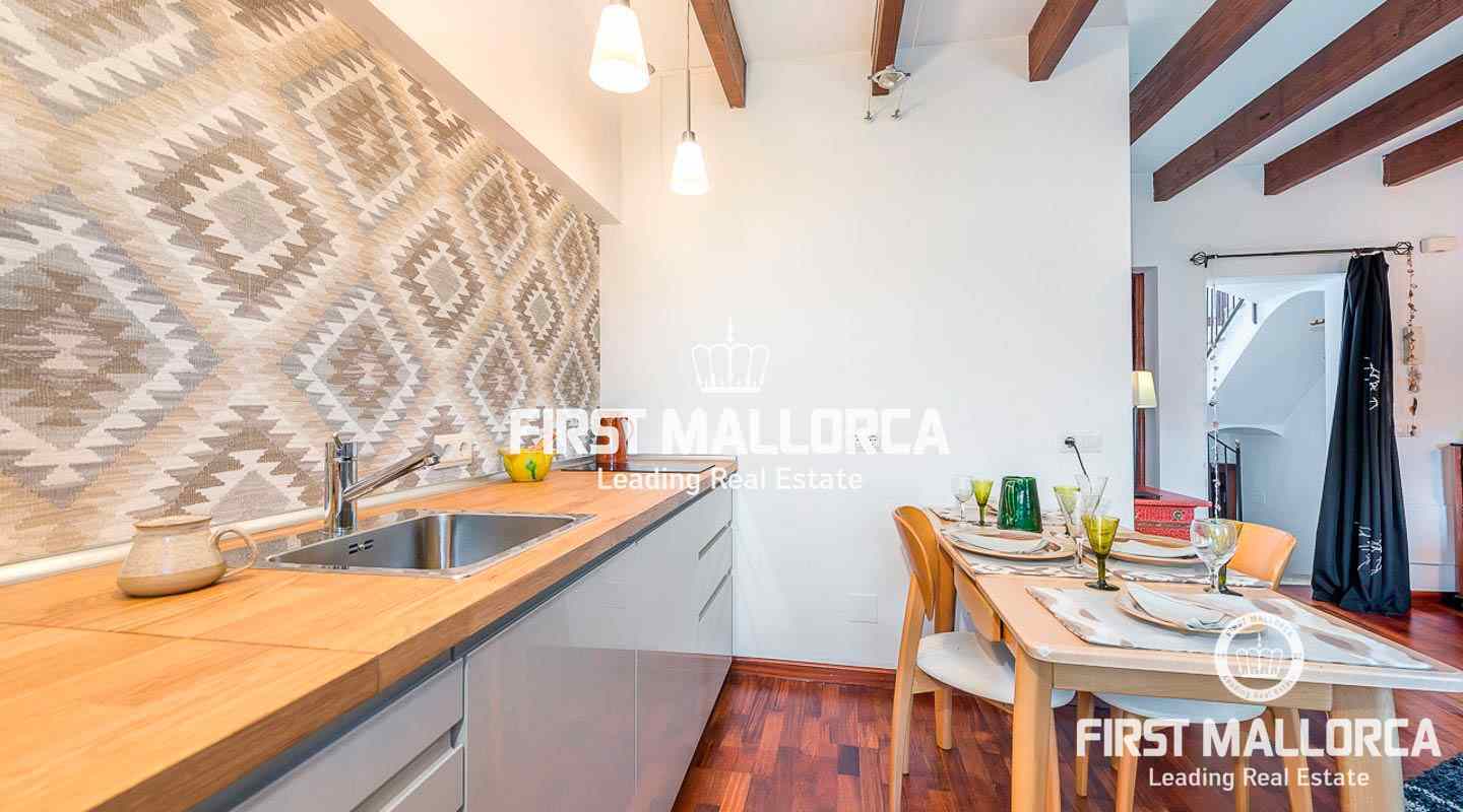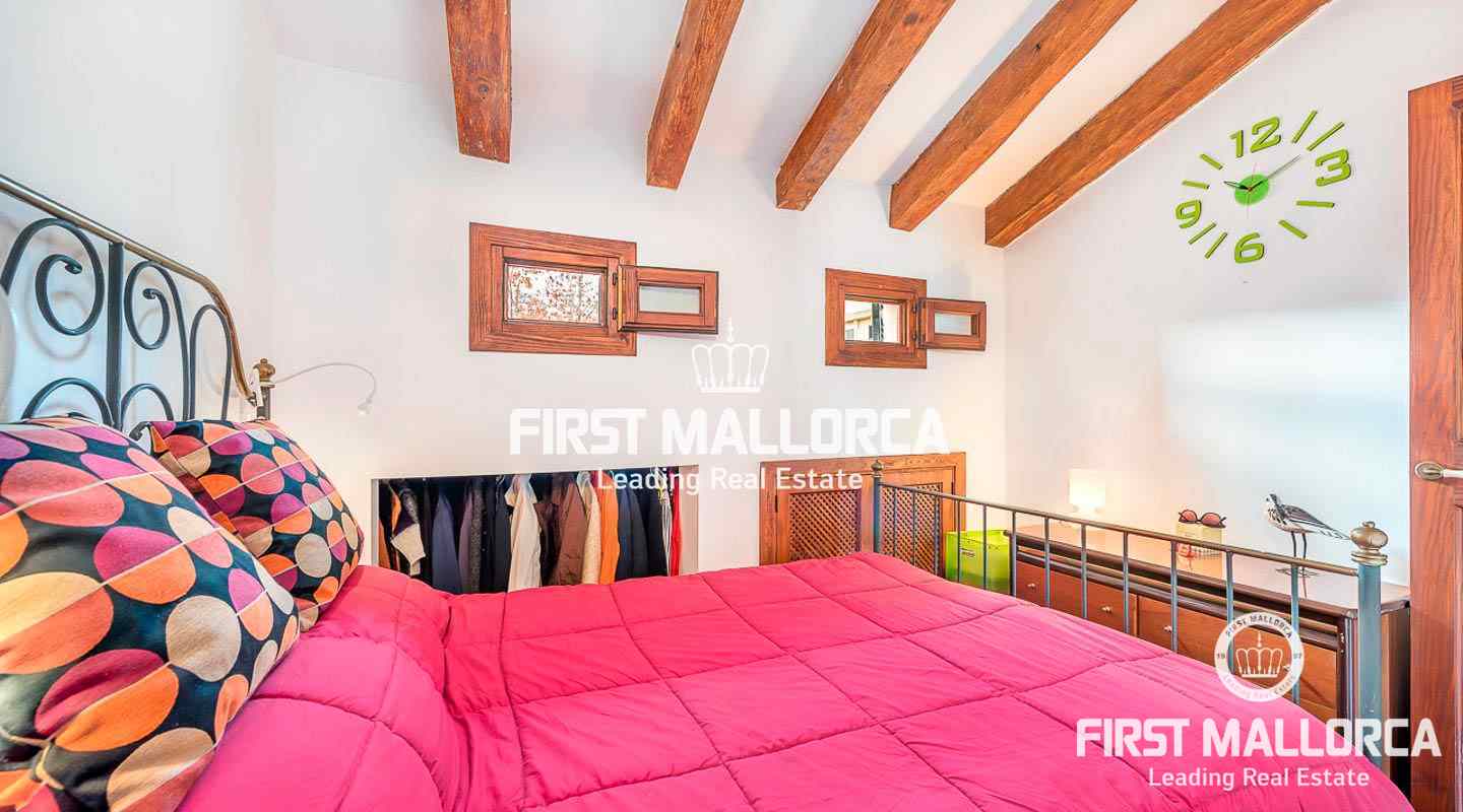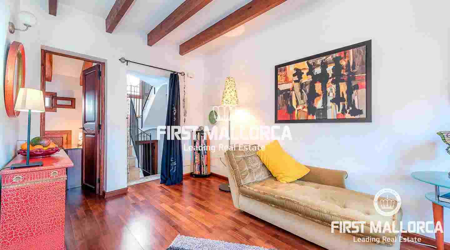 Este ático se encuentra en un edificio del siglo XIX en una ubicación céntrica junto a una plaza tranquila en el casco antiguo. La propiedad goza de una preciosa azotea con impresionantes vistas sobre los tejados de Palma de Mallorca y de auténticos elementos perfectamente conservados, como el techo con clásicas vigas de madera.