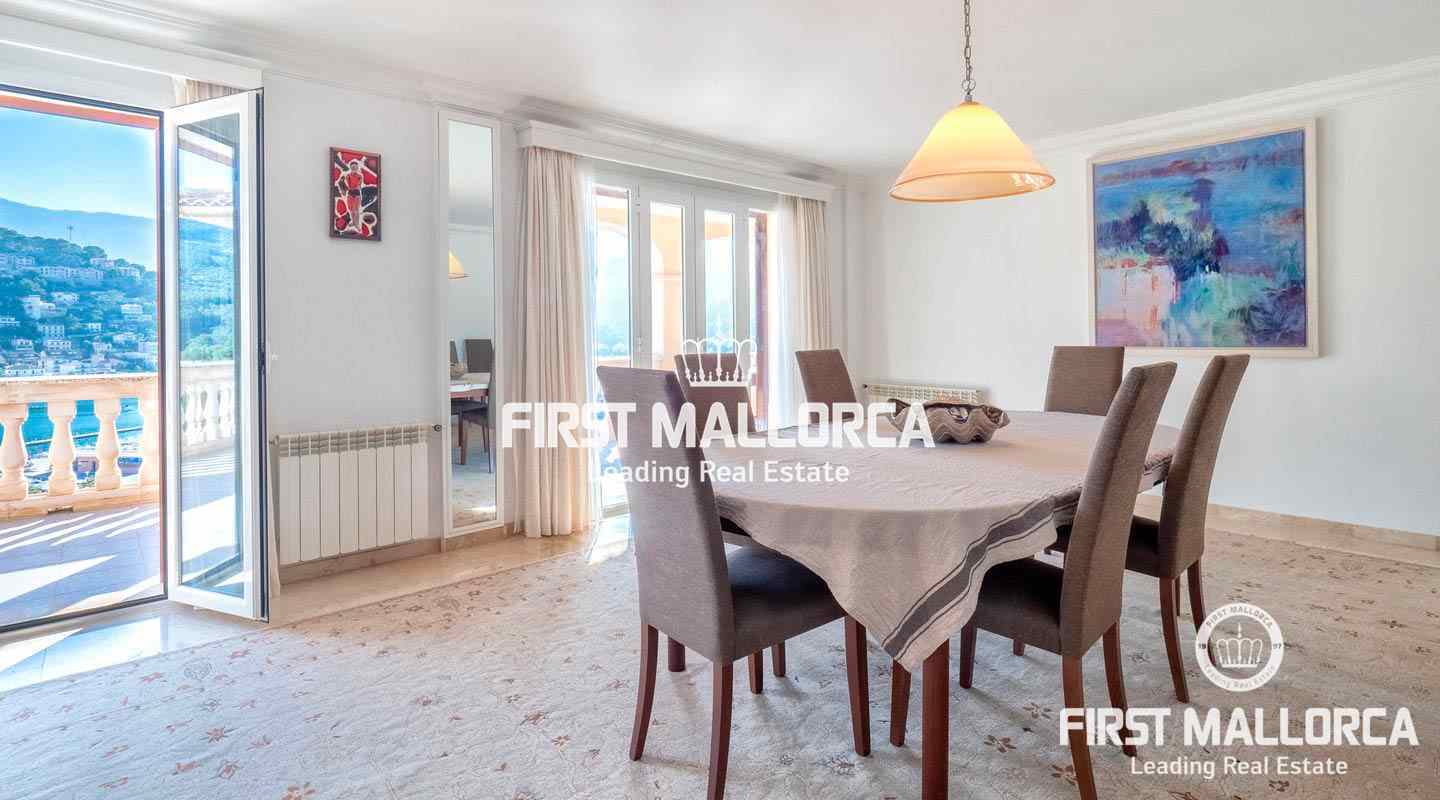 En una superficie de aproximadamente 225 m² sobre una planta, la propiedad dispone de un generoso salón-comedor, una moderna cocina totalmente equipada, 5 dormitorios, 2 baños (uno en suite), un lavadero y varios trasteros. Además hay una gran terraza parcialmente cubierta de 40 m² con vistas al mar. Gracias a la orientación sur podrá disfrutar de muchas horas de sol incluso en invierno. El ático cuenta con instalaciones y acabados de primera calidad, incluyendo aire acondicionado frío/ calor, calefacción central de gas, ventanas de aluminio con doble acristalamiento y suelos de mármol. También hay 2 plazas de aparcamiento. Este ático es una fantástica propiedad con una privilegiada ubicación en la costa oeste de Mallorca.