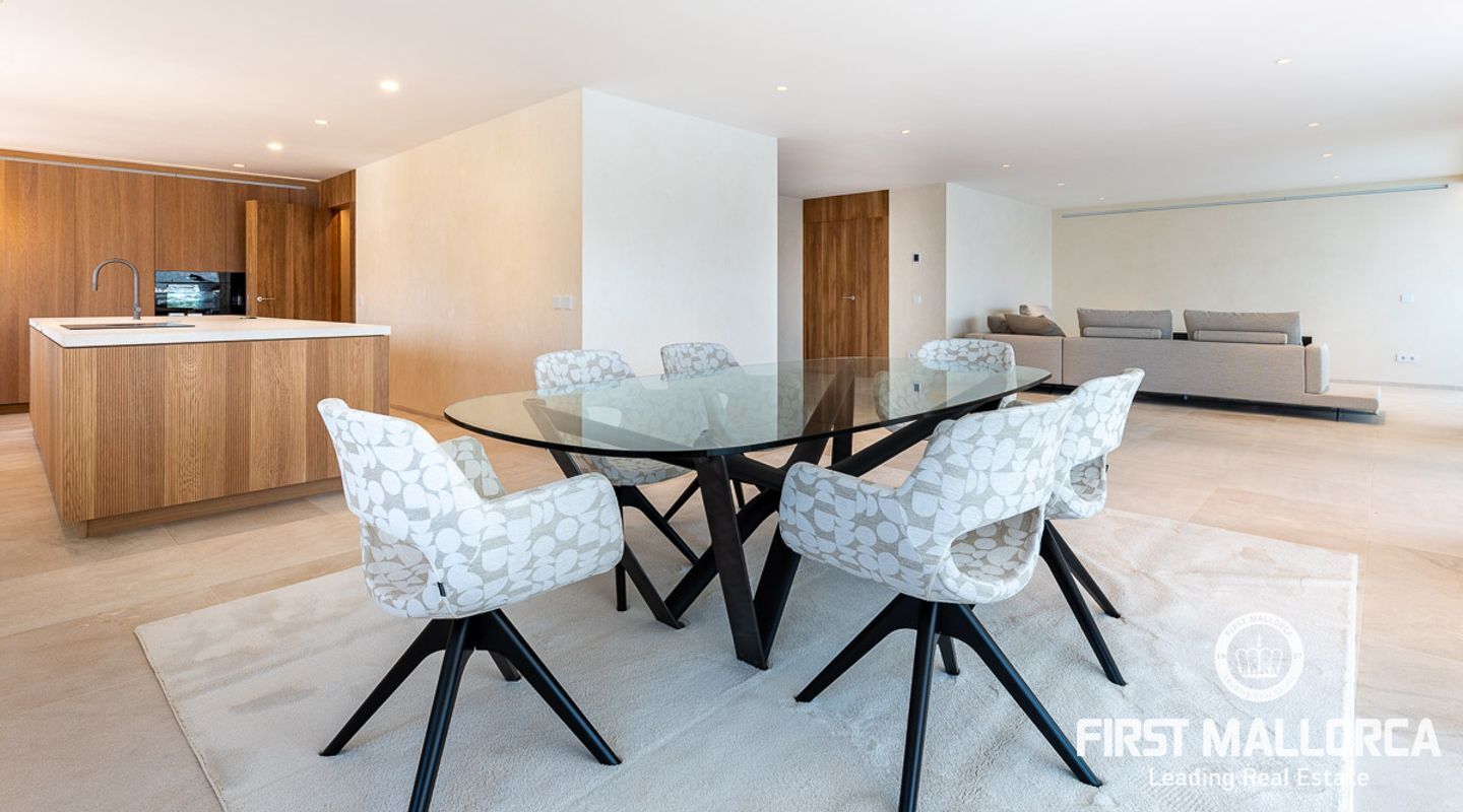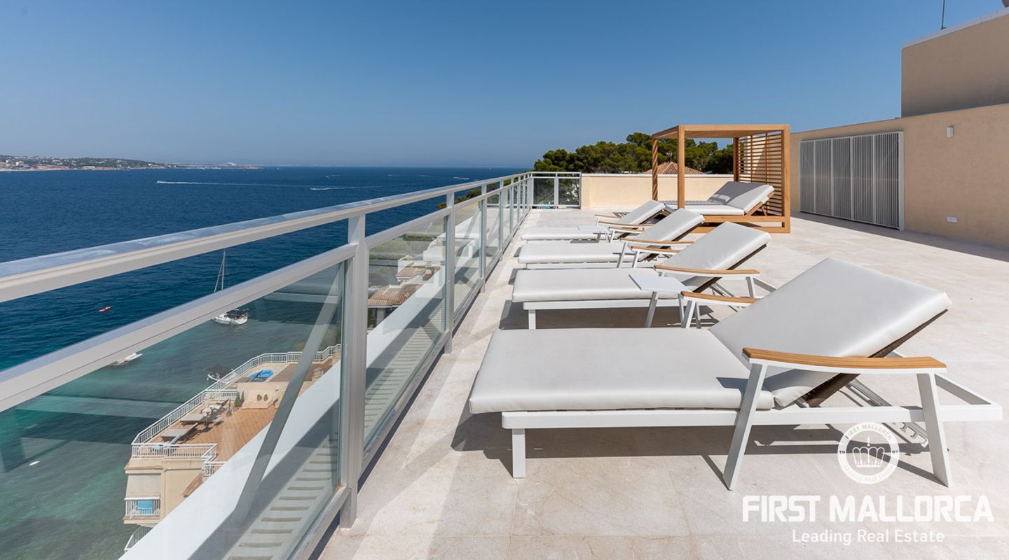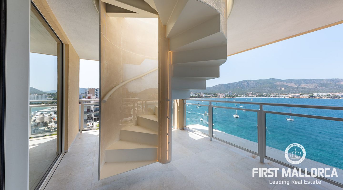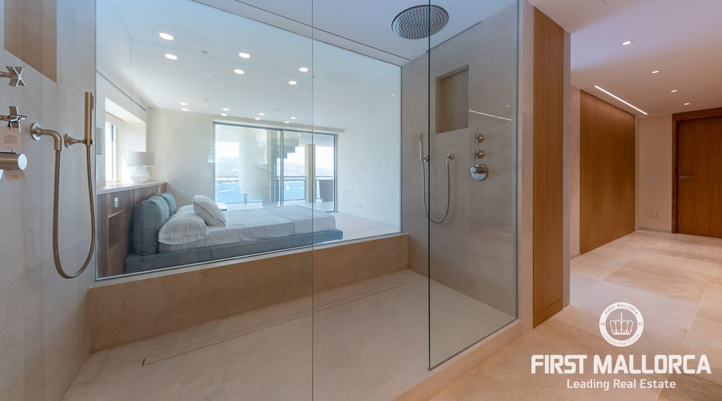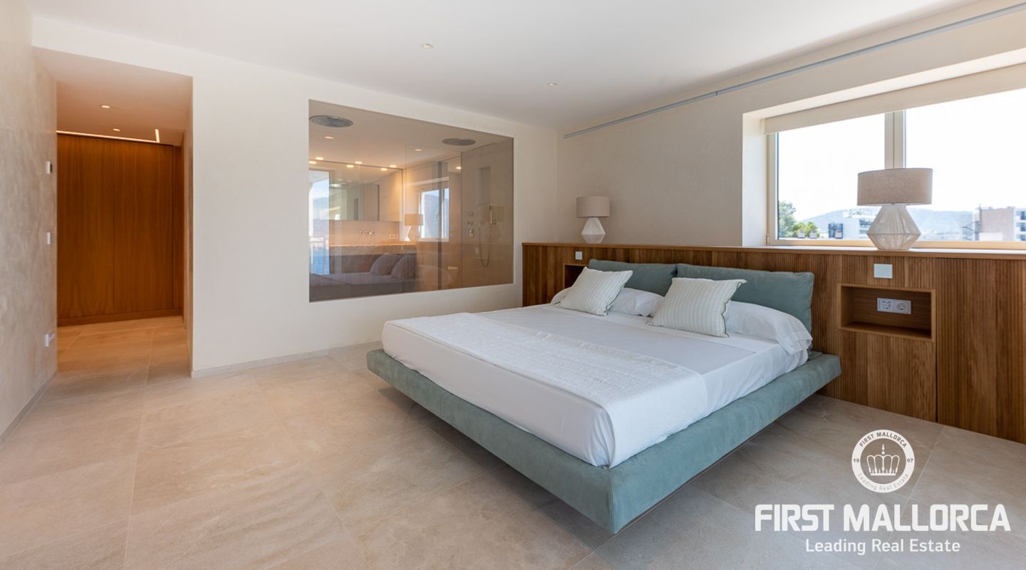 Se distribuye en cocina abierta, comedor y sala construidos con hermosa piedra y madera de roble, el dormitorio principal también se encuentra al frente del apartamento con un vestidor también hecho con madera de roble, un amplio baño con detalles en piedra y una gran ventana inteligente que puede elegir para que se esmerile. Toda el área frontal lo llevará a la amplia terraza que también lo invitará a subir una escalera de caracol flotante con luces LED a la azotea con cocina al aire libre y vistas panorámicas increíbles al mar. Si miras cuidadosamente, puedes ver la Catedral de Palma hasta el Puig de Ros, en la playa de Palmanova verás a las celebridades anclando justo en frente con sus yates privados de millones de dólares. Algunos de ellos son Cristiano Ronaldo, Brad Pitt, Leonardo DiCaprio y Tom Hanks, por nombrar algunos.