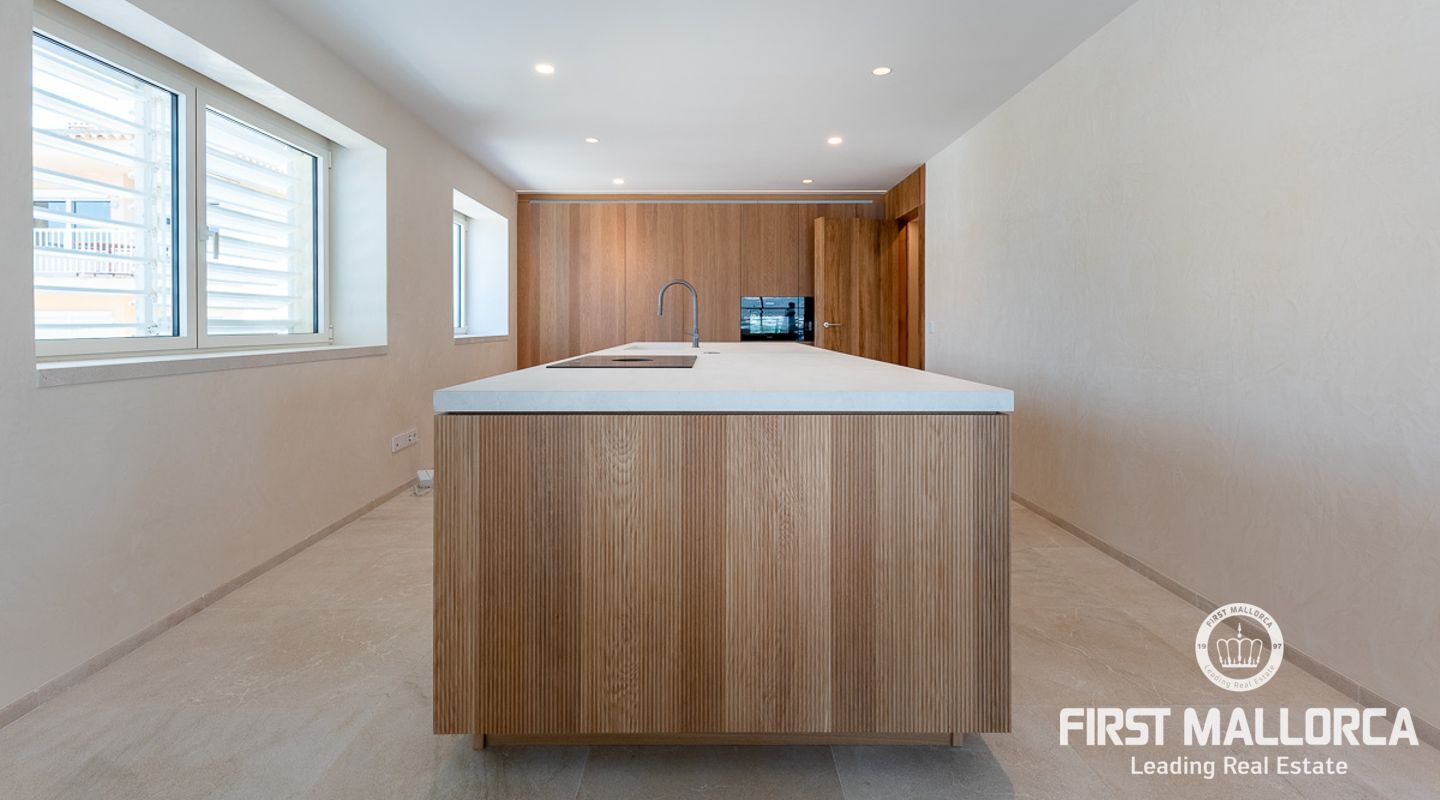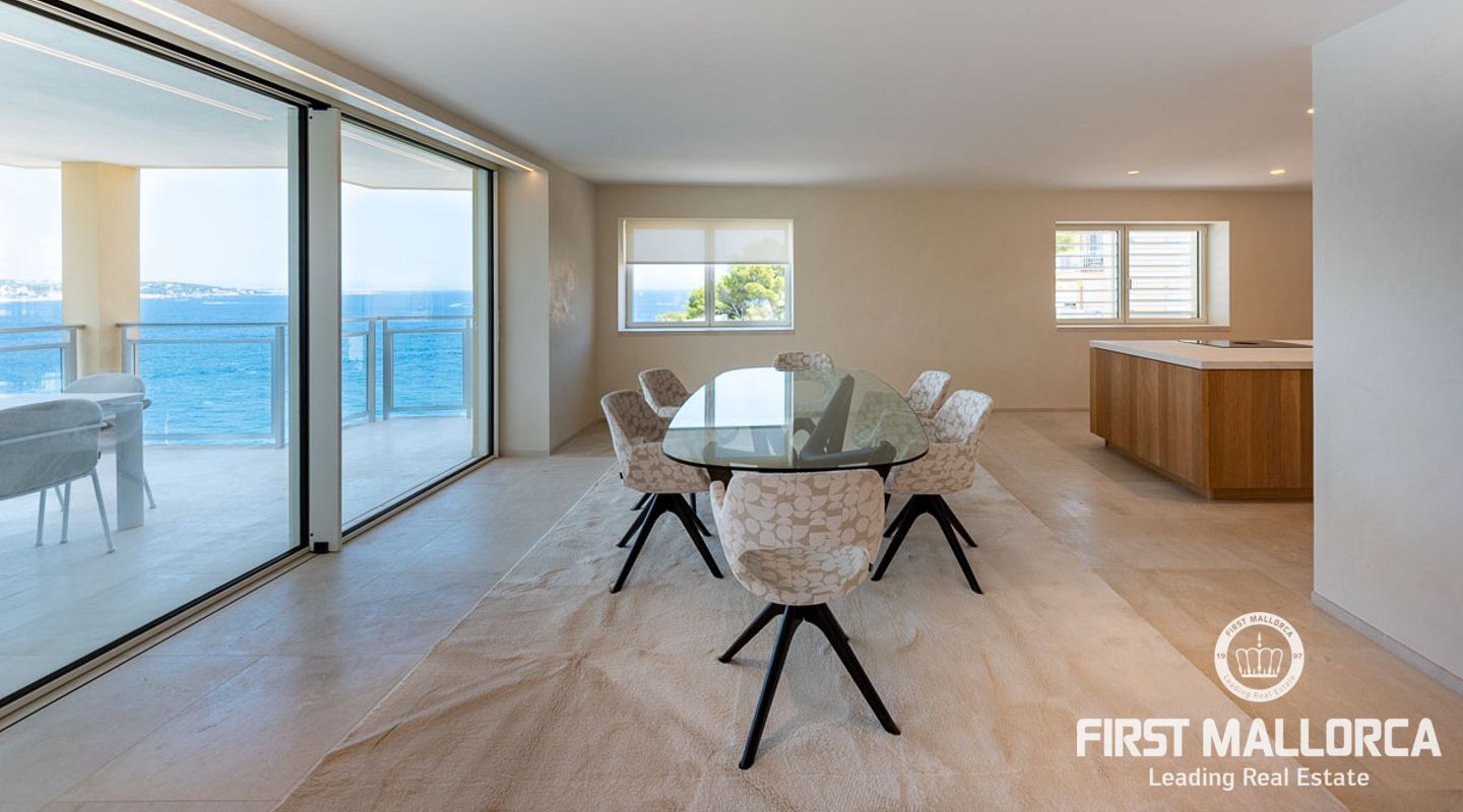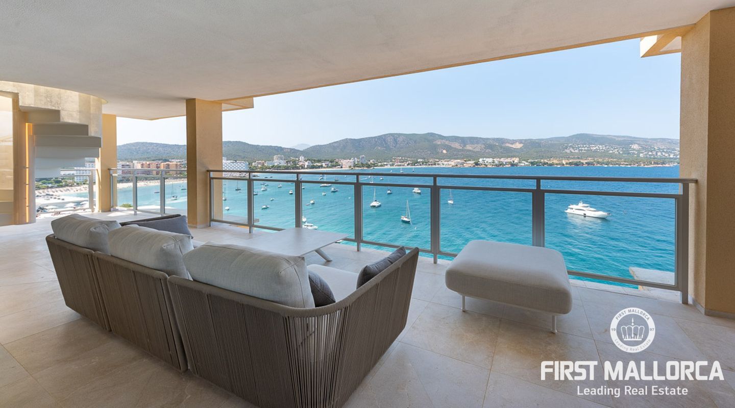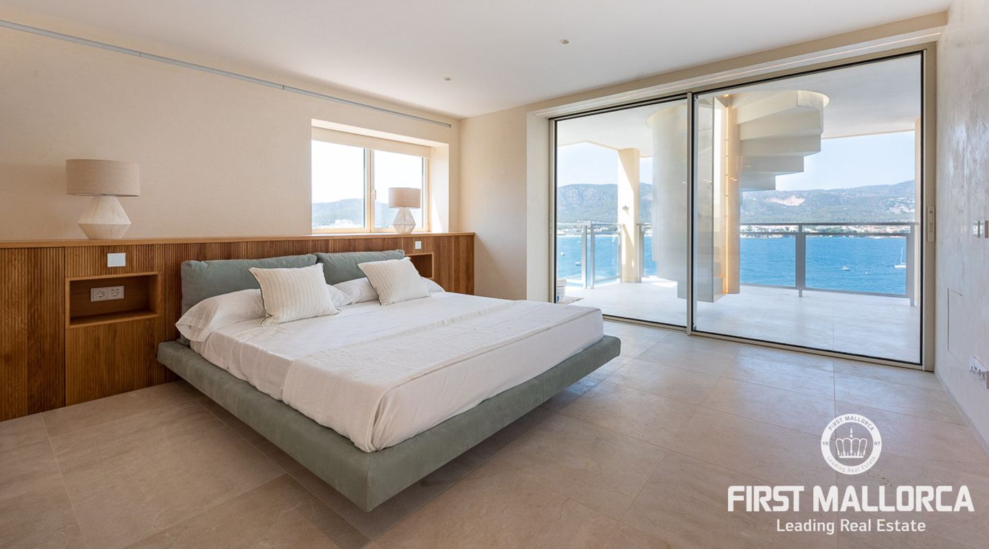 Se distribuye en cocina abierta, comedor y sala construidos con hermosa piedra y madera de roble, el dormitorio principal también se encuentra al frente del apartamento con un vestidor también hecho con madera de roble, un amplio baño con detalles en piedra y una gran ventana inteligente que puede elegir para que se esmerile. Toda el área frontal lo llevará a la amplia terraza que también lo invitará a subir una escalera de caracol flotante con luces LED a la azotea con cocina al aire libre y vistas panorámicas increíbles al mar. Si miras cuidadosamente, puedes ver la Catedral de Palma hasta el Puig de Ros, en la playa de Palmanova verás a las celebridades anclando justo en frente con sus yates privados de millones de dólares. Algunos de ellos son Cristiano Ronaldo, Brad Pitt, Leonardo DiCaprio y Tom Hanks, por nombrar algunos.