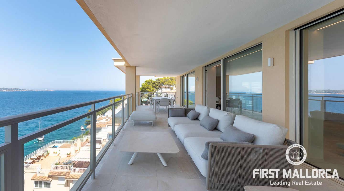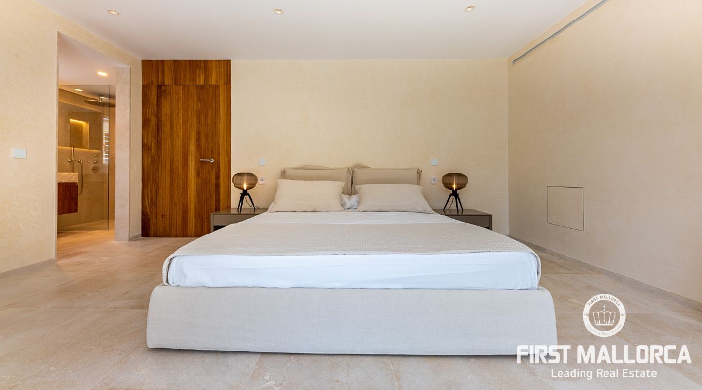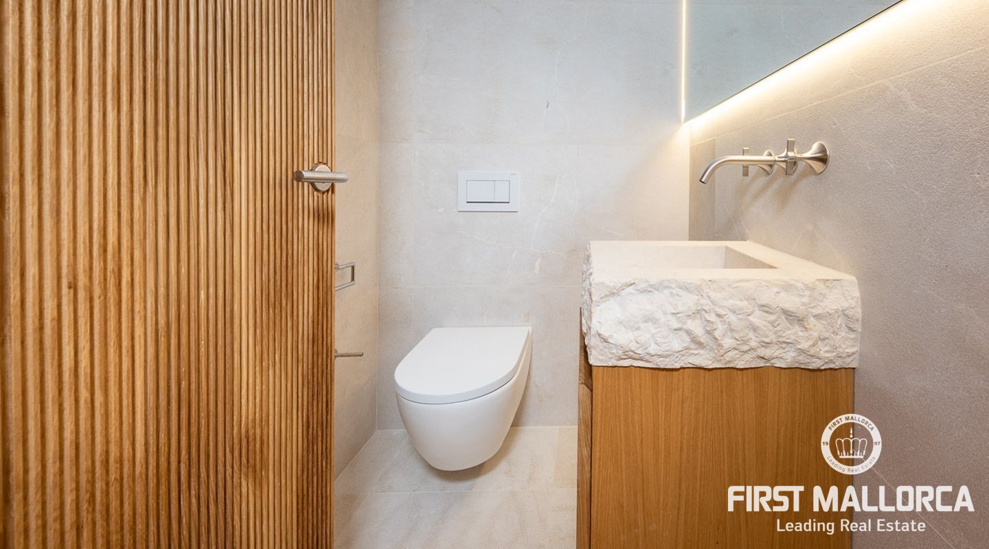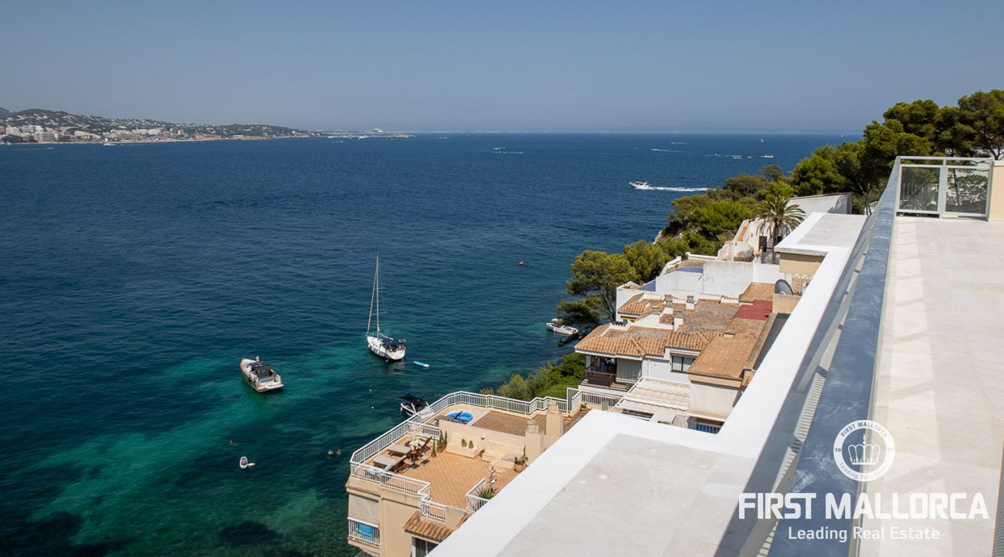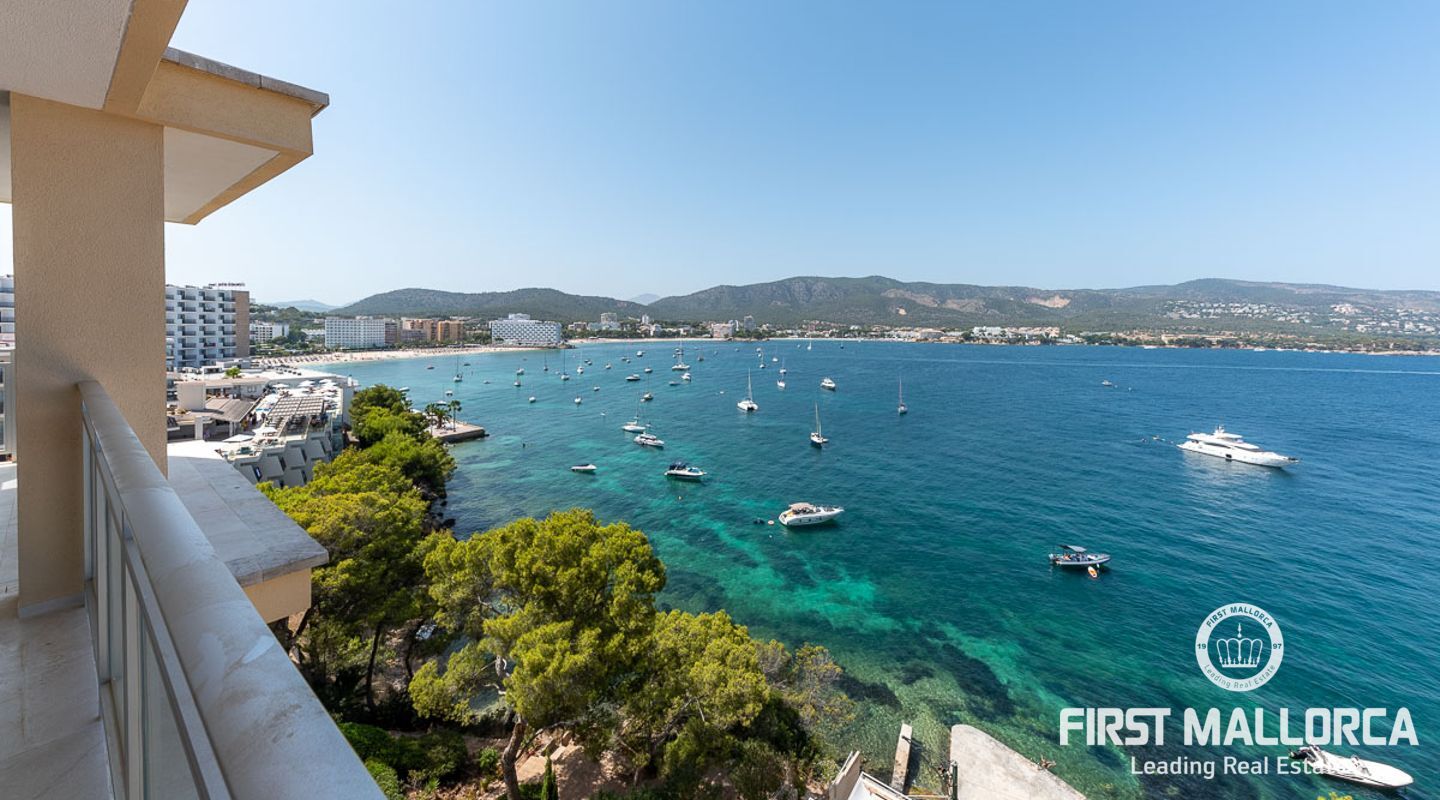 Se distribuye en cocina abierta, comedor y sala construidos con hermosa piedra y madera de roble, el dormitorio principal también se encuentra al frente del apartamento con un vestidor también hecho con madera de roble, un amplio baño con detalles en piedra y una gran ventana inteligente que puede elegir para que se esmerile. Toda el área frontal lo llevará a la amplia terraza que también lo invitará a subir una escalera de caracol flotante con luces LED a la azotea con cocina al aire libre y vistas panorámicas increíbles al mar. Si miras cuidadosamente, puedes ver la Catedral de Palma hasta el Puig de Ros, en la playa de Palmanova verás a las celebridades anclando justo en frente con sus yates privados de millones de dólares. Algunos de ellos son Cristiano Ronaldo, Brad Pitt, Leonardo DiCaprio y Tom Hanks, por nombrar algunos.