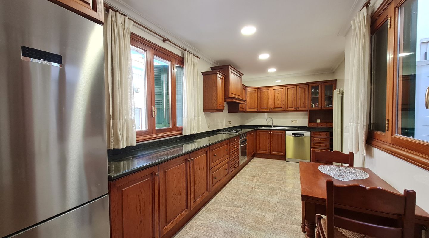 En la primera planta encontramos un espacioso apartamento de aproximadamente 180 m² con tres habitaciones (posibilidad de una cuarta), dos baños completos, gran salón comedor, cocina completamente equipada y un encantador patio interior. La vivienda cuenta con primeras calidades, maderas nobles, aire acondicionado y calefacción por radiadores.
