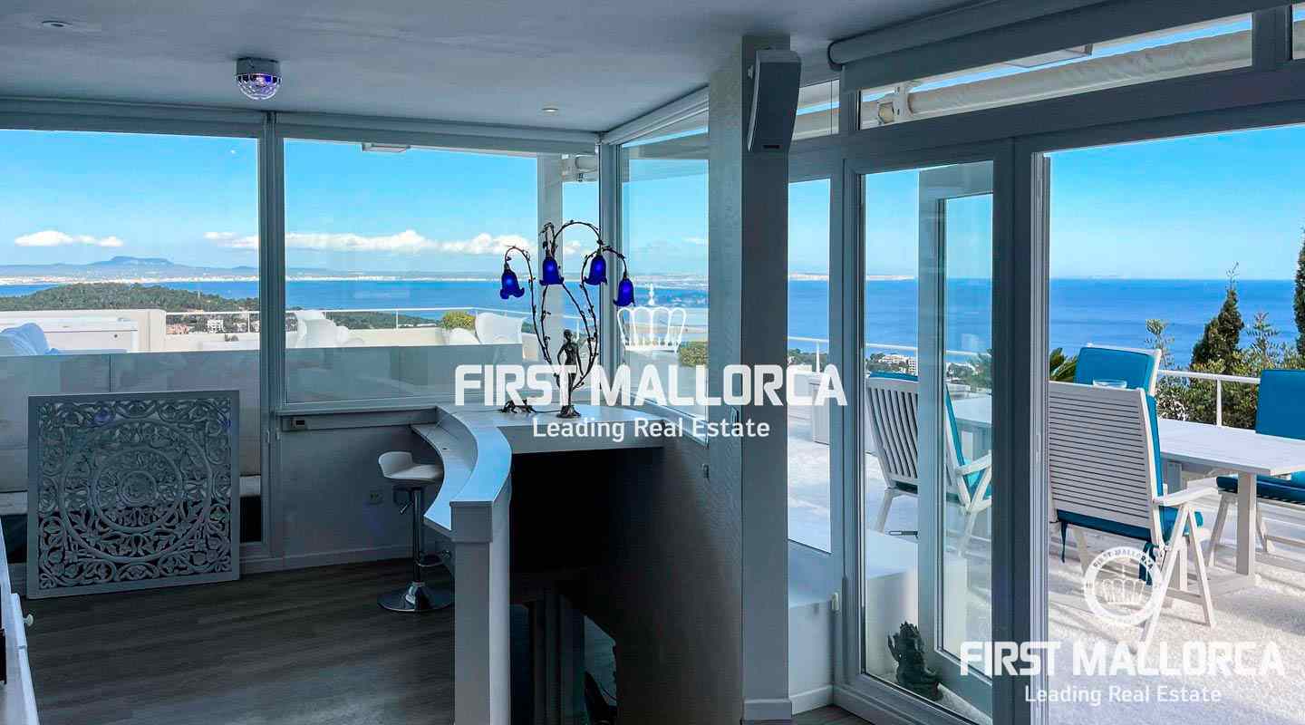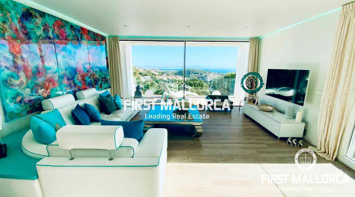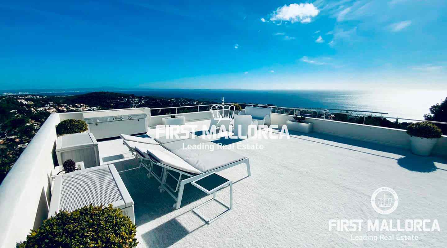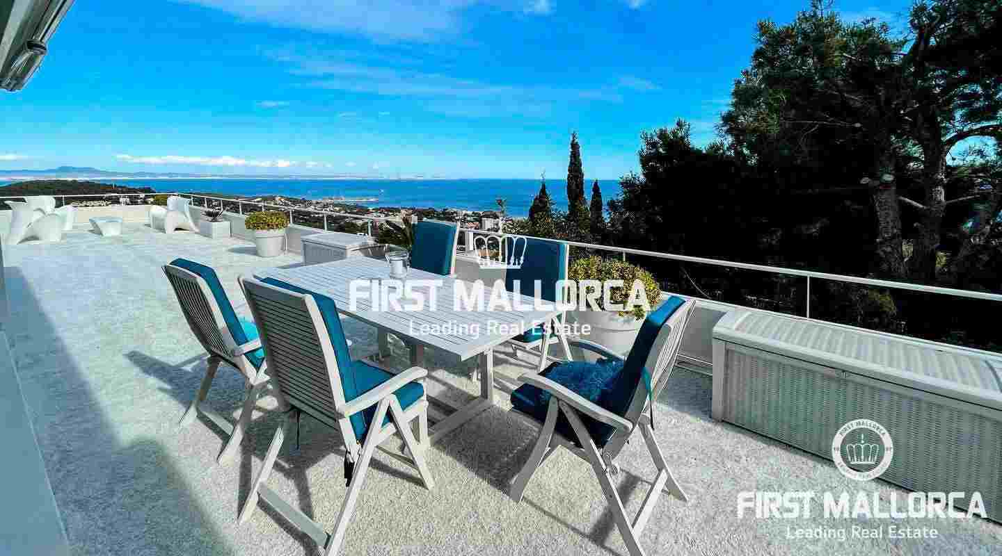 Esta luminosa y luminosa villa con impresionantes vistas al mar de 180 grados se encuentra en una zona tranquila de Costa d'en Blanes. La propiedad ofrece una vista del puerto de lujo de Puerto Portals y sobre el mar a Palma. Puede disfrutar de la fantástica vista tanto desde el interior como desde el exterior: la luminosa sala de estar tiene ventanas de piso a techo que se pueden abrir parcialmente y dan acceso a una terraza, por lo que la transición del interior al exterior es suave. Los 4 dormitorios de la casa tienen vistas al mar de la bahía de Palma y desde la cama se puede ver el amanecer. También hay una azotea de casi 150 metros cuadrados, que ofrece una vista panorámica del mar y las montañas. Aquí puedes literalmente celebrar el estilo de vida mediterráneo al aire libre.
