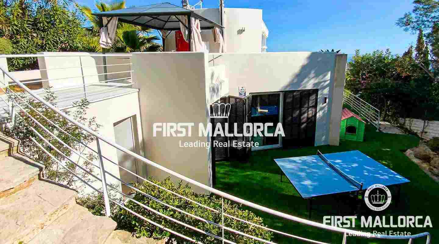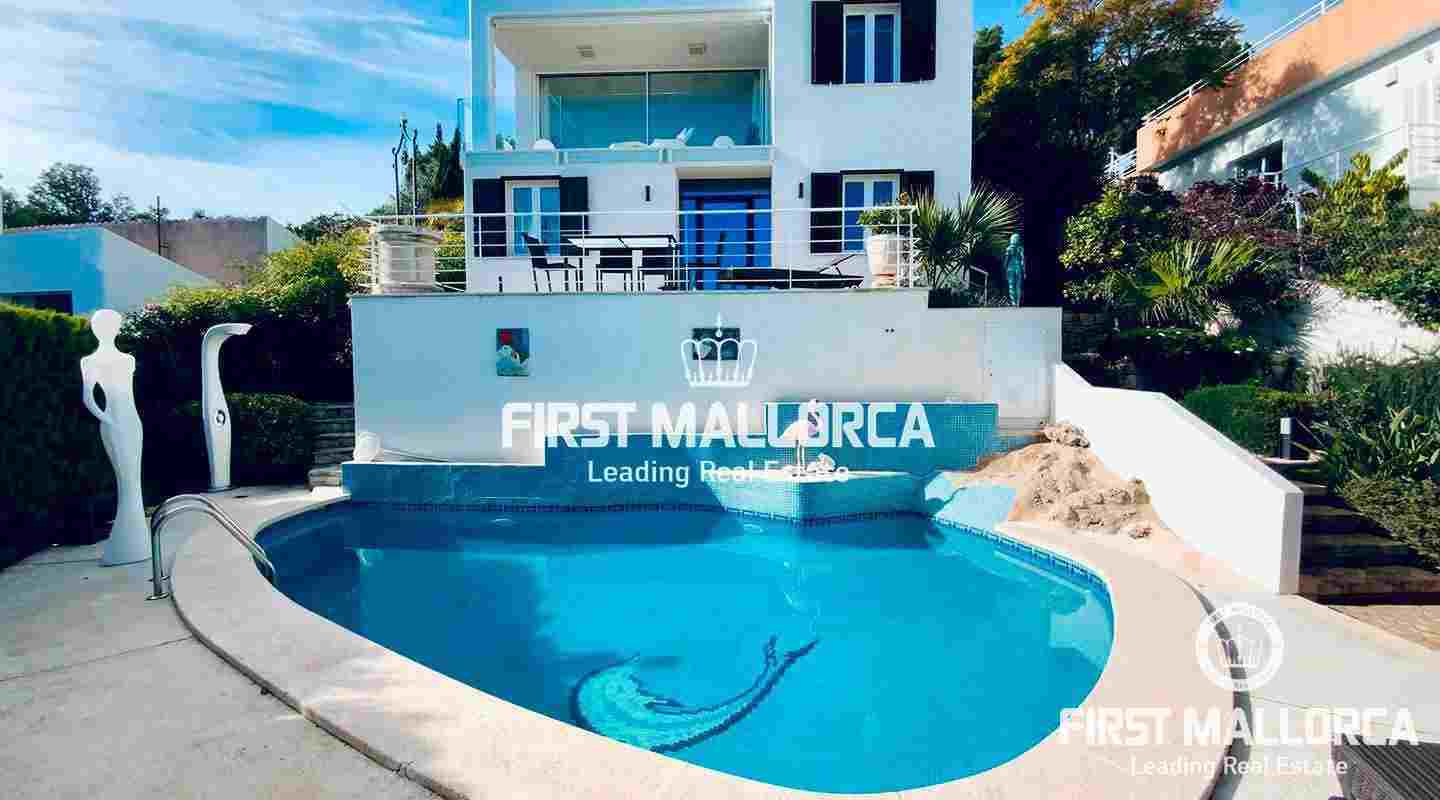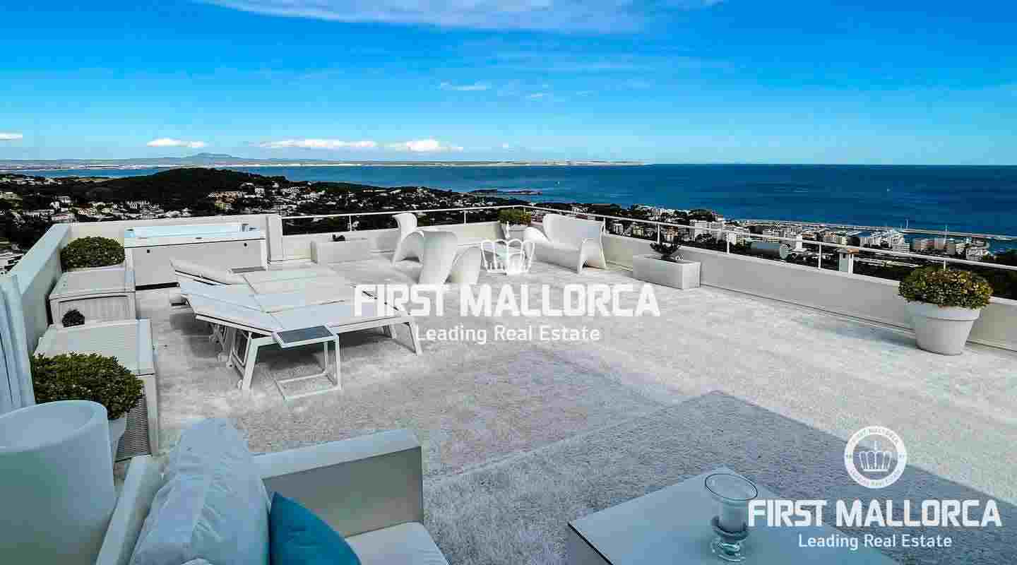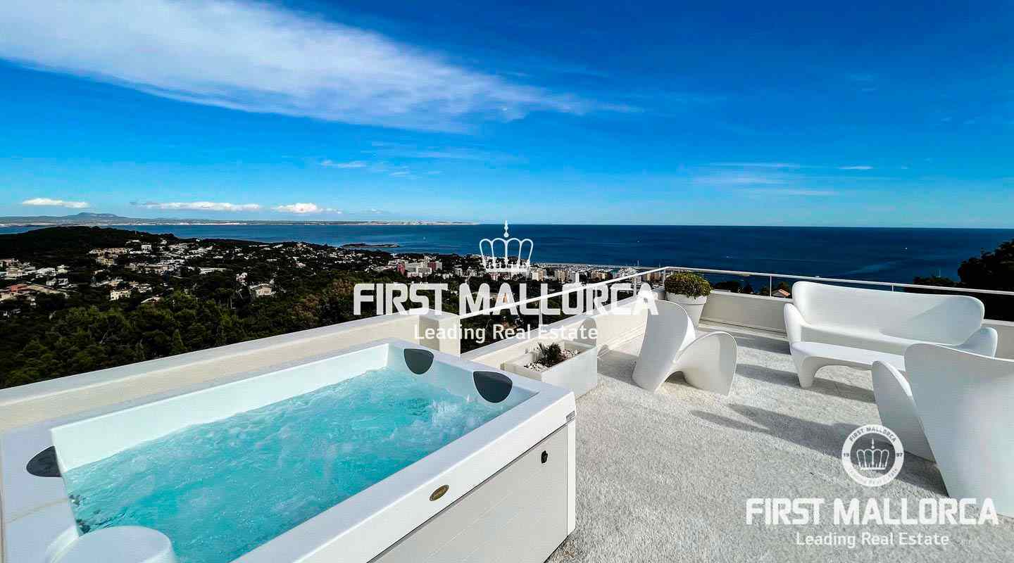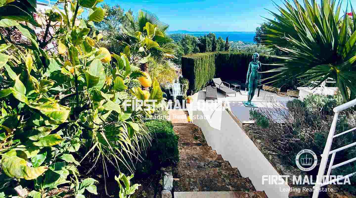 Esta luminosa y luminosa villa con impresionantes vistas al mar de 180 grados se encuentra en una zona tranquila de Costa d'en Blanes. La propiedad ofrece una vista del puerto de lujo de Puerto Portals y sobre el mar a Palma. Puede disfrutar de la fantástica vista tanto desde el interior como desde el exterior: la luminosa sala de estar tiene ventanas de piso a techo que se pueden abrir parcialmente y dan acceso a una terraza, por lo que la transición del interior al exterior es suave. Los 4 dormitorios de la casa tienen vistas al mar de la bahía de Palma y desde la cama se puede ver el amanecer. También hay una azotea de casi 150 metros cuadrados, que ofrece una vista panorámica del mar y las montañas. Aquí puedes literalmente celebrar el estilo de vida mediterráneo al aire libre.