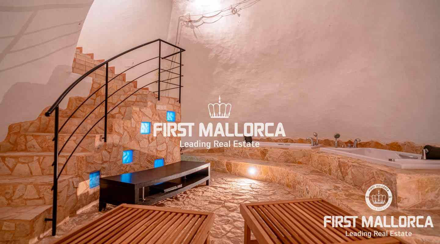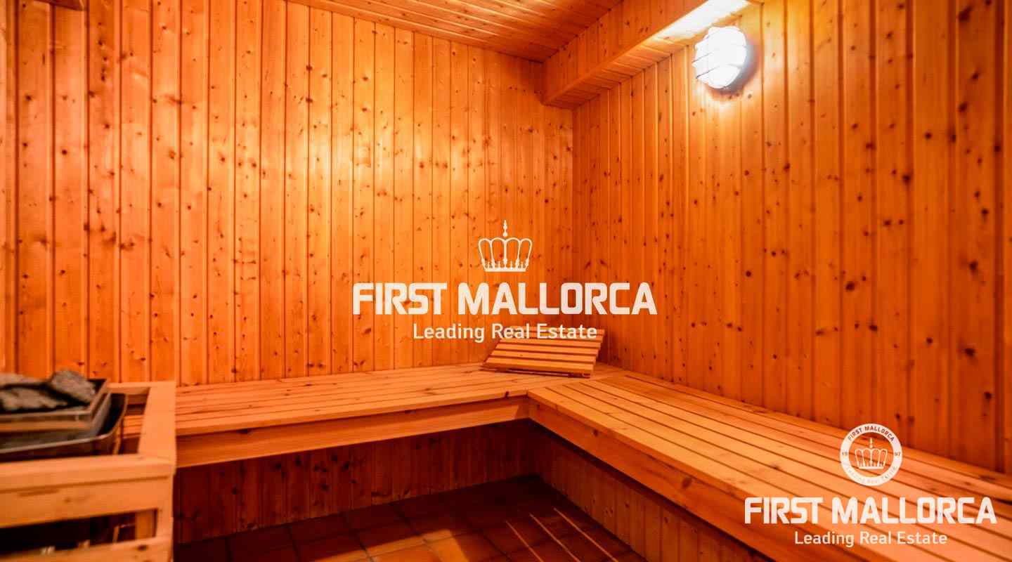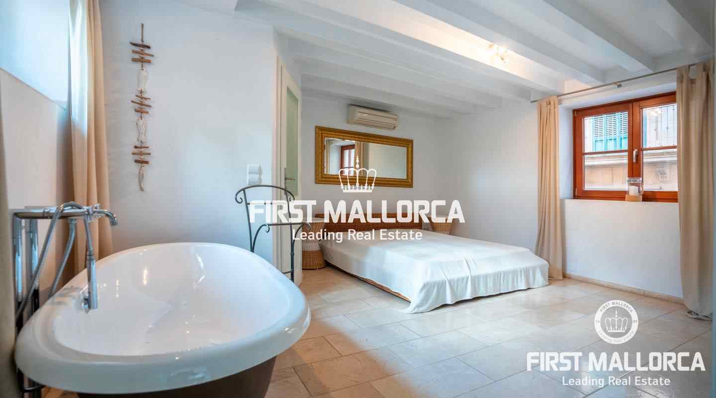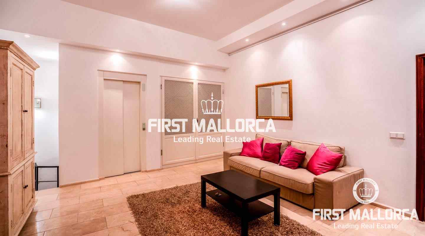La propiedad cuenta, además, con un apartamento para invitados en la planta baja, con 2 entradas independientes desde la calle y el patio, y directamente conectado con la vivienda por un ascensor privado. Desde allí se puede acceder a la zona wellness en el sótano, con sauna, jacuzzi y baño. La casa adosada se vende amueblado y dispone de aire acondicionado, calefacción por suelo radiante, suelos de piedra natural y doble acristalamiento. Por favor, póngase en contacto con nuestra oficina inmobiliaria de FIRST MALLORCA en Palma para obtener más información.