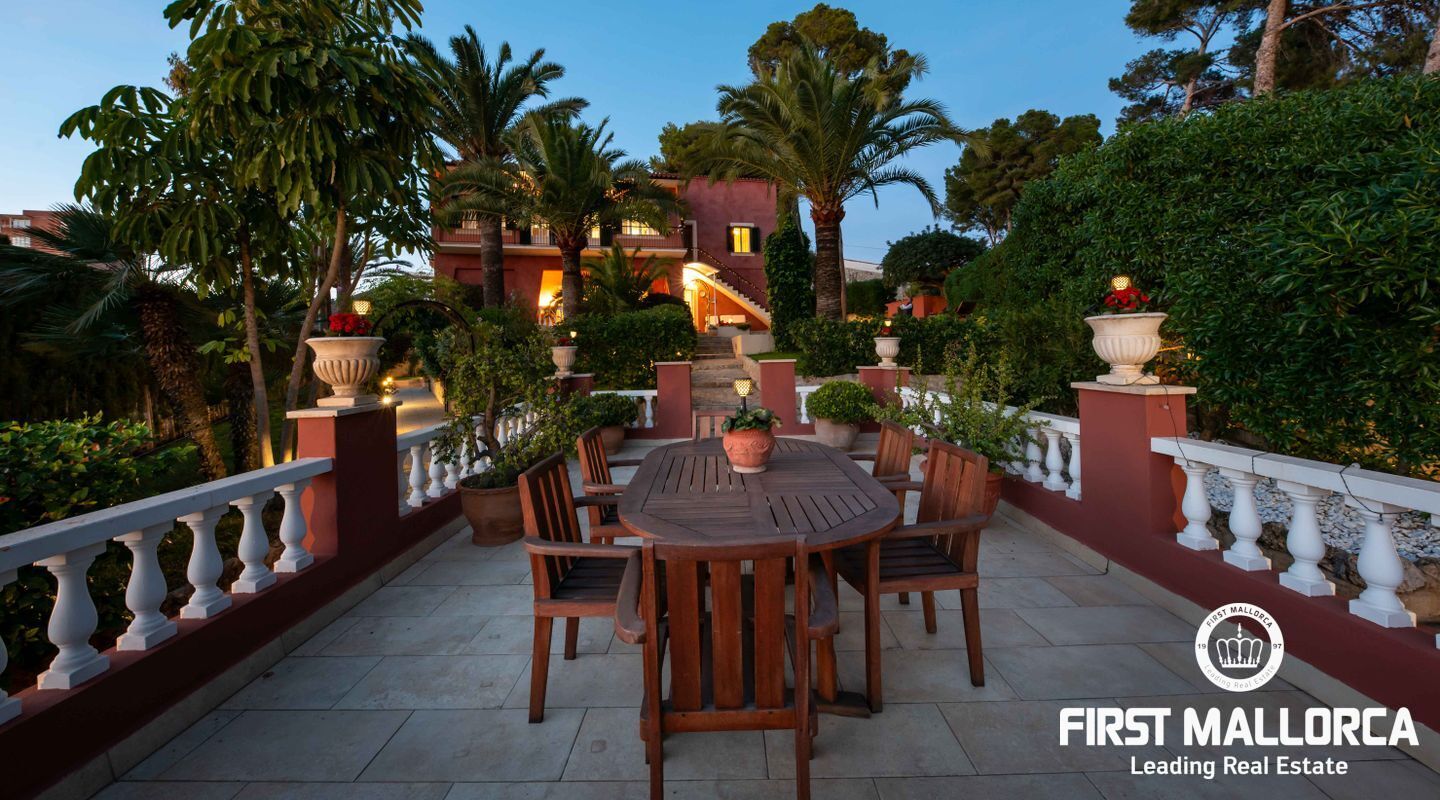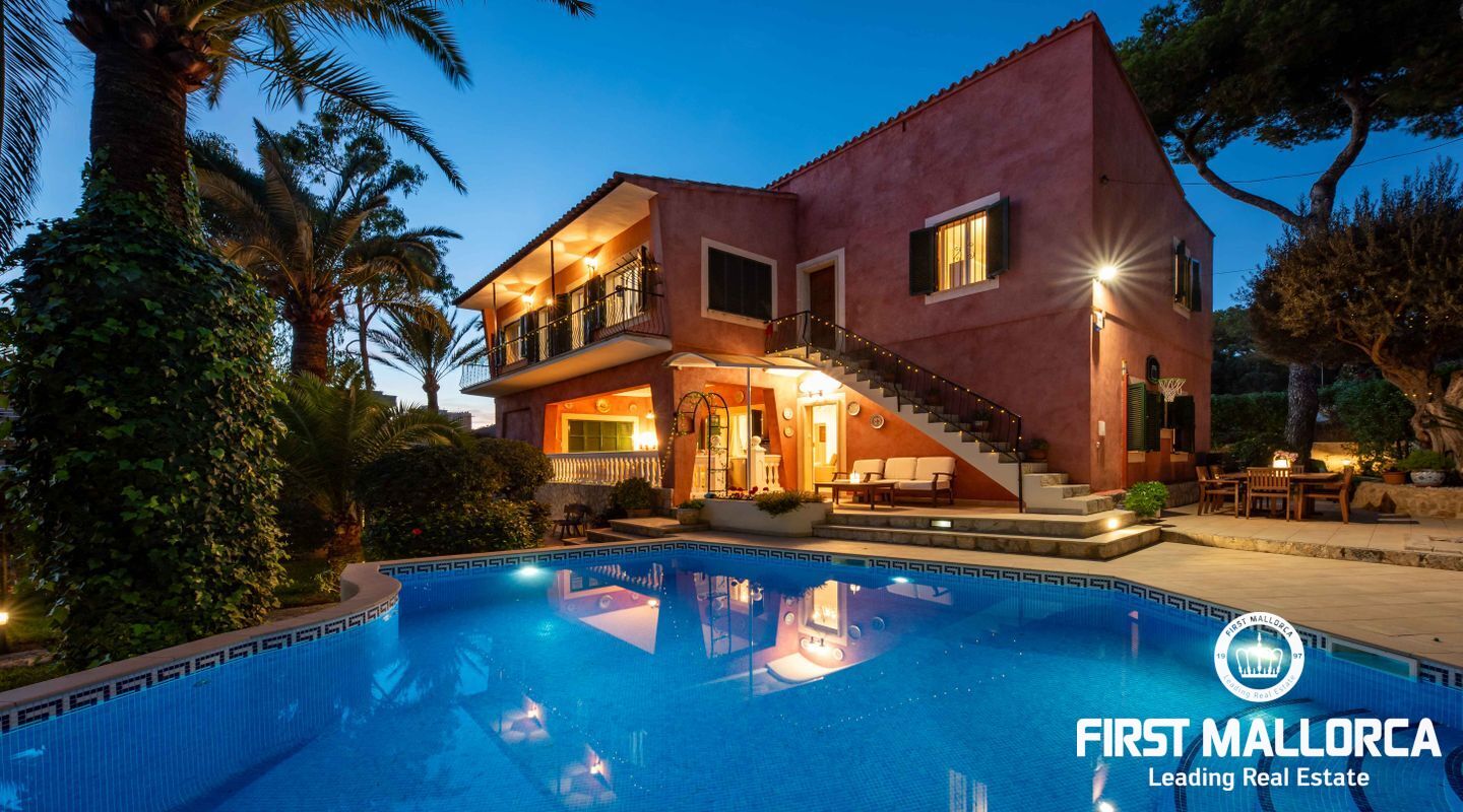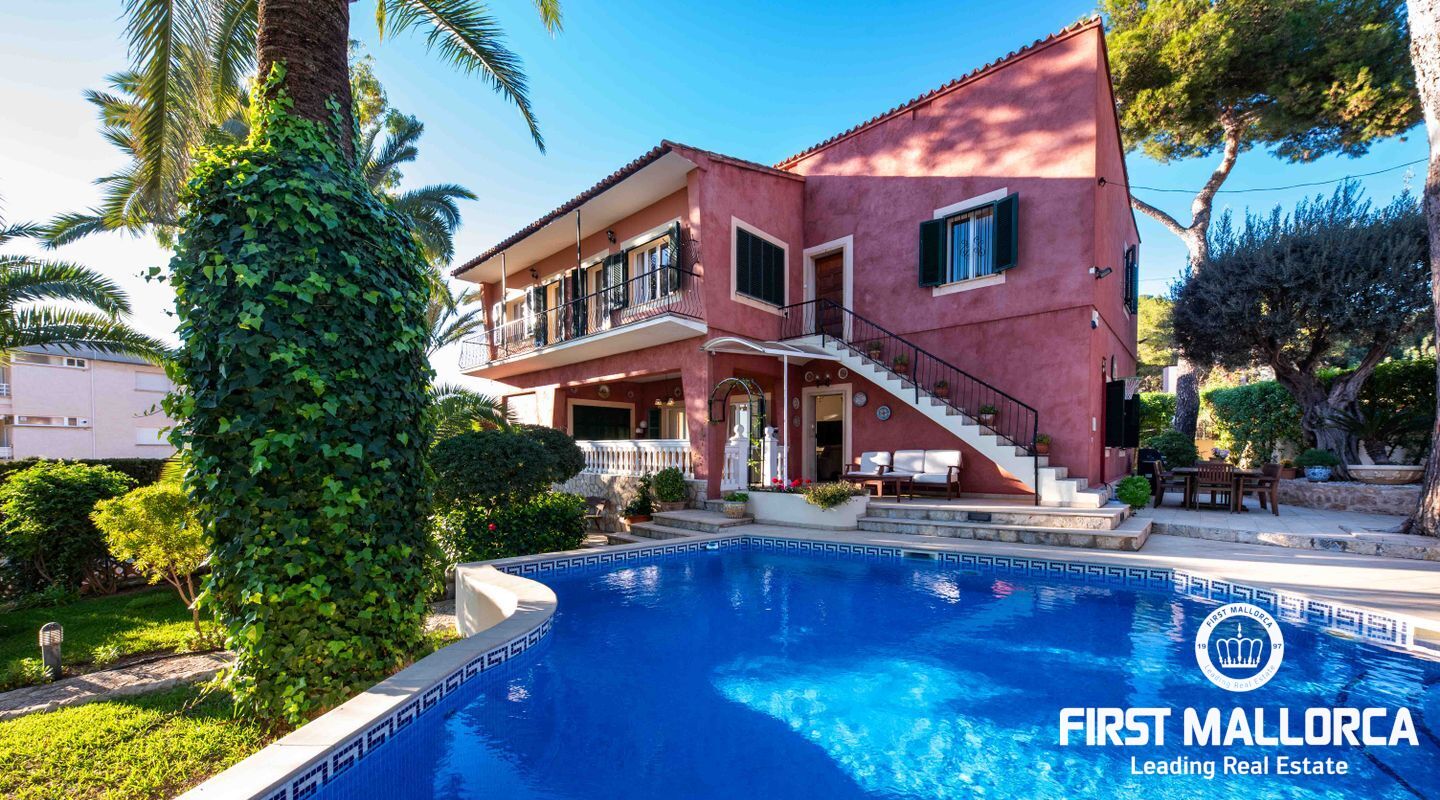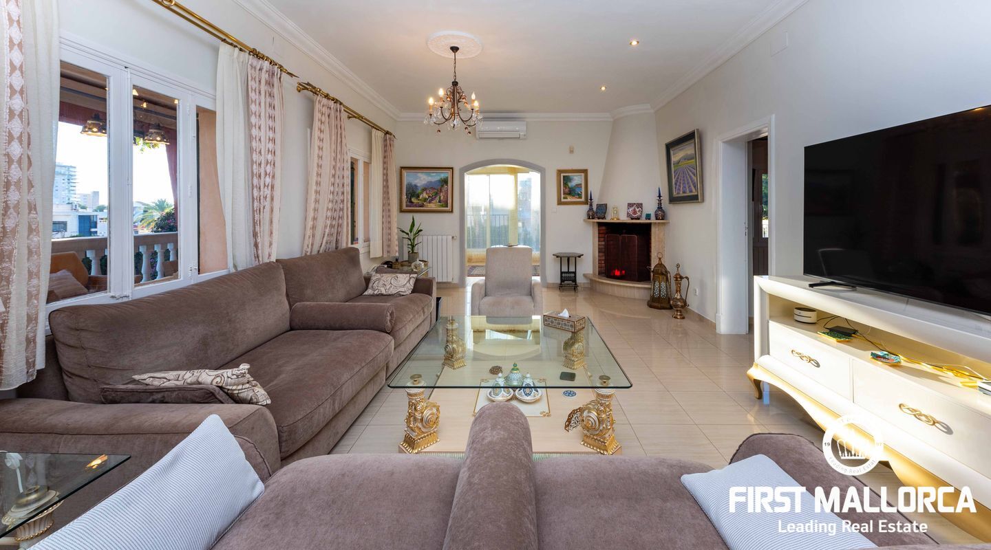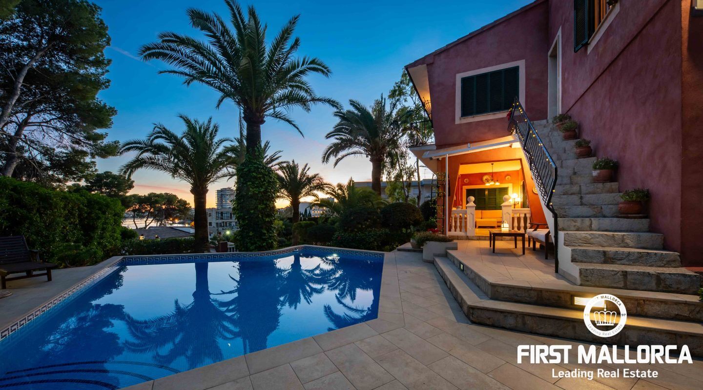 Preciosa villa con vista al mar y un bonito jardín con piscina en Palma Nova. La propiedad tiene una superficie construida de aproximadamente 582 m2 repartidos en 3 plantas. En el sótano encontramos un "apartamento" para invitados que tiene su acceso independiente con una cocina pequeña y un baño. La planta baja cuenta con un amplio y luminoso salón-comedor con chimenea, cocina y salida a la terraza con fácil acceso a la piscina y jardines mediterráneos con palmeras, árboles y plantas. En el mismo nivel también encontramos otro comedor, otro salón, 1 dormitorio y un aseo de invitados. Subiendo a la primera planta hay 4 dormitorios y 4 baños, uno de ellos es con baño en suite, y vestidor. También cuenta con coladuría y 2 salidas a unas escaleras exteriores que bajan hasta el jardín. La villa tiene aparcamiento y trastero. Esta propiedad impresiona especialmente por su ubicación céntrica y tranquila, la playa y el supermercado, tiendas, bares y restaurantes están a poca distancia y se puede llegar a Palma en coche en 10 minutos