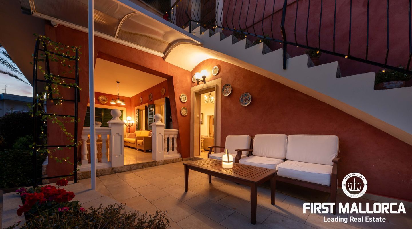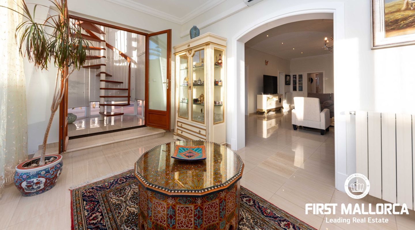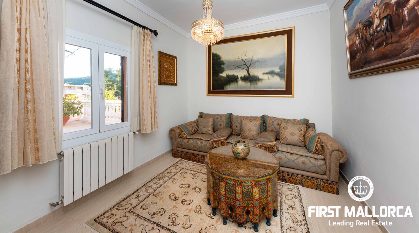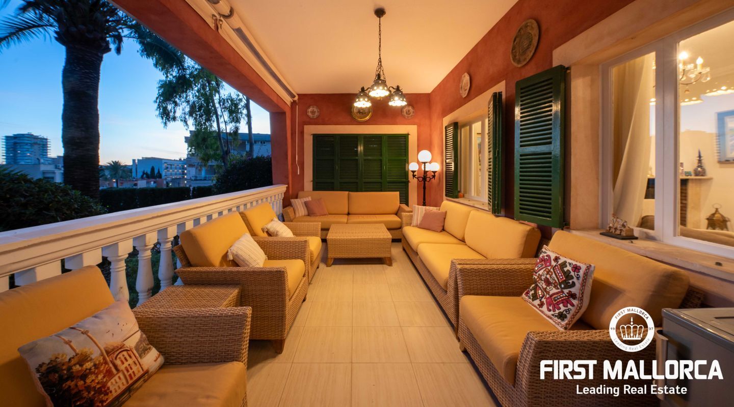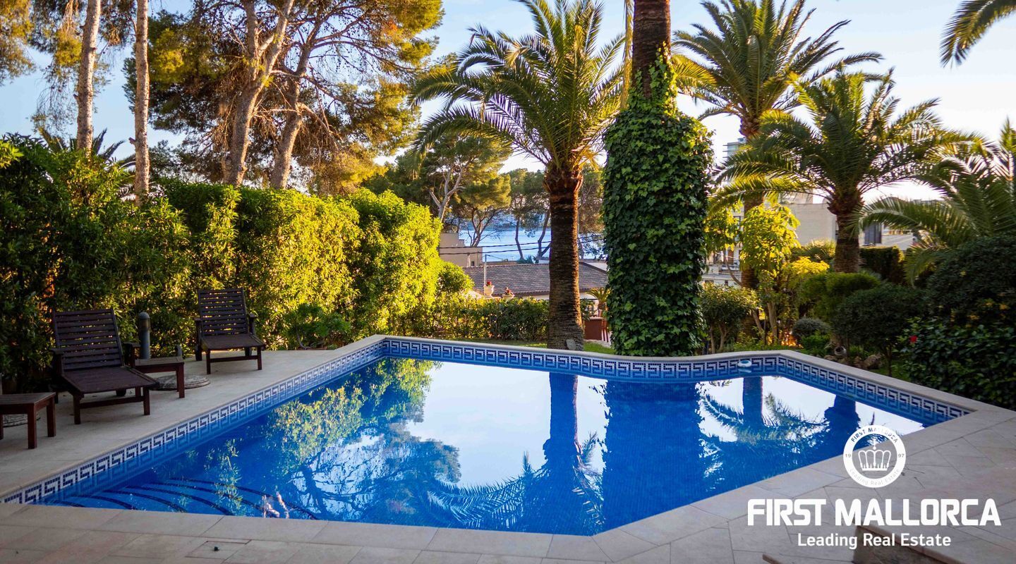 Preciosa villa con vista al mar y un bonito jardín con piscina en Palma Nova. La propiedad tiene una superficie construida de aproximadamente 582 m2 repartidos en 3 plantas. En el sótano encontramos un "apartamento" para invitados que tiene su acceso independiente con una cocina pequeña y un baño. La planta baja cuenta con un amplio y luminoso salón-comedor con chimenea, cocina y salida a la terraza con fácil acceso a la piscina y jardines mediterráneos con palmeras, árboles y plantas. En el mismo nivel también encontramos otro comedor, otro salón, 1 dormitorio y un aseo de invitados. Subiendo a la primera planta hay 4 dormitorios y 4 baños, uno de ellos es con baño en suite, y vestidor. También cuenta con coladuría y 2 salidas a unas escaleras exteriores que bajan hasta el jardín. La villa tiene aparcamiento y trastero. Esta propiedad impresiona especialmente por su ubicación céntrica y tranquila, la playa y el supermercado, tiendas, bares y restaurantes están a poca distancia y se puede llegar a Palma en coche en 10 minutos