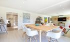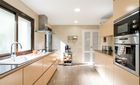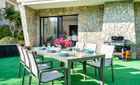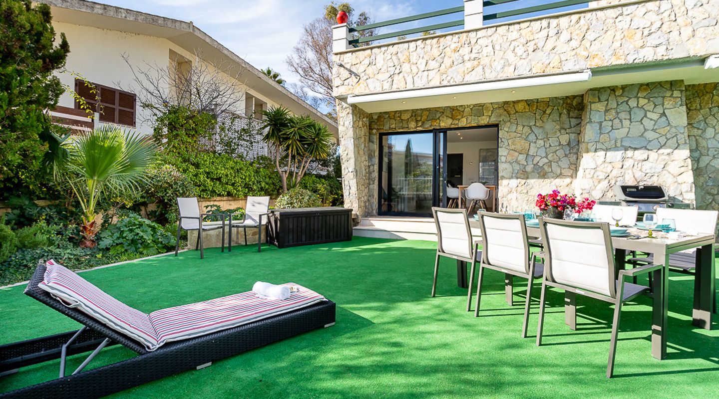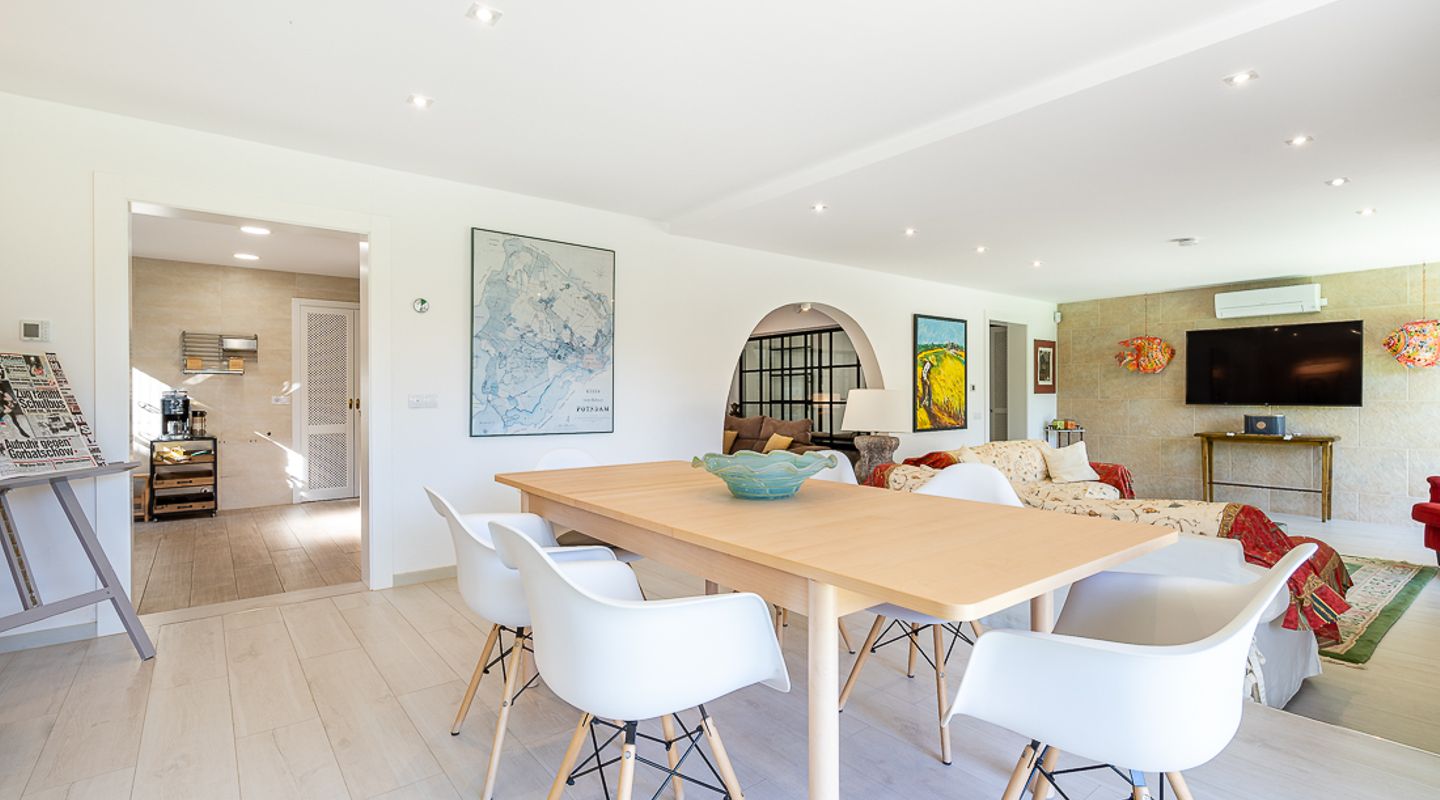 A la izquierda, un luminoso salón-comedor con grandes ventanales conecta directamente con el jardín delantero. Desde aquí se accede también al patio interior y a la cocina independiente, totalmente equipada.Confort y equipamientos