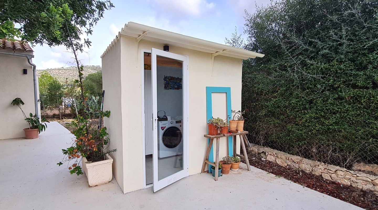 En el exterior se encuentra una caseta independiente en uso como lavandería, equipada con un aseo adicional. El terreno alberga también un antiguo depósito de agua que puede reformarse y un depósito en funcionamiento de 13.000 litros que abastece a la vivienda. La propiedad dispone de electricidad generada por placas solares con sistema de baterías de hasta 5 kW y cuenta además con un generador de gas de apoyo. La fosa séptica es completamente nueva y permite reciclar agua para el riego.