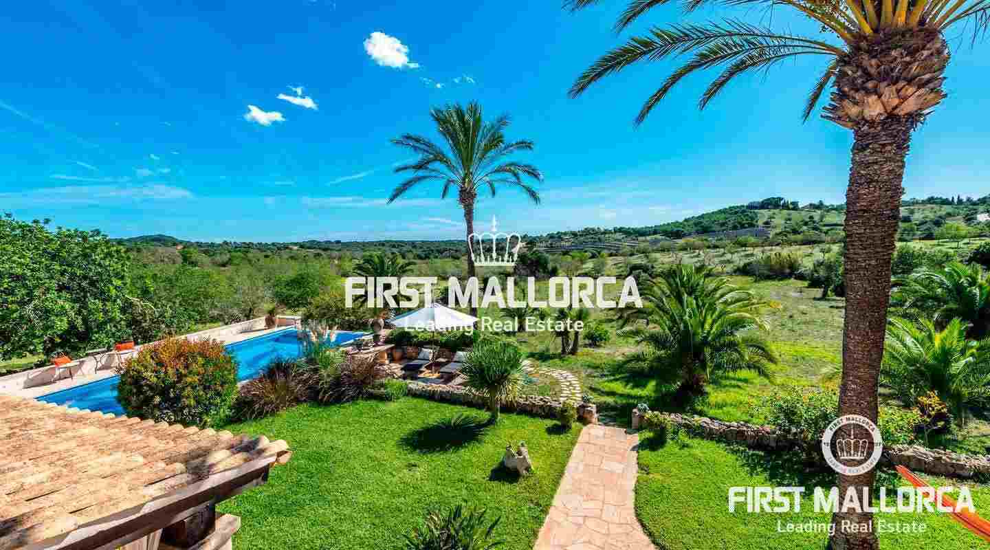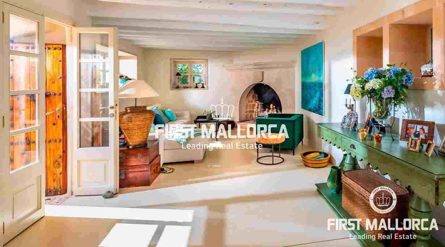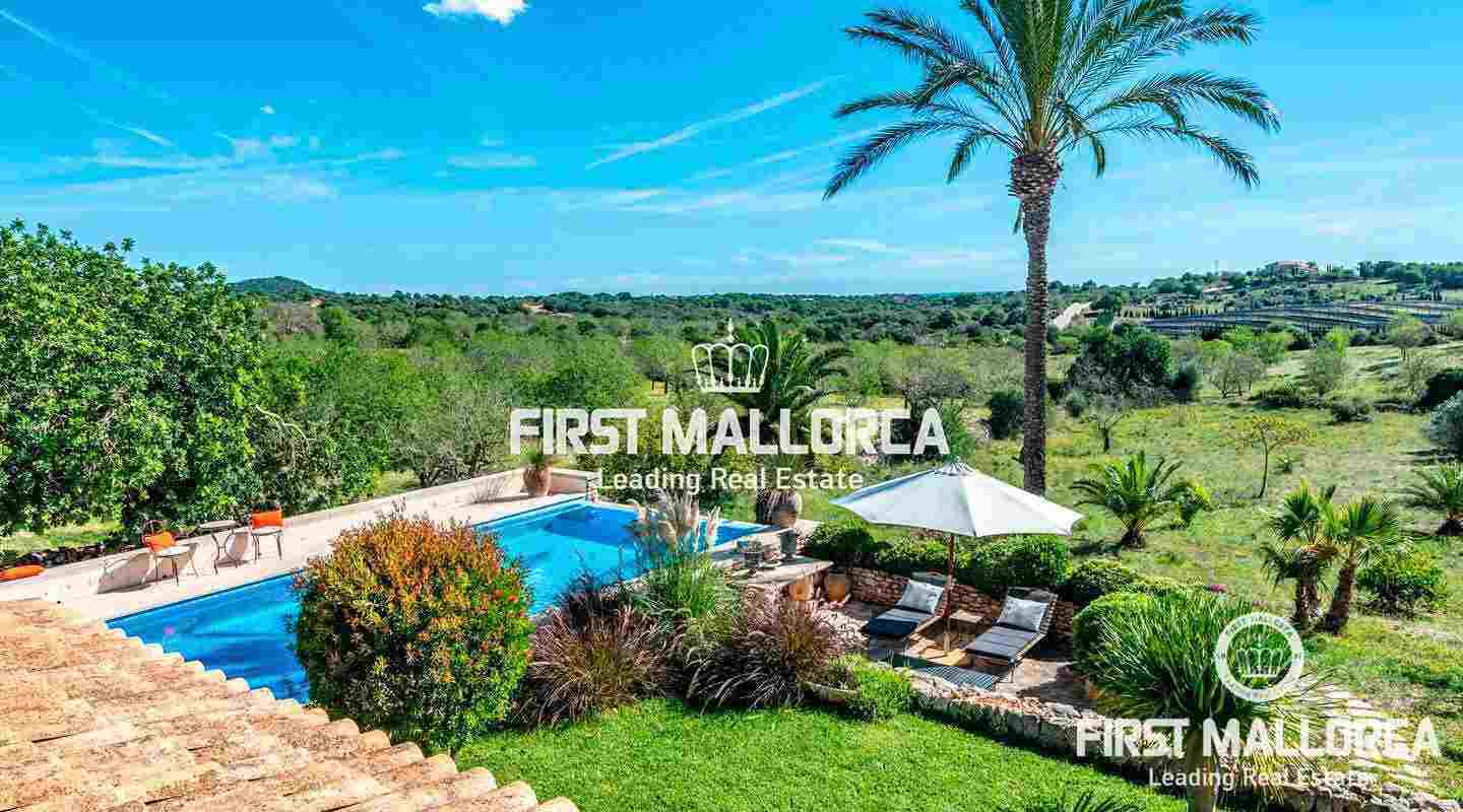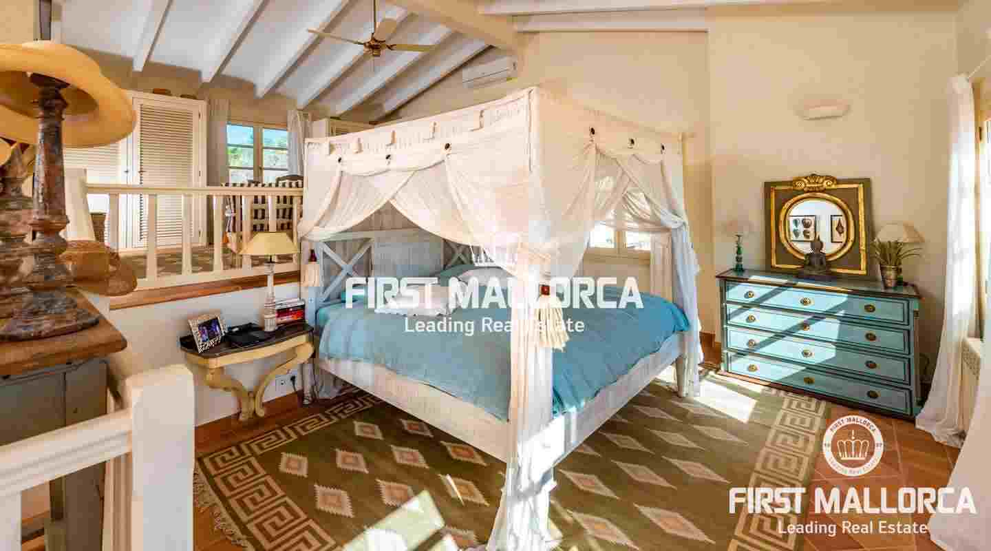 Esta hermosa y elegante finca con un solar de 8,000 m² está ubicada en las colinas cerca de S'Alqueria Blanca, gozando de impresionantes vistas panorámicas sobre el bucólico paisaje hasta el mar. La casa está rodeada por un precioso jardín con palmeras, ofreciendo mucha privacidad, y transmite el romántico ambiente mediterráneo.