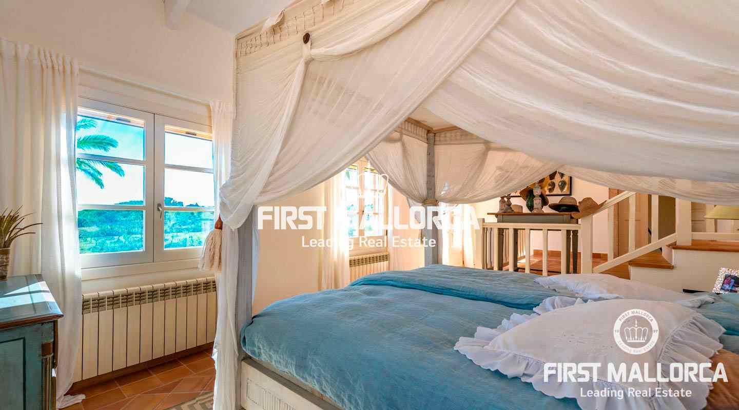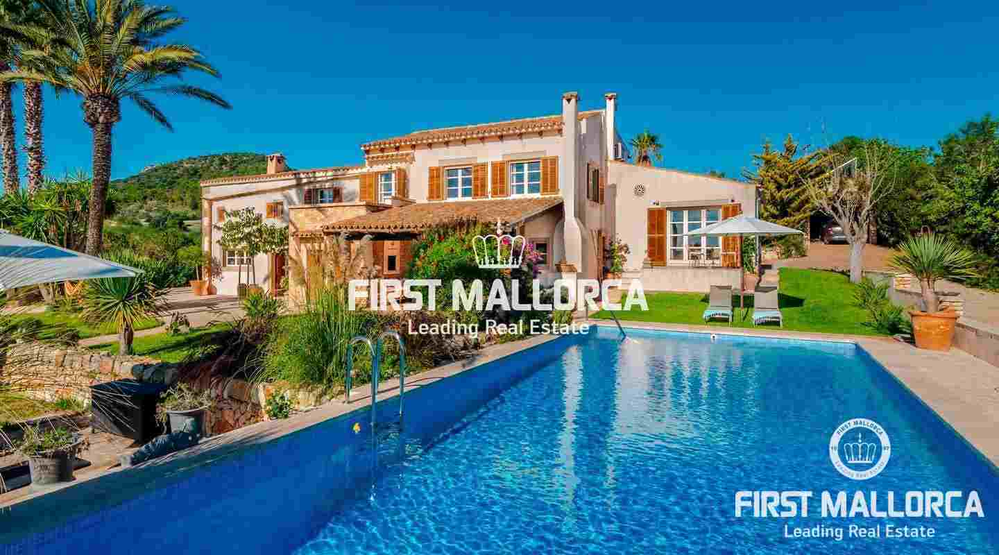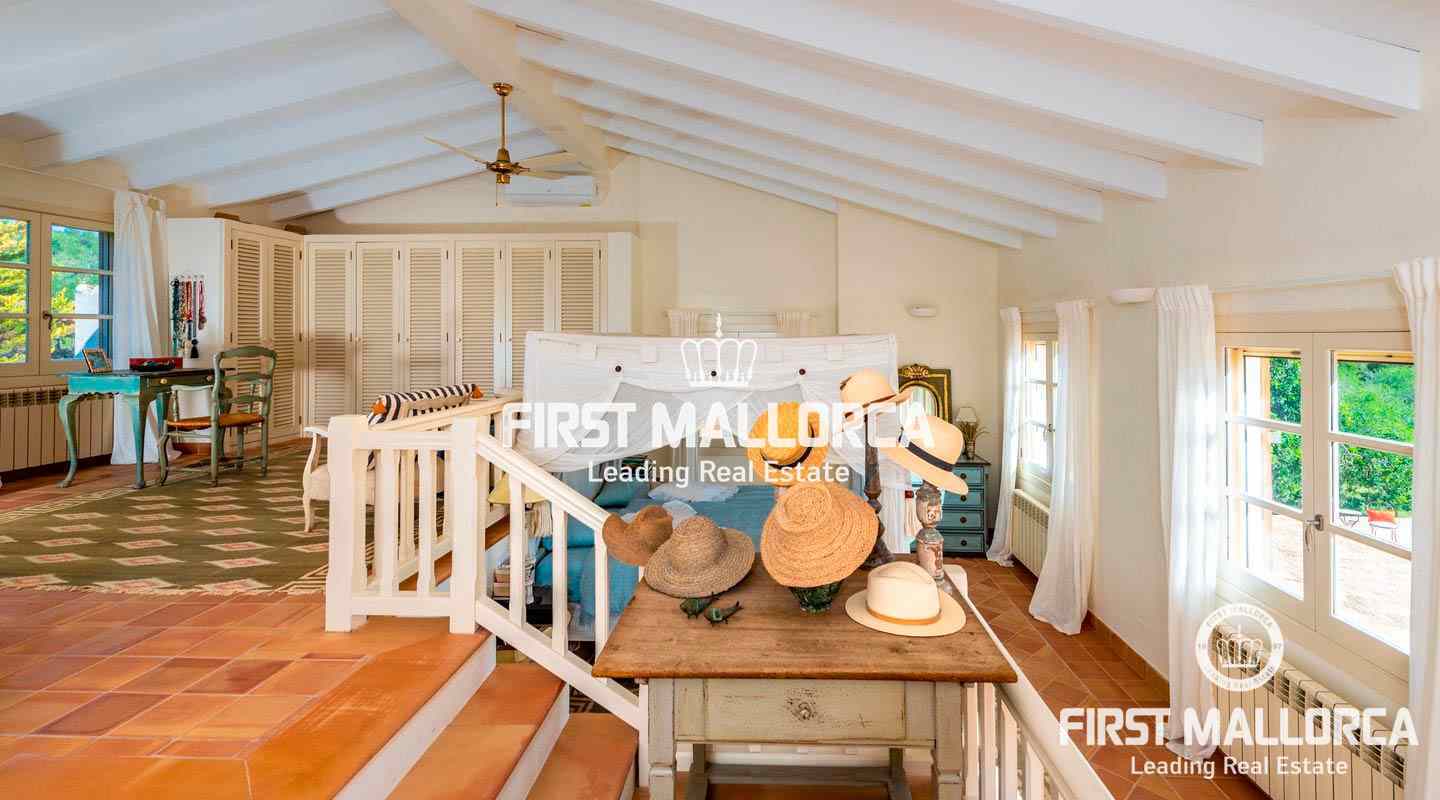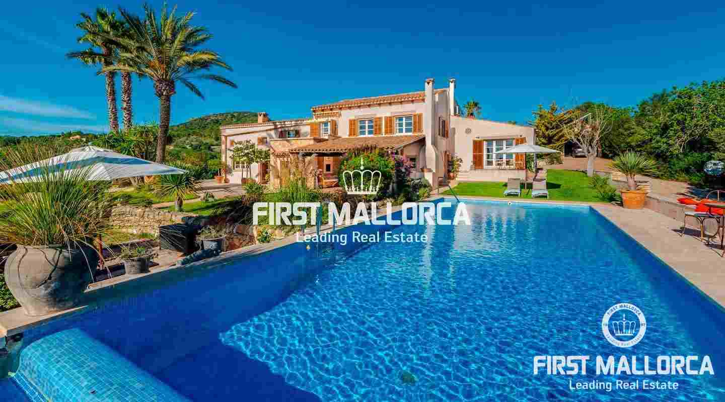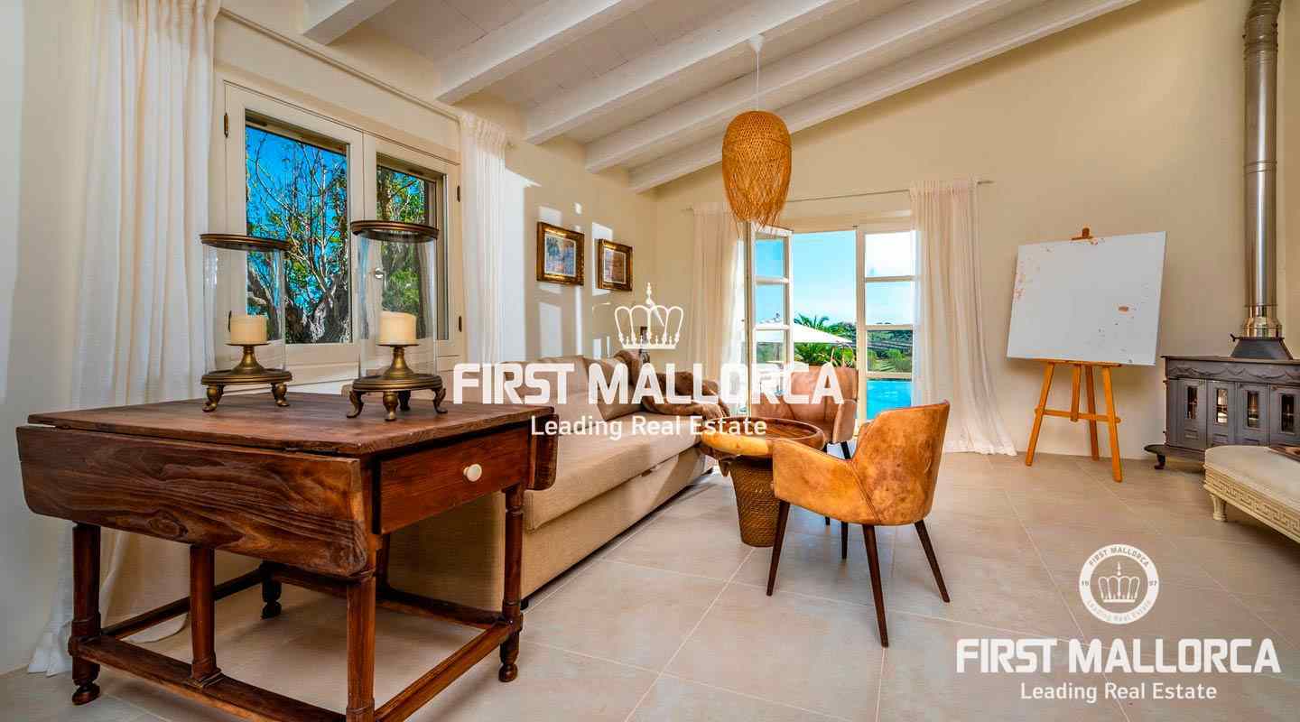 Esta hermosa y elegante finca con un solar de 8,000 m² está ubicada en las colinas cerca de S'Alqueria Blanca, gozando de impresionantes vistas panorámicas sobre el bucólico paisaje hasta el mar. La casa está rodeada por un precioso jardín con palmeras, ofreciendo mucha privacidad, y transmite el romántico ambiente mediterráneo.