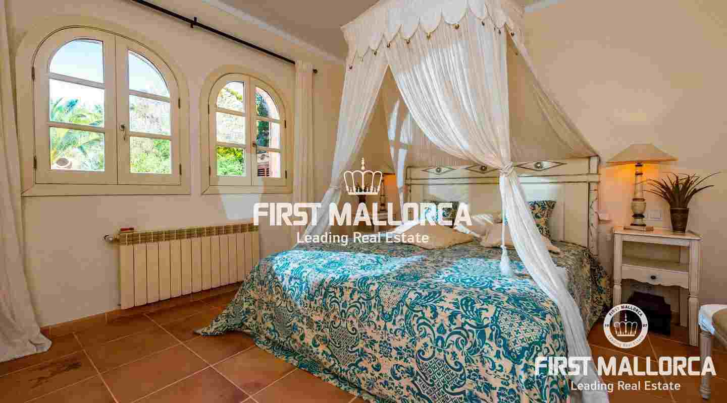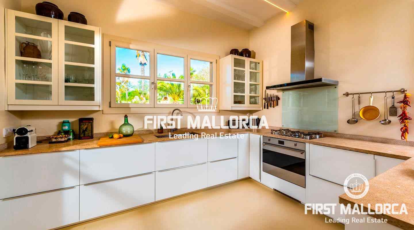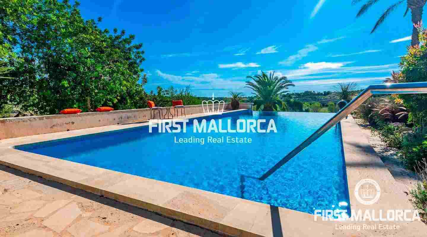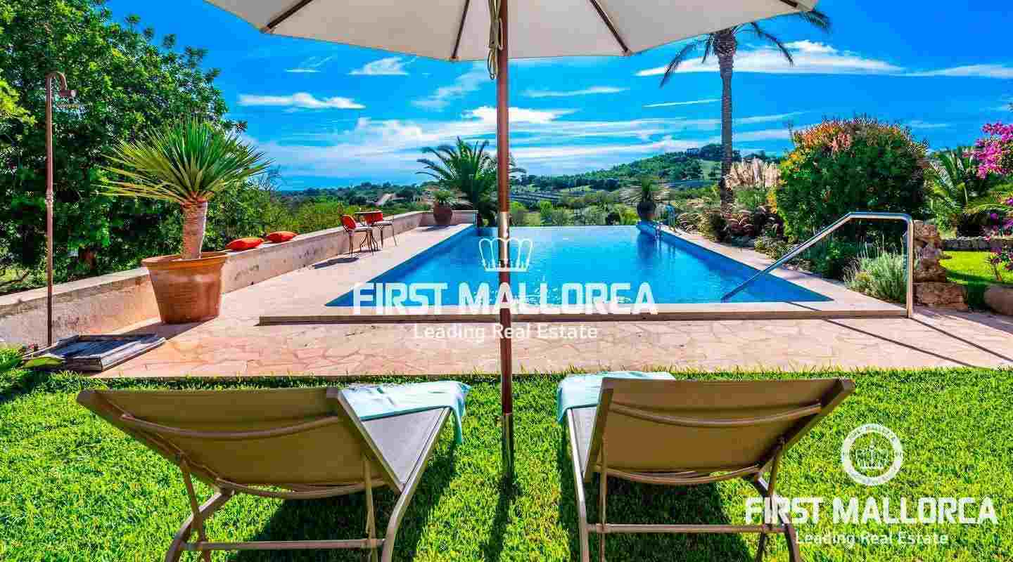Esta hermosa y elegante finca con un solar de 8,000 m² está ubicada en las colinas cerca de S'Alqueria Blanca, gozando de impresionantes vistas panorámicas sobre el bucólico paisaje hasta el mar. La casa está rodeada por un precioso jardín con palmeras, ofreciendo mucha privacidad, y transmite el romántico ambiente mediterráneo.