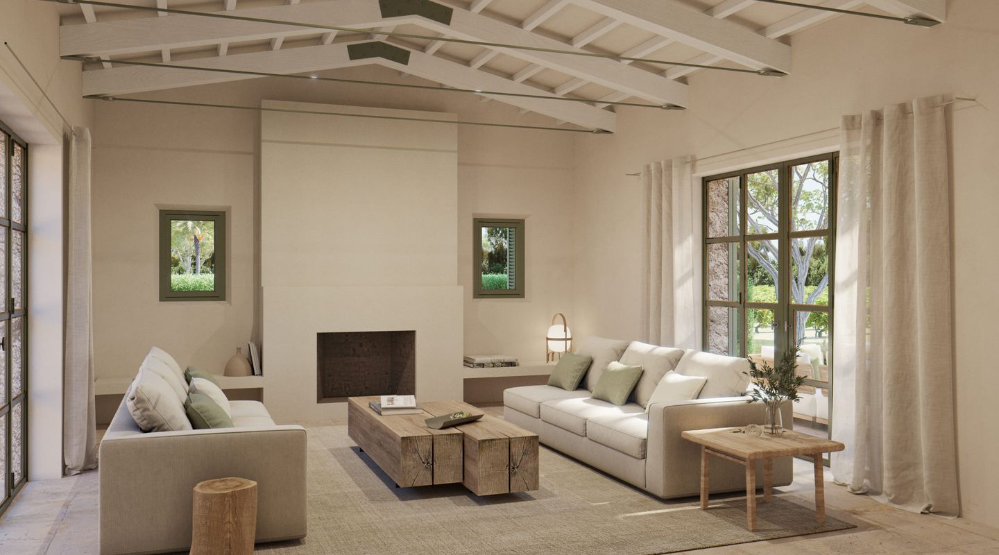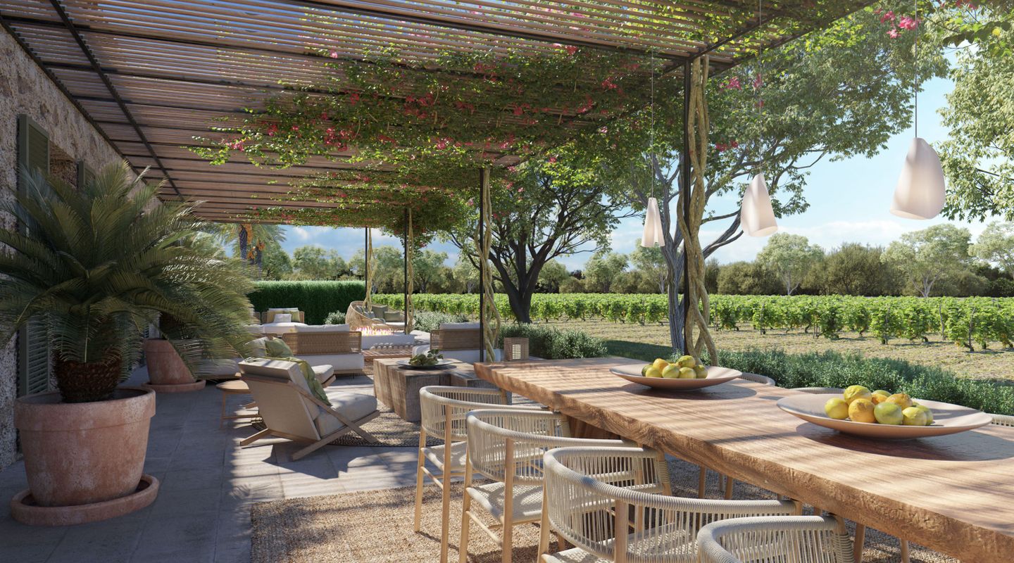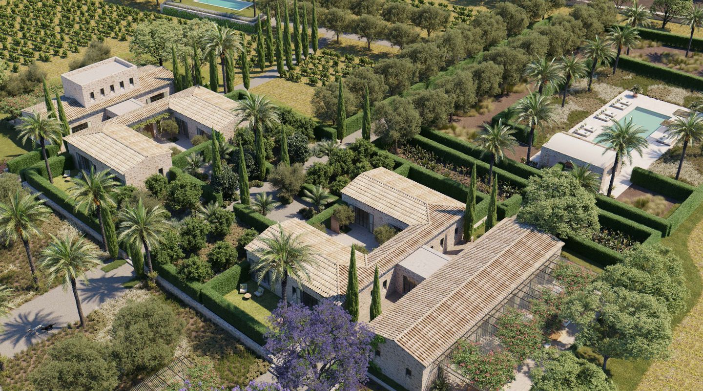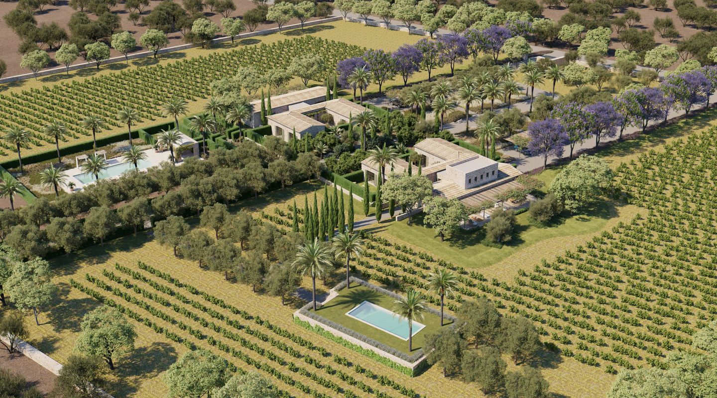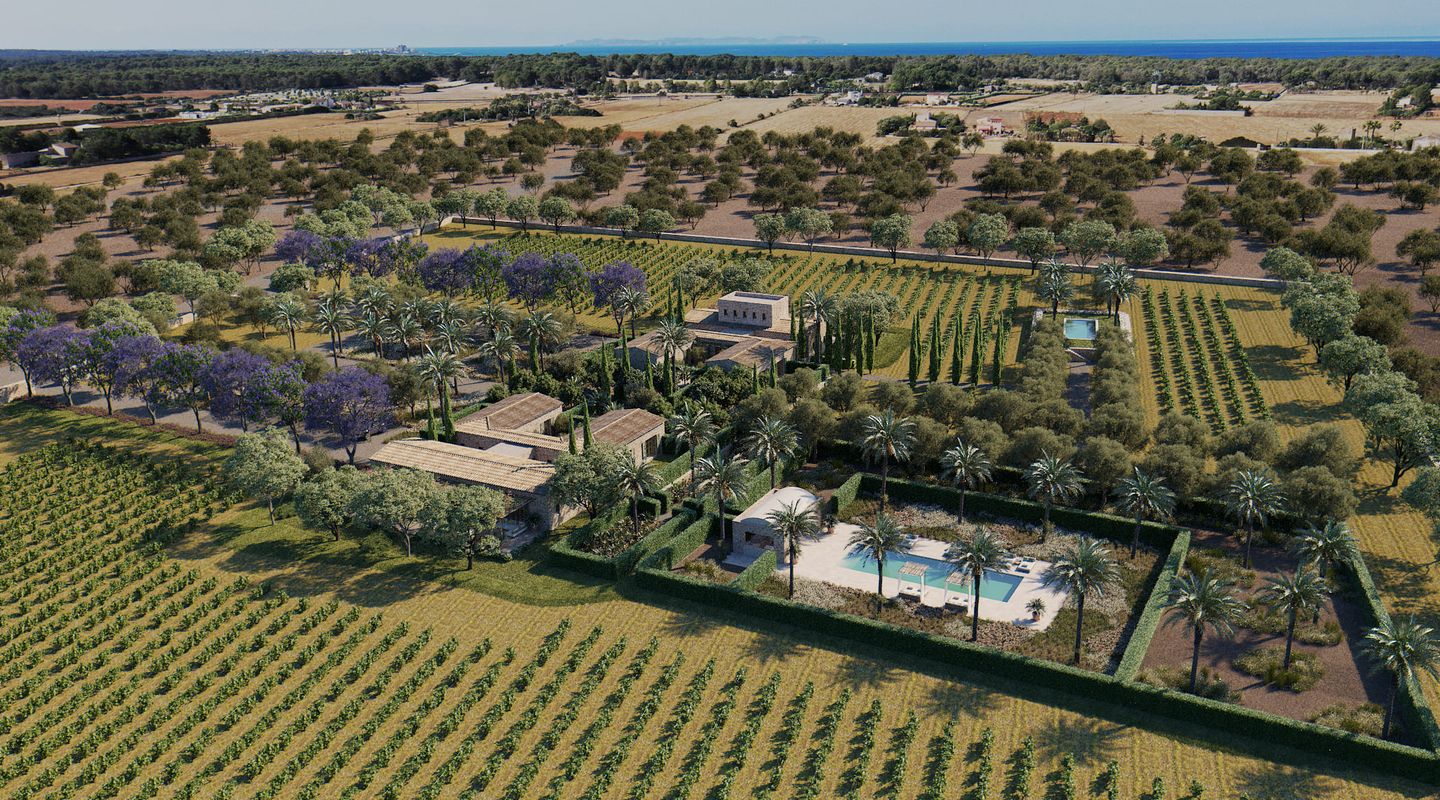 Situada en la parte sur de la isla de Mallorca, esta finca mallorquina rodeada de sus propios viñedos lleva la elegancia y la grandeza a nuevas cotas. La propiedad se encuentra a tan sólo 2 km de la increíble y paradisíaca playa de Es Trenc, detrás del parque natural protegido, y a sólo 35 minutos del aeropuerto. En el proyecto se ha defendido la utilización de materiales de construcción naturales y sostenibles, aquellos que además aportan calidez y humanidad: piedra, cal, madera, caña, etc. De dimensiones impresionantes, la casa de campo está segregada en dos edificios para uso como vivienda principal y zona de invitados, separados por un patio de elegancia atemporal con una fuente, con una parcela de 3,5 ha y un interior total de aprox. 1.100 m2. La propiedad dispone de siete dormitorios con baños en suite, dos cocinas (una de ellas profesional), bodega, cine, gimnasio y SPA. En la zona de ocio exterior, disfrutarás de una gran piscina con solárium y cocina exterior. El diseño arquitectónico rural combina detalles tradicionales como las contraventanas mediterráneas, la cubierta de teja árabe y los caminos de losas con sutiles y cálidos tonos pastel en las paredes. La abundancia de grandes ventanales, patios y terrazas adyacentes, algunos cubiertos y todos orientados en distintas direcciones, integra el exterior de la finca que cuenta con un impresionante proyecto de paisajismo, incluyendo una amplia zona de viñedos propios, palmeras, olivos y todo tipo de vegetación que hará de esta finca una auténtica joya mediterránea. La finca cuenta con 1,6 hectáreas de viñedos de tipo Merlot que, si es gusto del comprador, podrá participar en el proyecto desarrollado por las fincas contiguas para la producción de un vino conjunto, mezclando los diferentes tipos de uvas para dos usos: comercialización en pequeña escala o consumo propio. En línea a este proyecto la casa cuenta con una impresionante bodega de diseño que contará por un lado, con una cava con capacidad para 1.000 botellas con un espacio donde catar vinos y, por otro, con un gran comedor donde disfrutar de comidas y cenas. Si es su deseo estrenar esta impresionante y única propiedad no dude en ponerse en contacto con el equipo de ventas de First Mallorca.